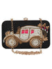 This faux silk embroidered clutch is beautifuly hand-crafted with a pearl embellished car design. It has one main compartment with clasp closure and a detachable metal chain. Can also be used as a sling bag
