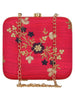 This hand-crafted faux silk square box clutch with floral embroidered work is perfect for your party or ethnic collection. It has one main compartment with casp closure and a detachable metal chain. Can aslo be used as a sling bag.