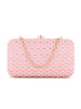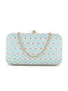 Steal the spotlight with this Box Clutch from the Hue collection. It features a Polka Dot Embroidered pattern on Faux Silk fabric. Has a Detachable Shoulder strap secured with a Click closure.