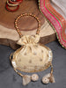Potli from Droop collection. This Embellished Potli is crafted with the best Faux Silk fabric and features a Polka Embroidered pattern decorated with Tassels. The sturdy and detachable wrist loop will make sure you are never worried about it breaking apart. Secured with a drawstring closure, you will find this Potli quite spacious to hold a phone, makeup, keys, and other essentials. Dimensions (LxHxW): 21 x 21 x 2 cm