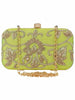 Hand crafted designer box clutch with zari embroidery work. It has one main compartment with clasp closure and a detachable metal chain. Can also be used as a sling.