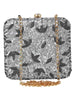 Hand crafted designer box clutch with sequines work. It has one main compartment with clasp closure and a detachable metal chain. Can also be used as a sling.