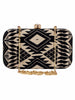 Hand crafted designer box clutch with geometric jacquard fabric. It has one main compartment with clasp closure and a detachable metal chain. Can also be used as a sling.