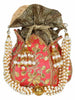 This hand-crafted designer potli with embellished work has one main compartment. It has a drawstring closure and a detachable Pearl Handle.