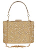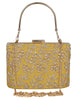 This Hand-crafted faux silk box clutch with Golden floral and leaf embellished work has one main compartment with clasp closure. It has a detachable wrist loop as well as a metal chain. Can be used both as a hand purse or a sling bag.
