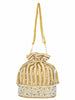 This designer faux silk potli with sequines embellished work is perfect match for party and ethnic collection. It has one main compartment with drawstring closure and a detachable wrist loop.