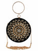 This hand-crafted velvet embroidered round bracelet clutch with designer embellished work has one main compartment with clasp closure. It has a wrist loop ring as well as a detachable metal chain. Can be used both as a hand purse or a sling bag.