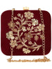 This designer hand-crafted velvet square box clutch is embellished with floral sequines work. It has one main compartment with clasp closure and a detachable metal chain. Can also be used as a sling bag.