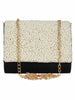 This velvet foldover clutch embellished with pearls has one main compartment with a magnetic button closure and a detachable metal chian. Can also be used as a sling bag.
