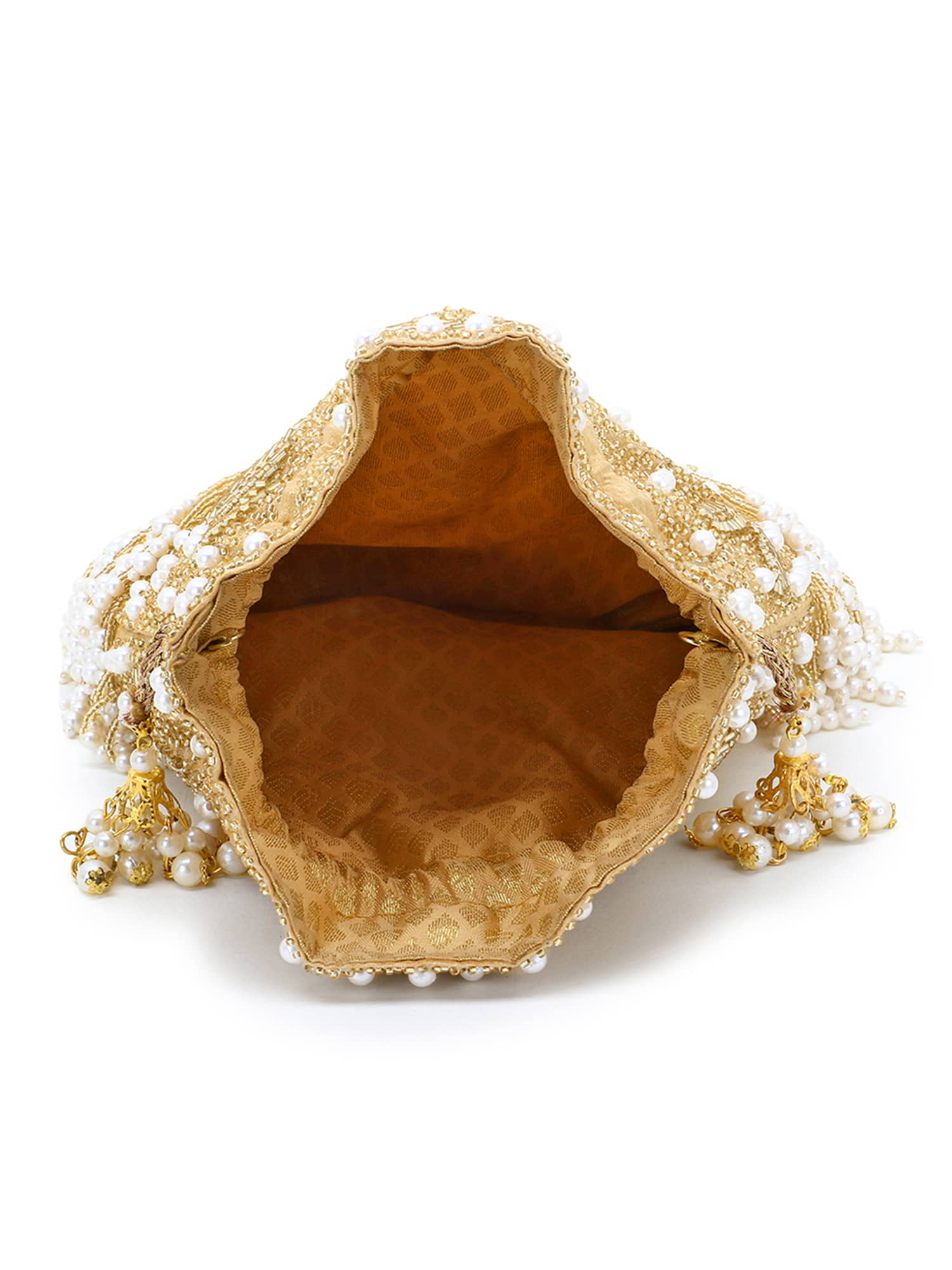 A must have Embellished Bead Work Potli from Anekaant's Glitz collection that will go great with your outfits. This Gold & White Faux Silk Potli adds glamour to your evening look and makes you stand-out in the crowd. The sturdy Potli and Detachable Pearl Handle will make sure you are never worried of it breaking apart. Secured with a Drawstring closure, you will find this Potli quite spacious to hold a phone, makeup, keys and a small pouch.