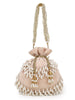 A must have Pearl Embellished Potli from Anekaant's Dangle collection. This Peach & Off White Velvet Potli comes with a sturdy Detachable Wrist loop. It has 1 main compartment secured with a Drawstring closure.