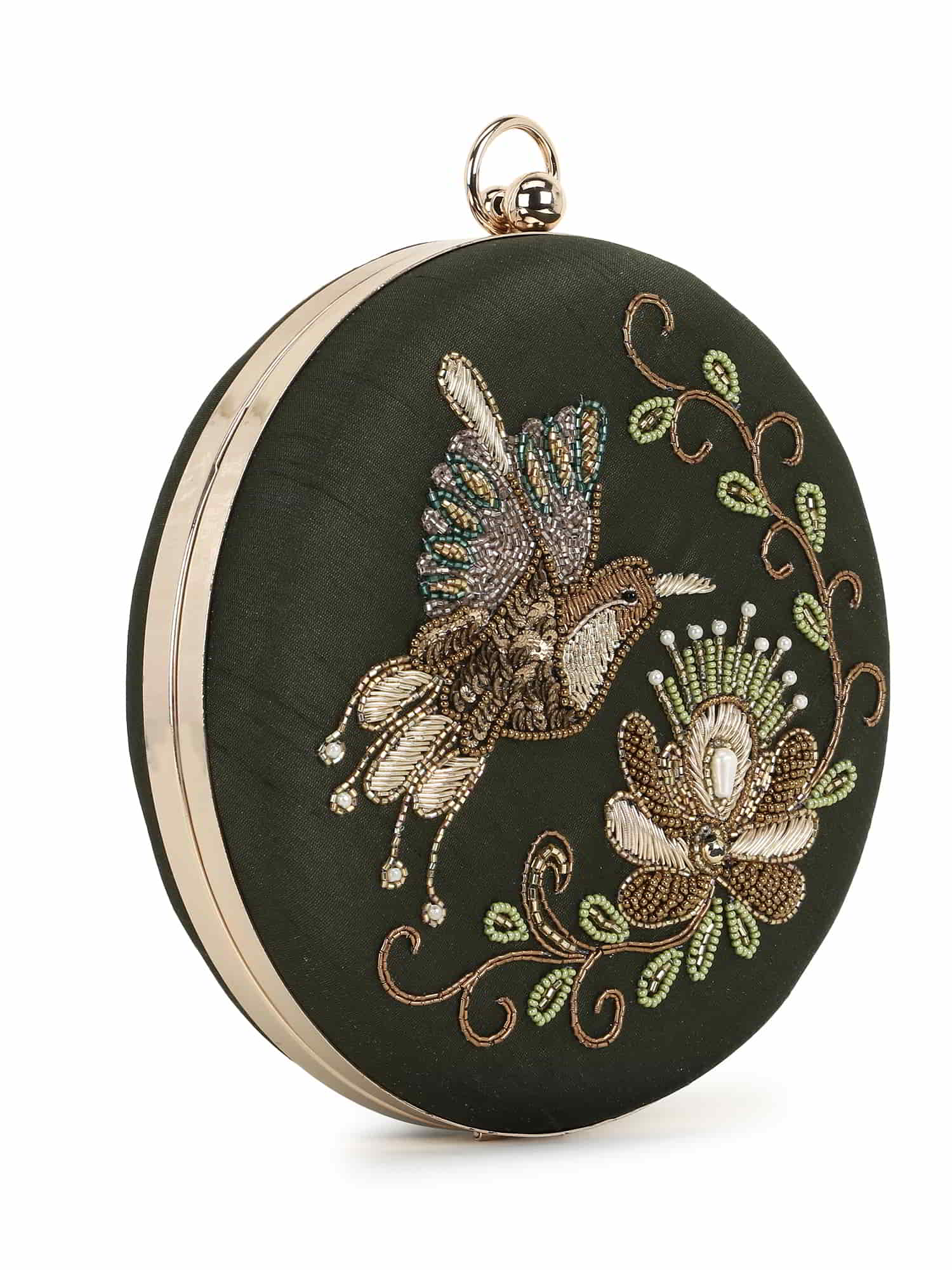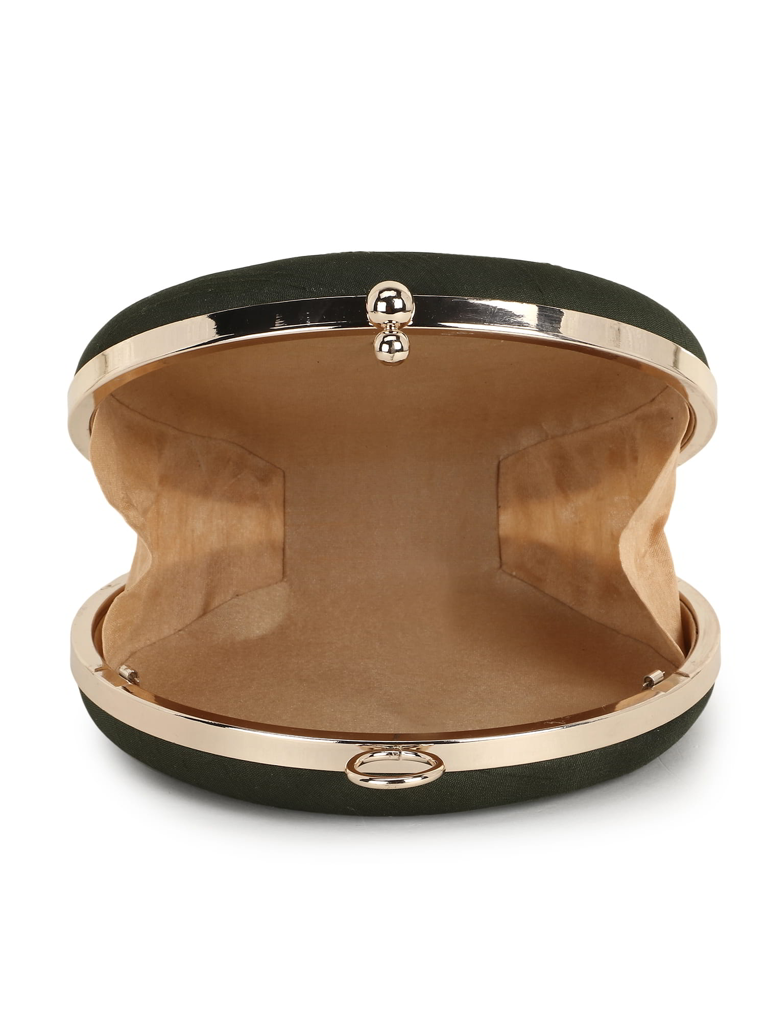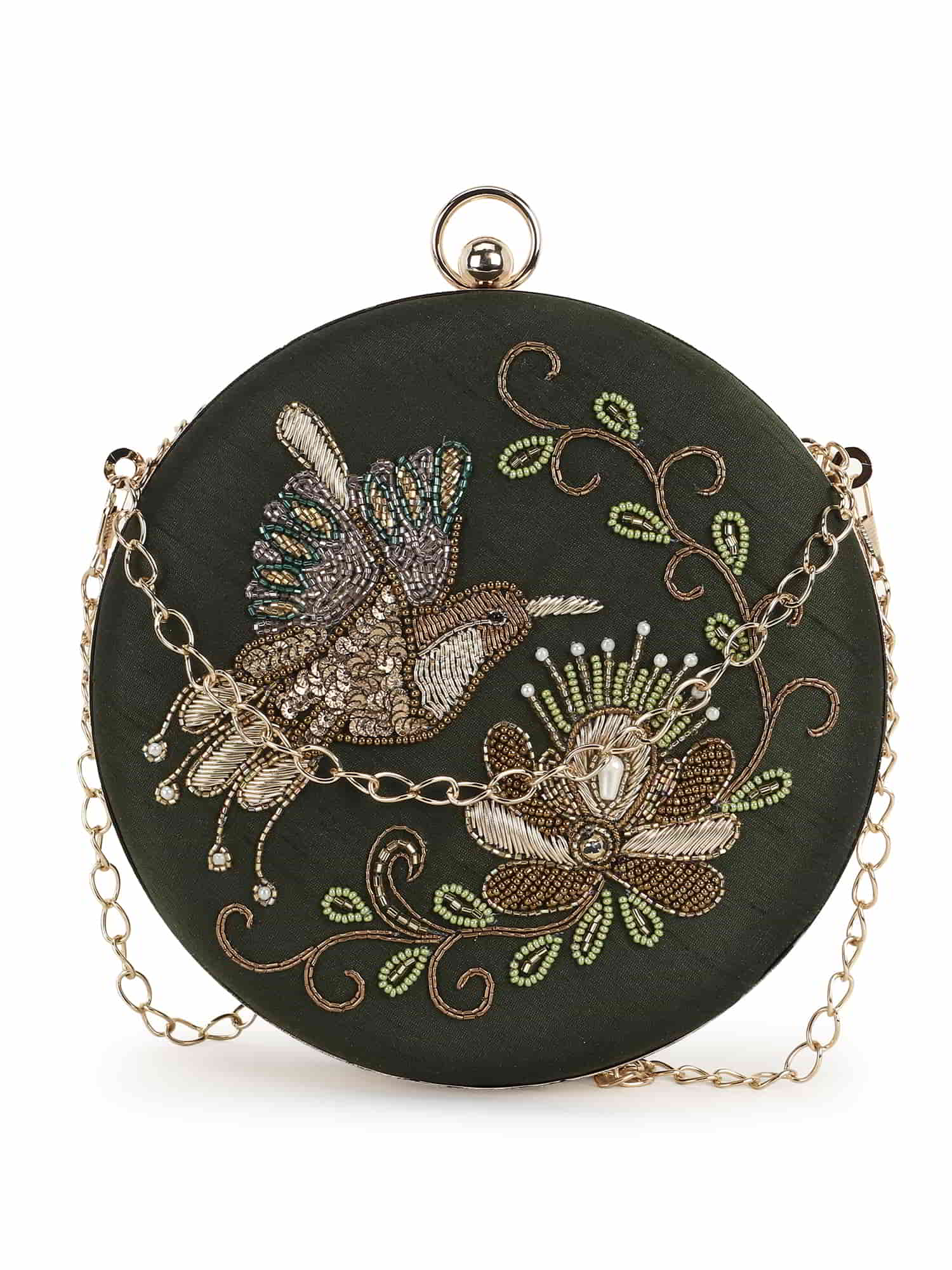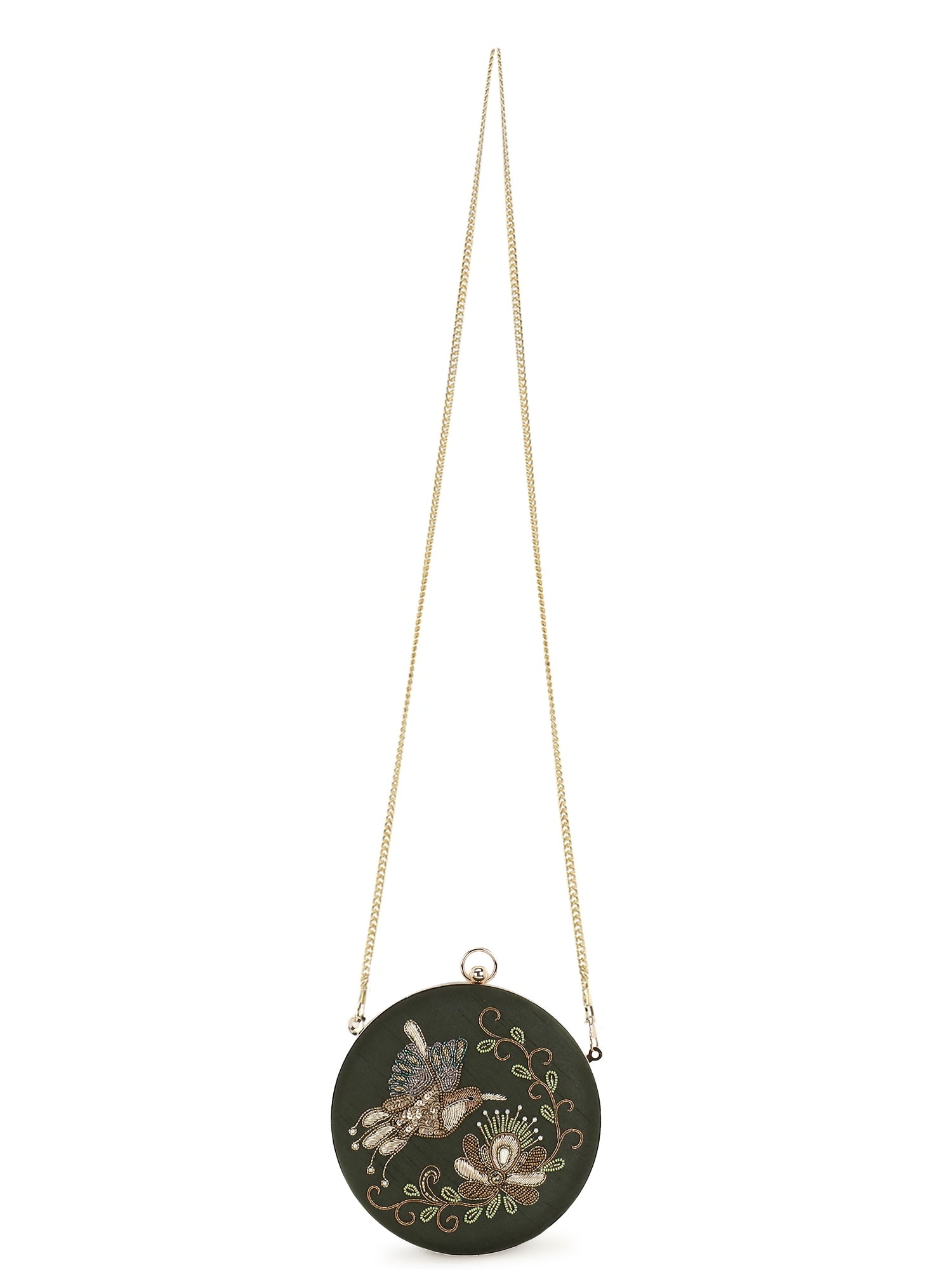 A must have Quirky Embellished Clutch from Anekaant's Gala collection. This Mehandi Green & Multi Faux Silk Clutch comes with a sturdy Detachable Shoulder Strap. It has 1 main compartment secured with a Click closure.
