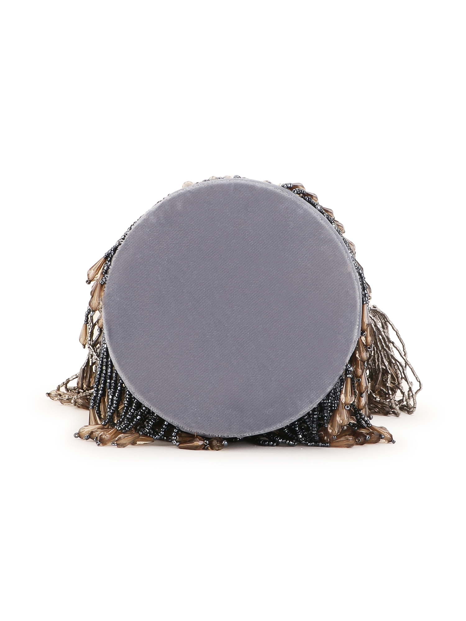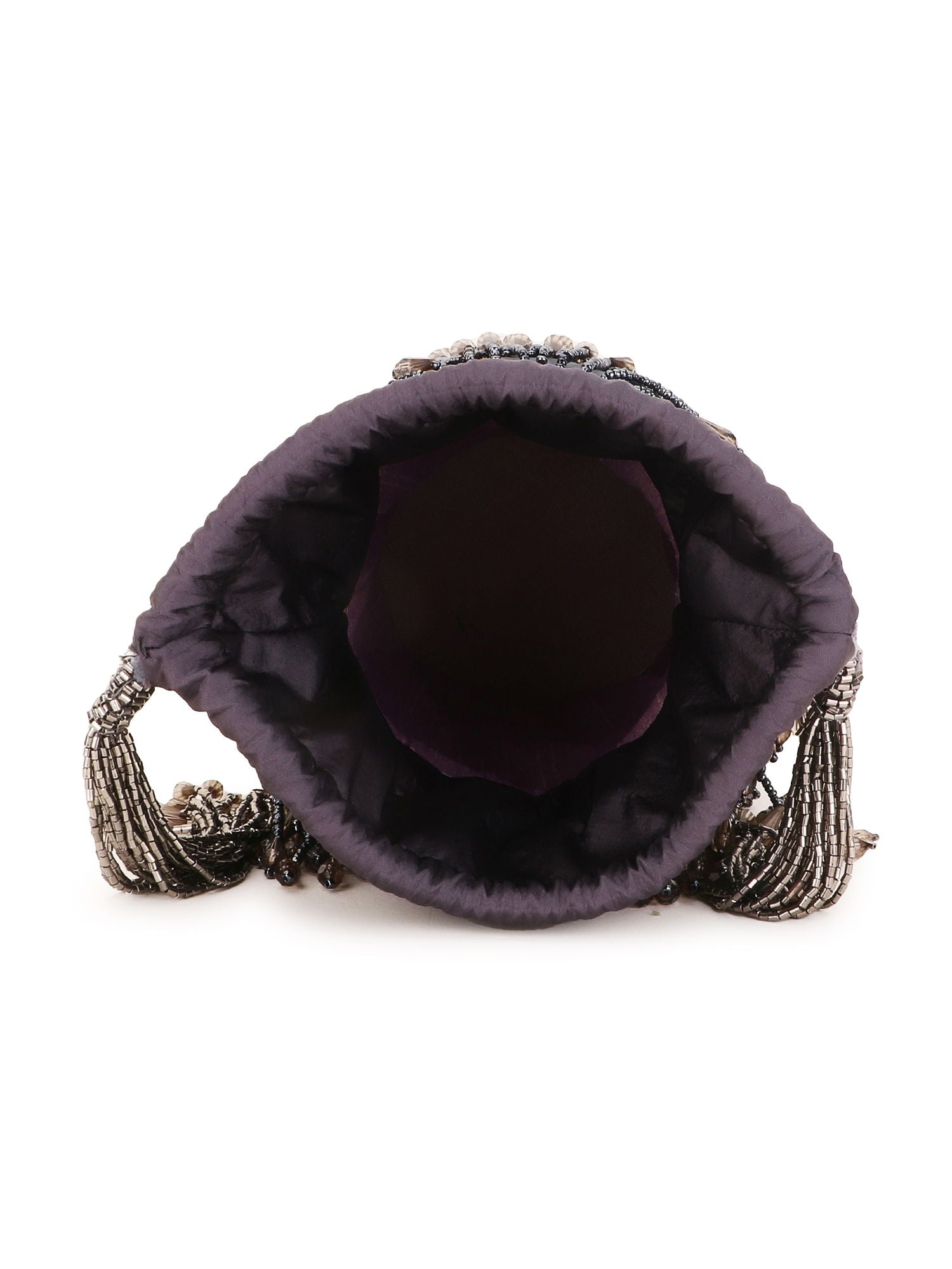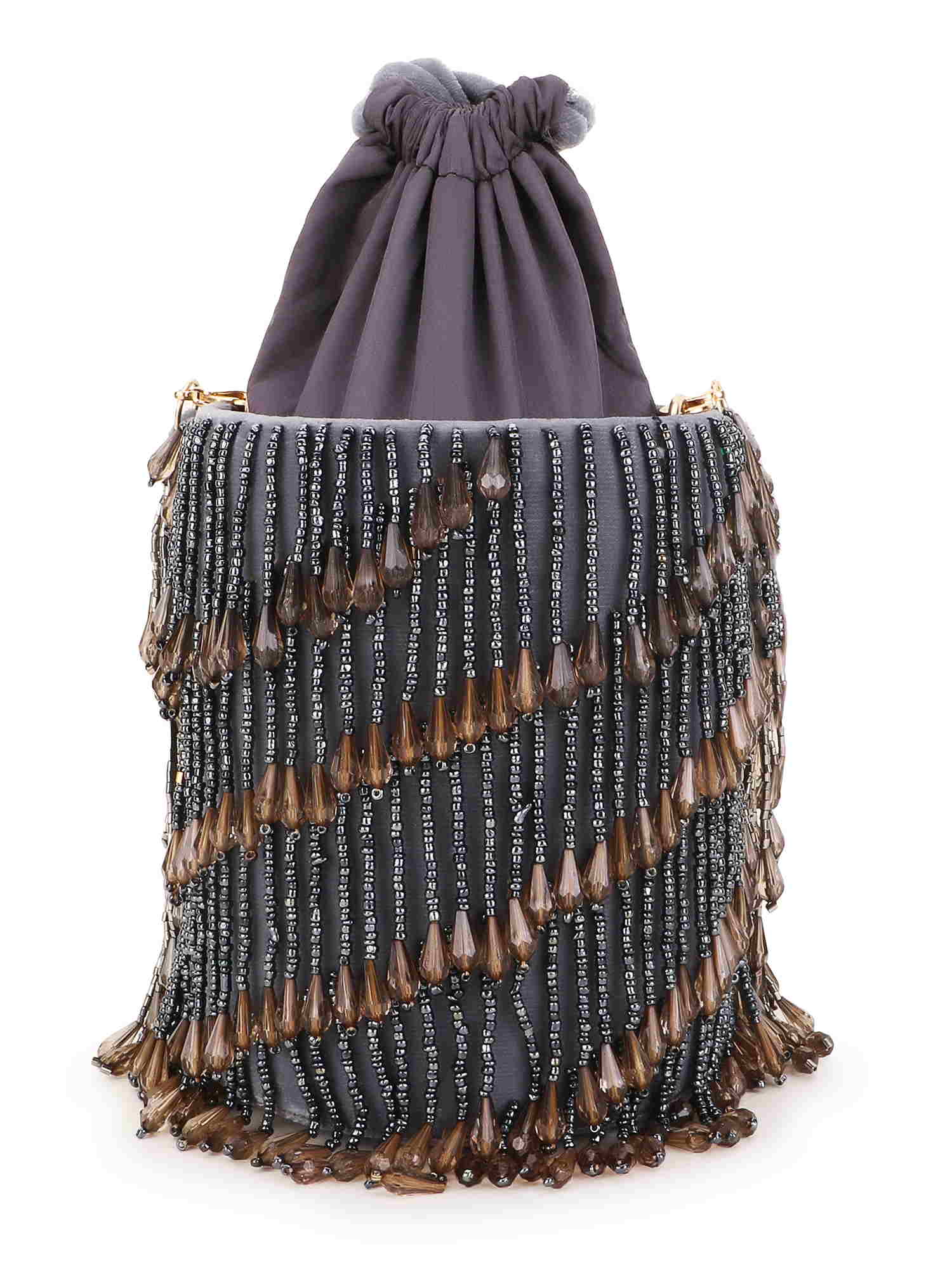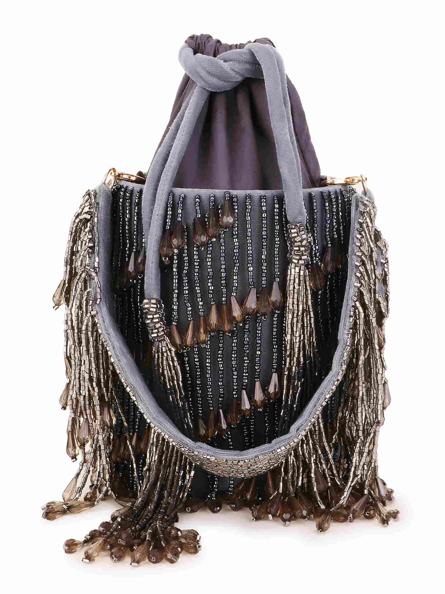 Step out donning this stunning Potli from latest Dangle Collection. This Potli comes with a spacious main compartment secured with a Drawstring closure. It features a Striped Embellished Pattern on Satin fabric and comes with a Detachable Wrist loop decorated with Tassels.
