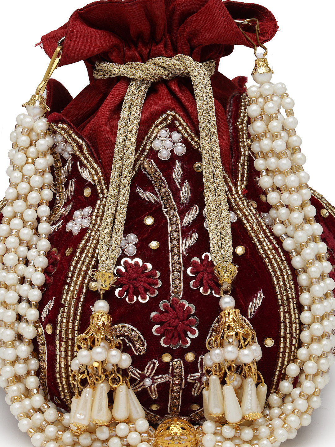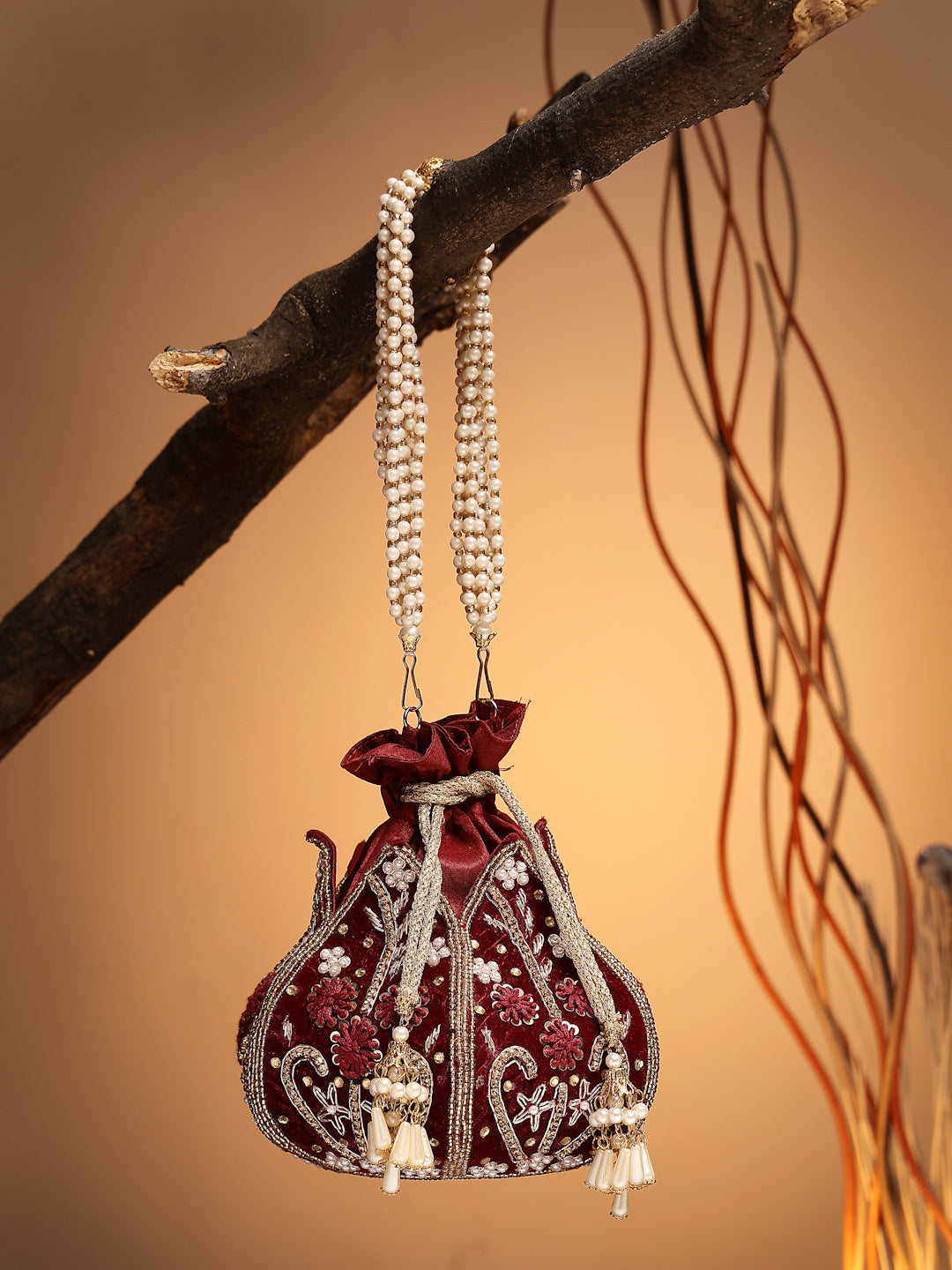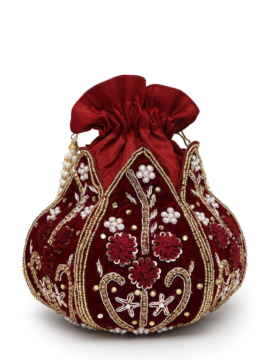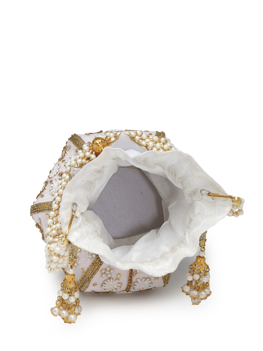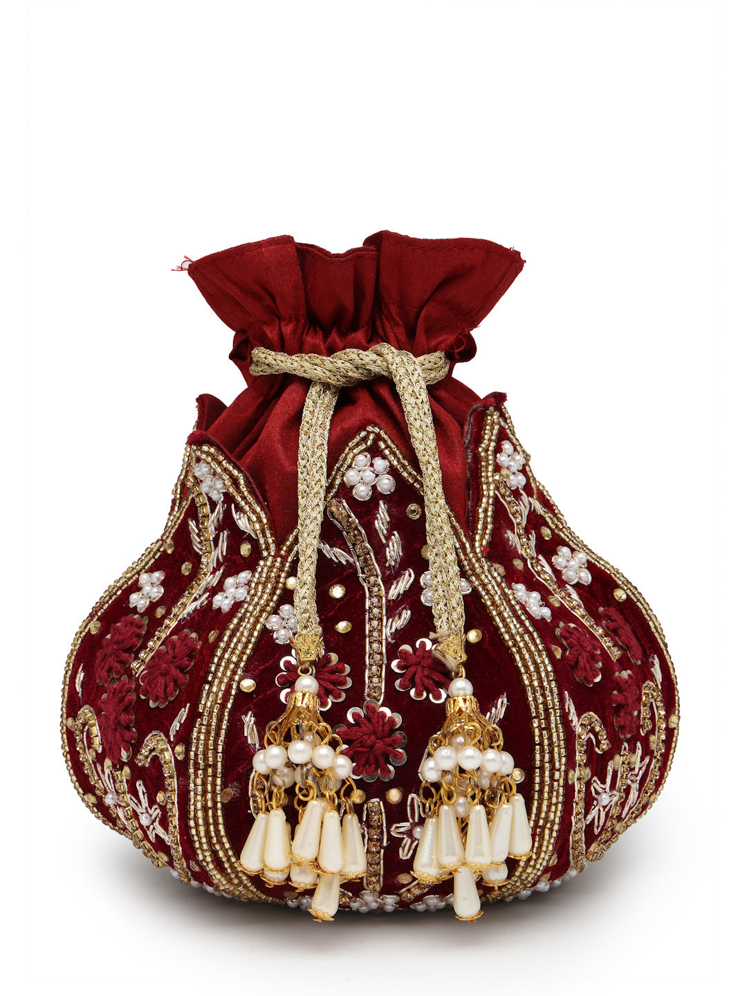 Pastel Peach & Gold Potli from Anekaant's Lotus Collection. This Potli is crafted with the finest Velvet Fabric and features a Floral Embellished Pattern decorated with Tassels. Has a Sturdy and Detachable Wrist Loop. Has one Main Compartment secured with a Drawstring Closure. Offers ample space for all your essentials like makeup, keys etc. Dimensions (LxHxW): 12 x 12 x 12 cm
