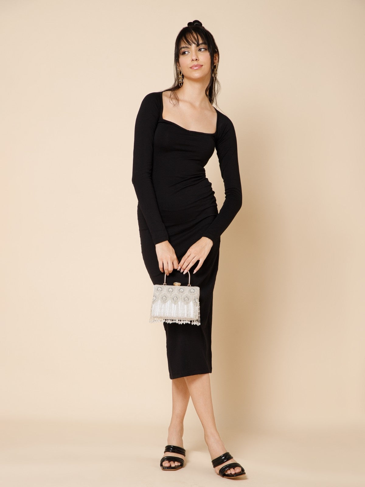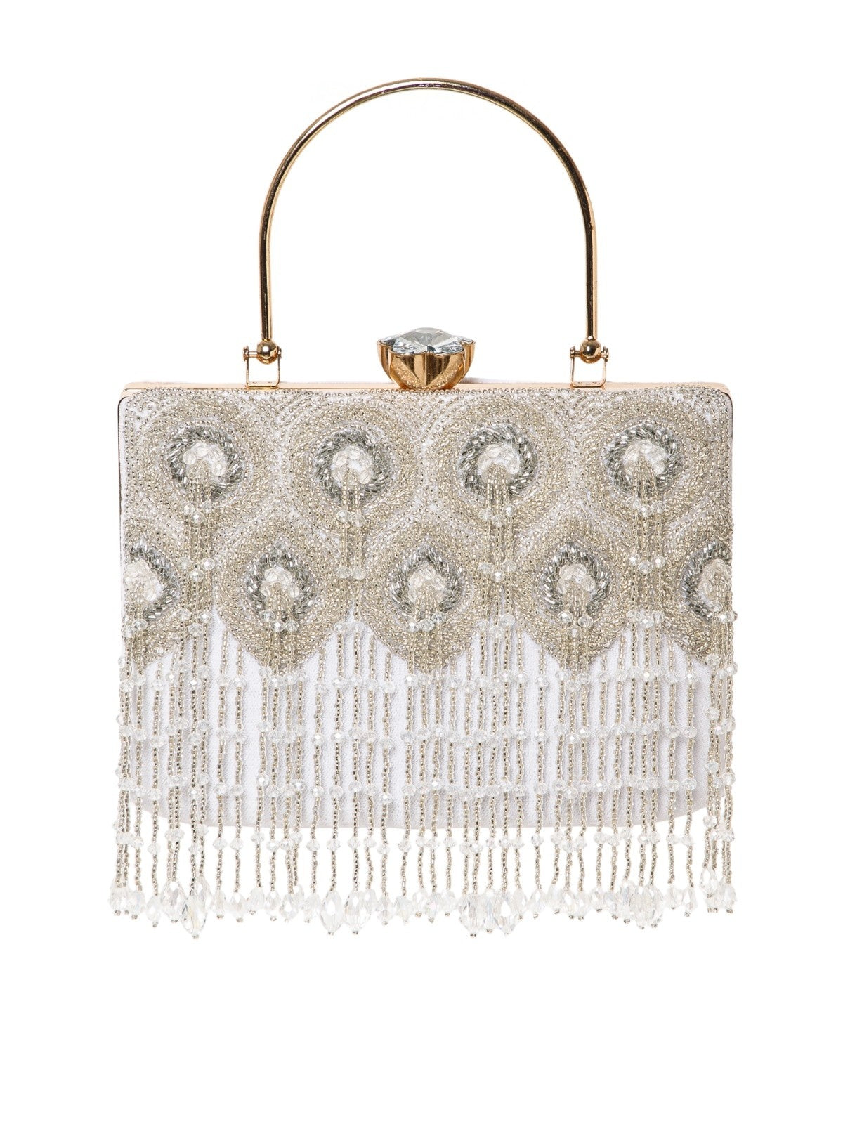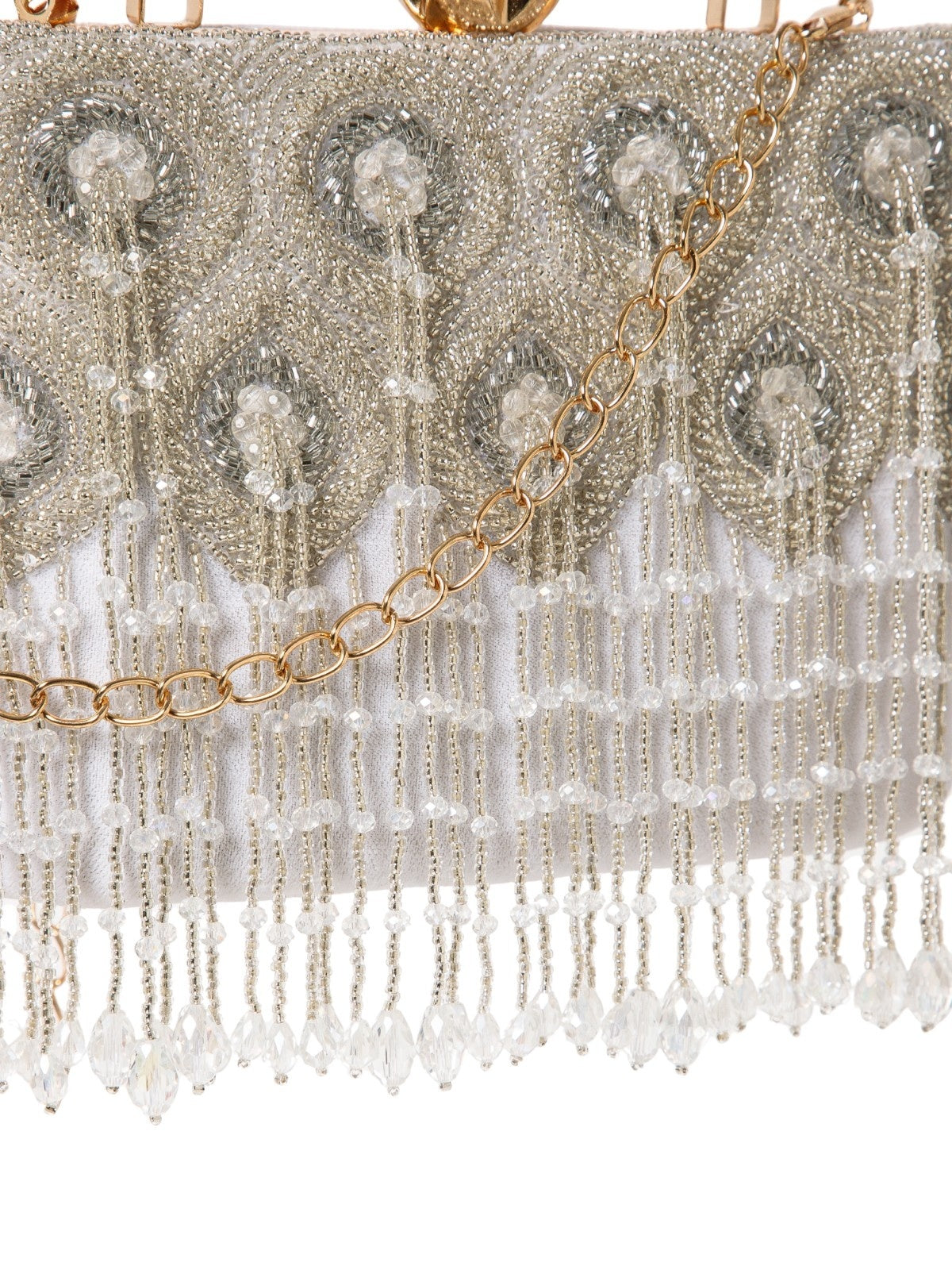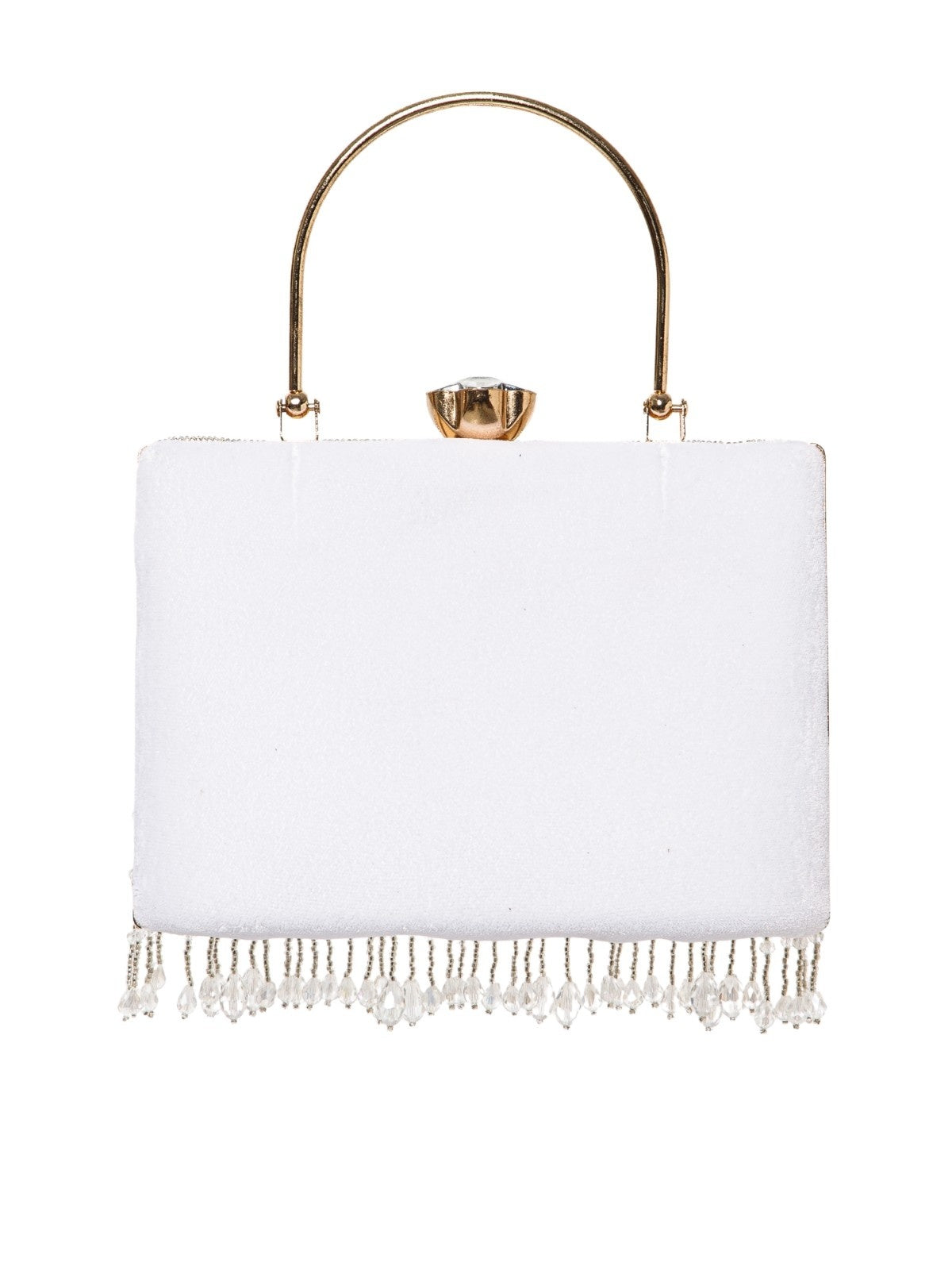 This Anekaant Clutch from the Crystal Cascade Collection is a timeless statement piece. Designed in white with silver and crystal beadwork, it is finished with a gold handle and crystal clasp. Crafted on a velvet base, it features concentric teardrop bead embroidery enhanced with cascading fringe for graceful movement. It includes a spacious compartment with a secure click closure and comes with a detachable shoulder strap and gold handle for versatile styling. Dimensions (L x H x W): 18 x 13 x 7 cm