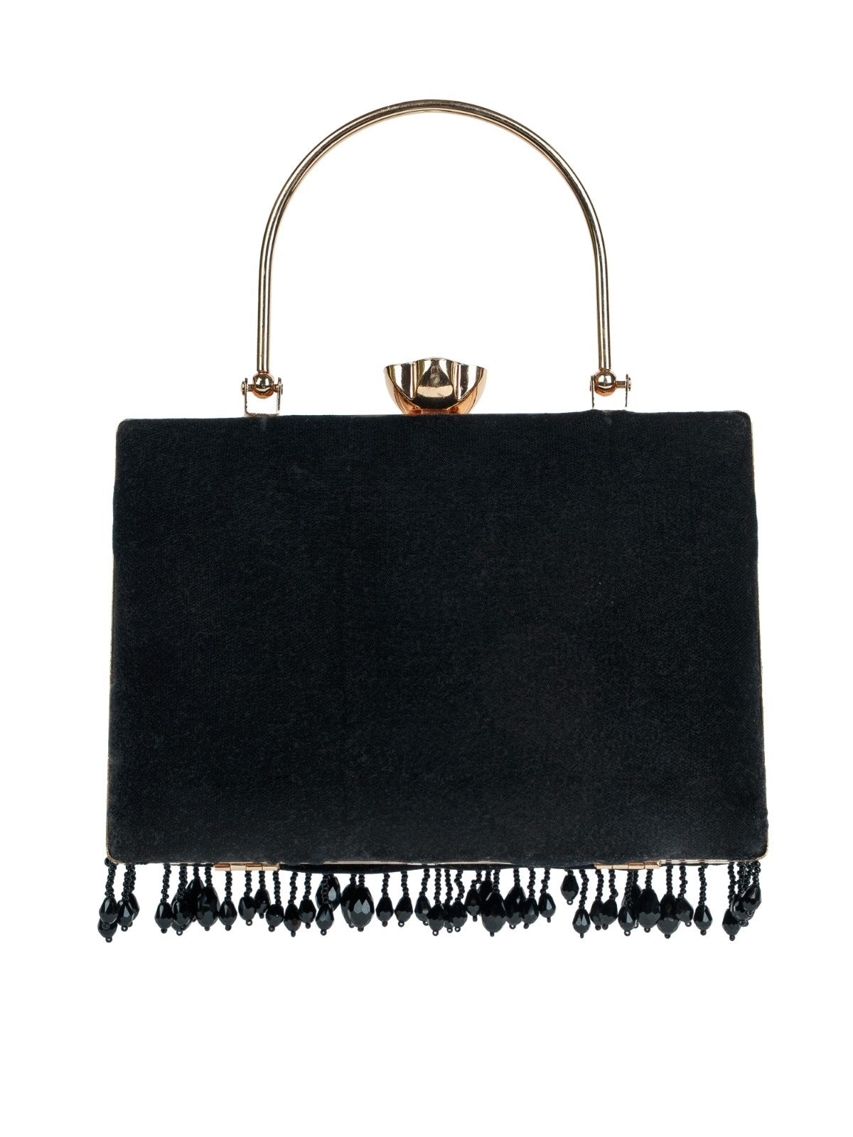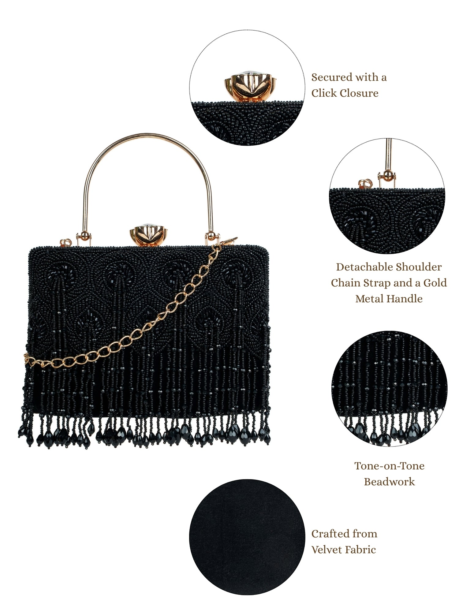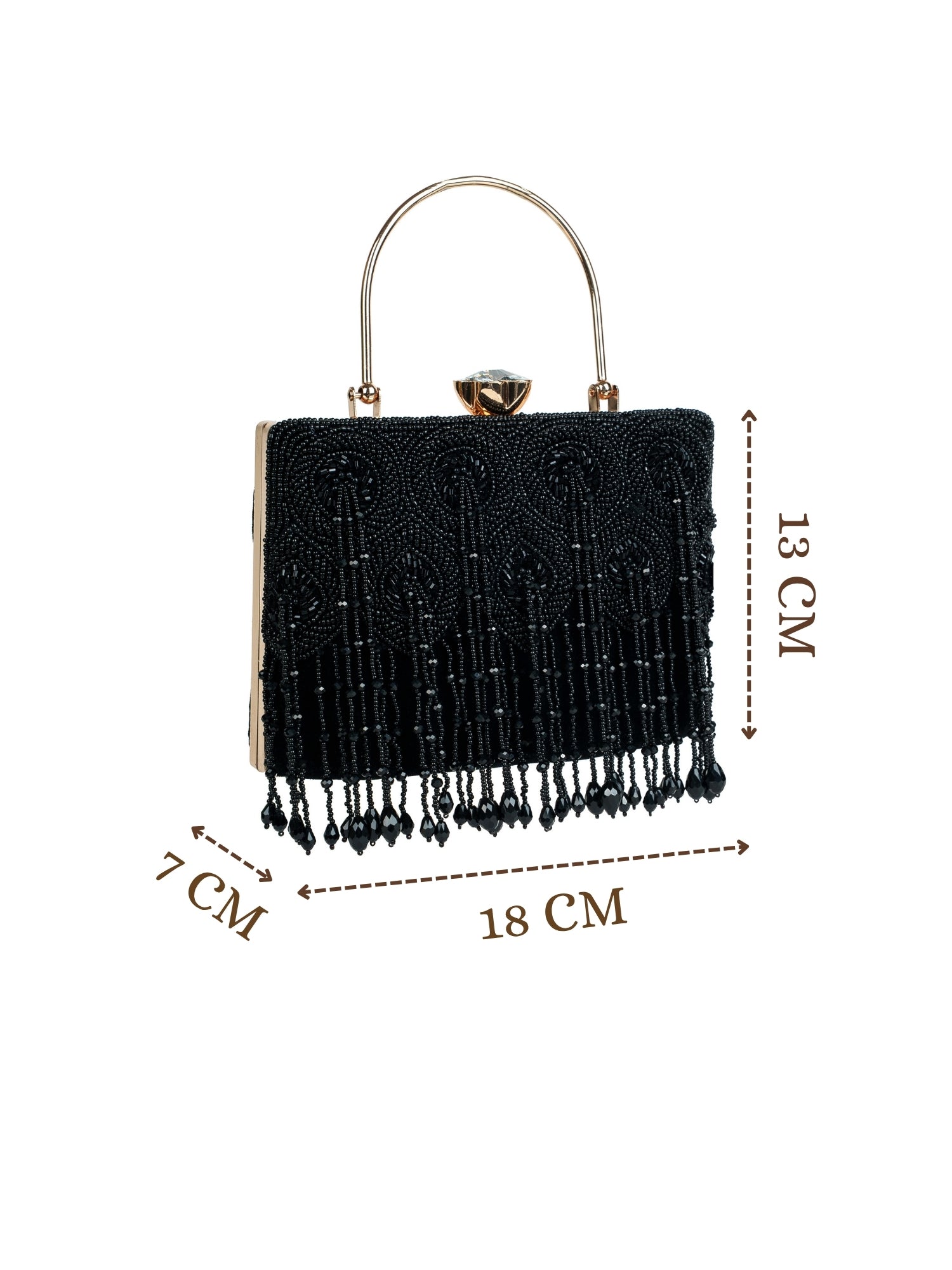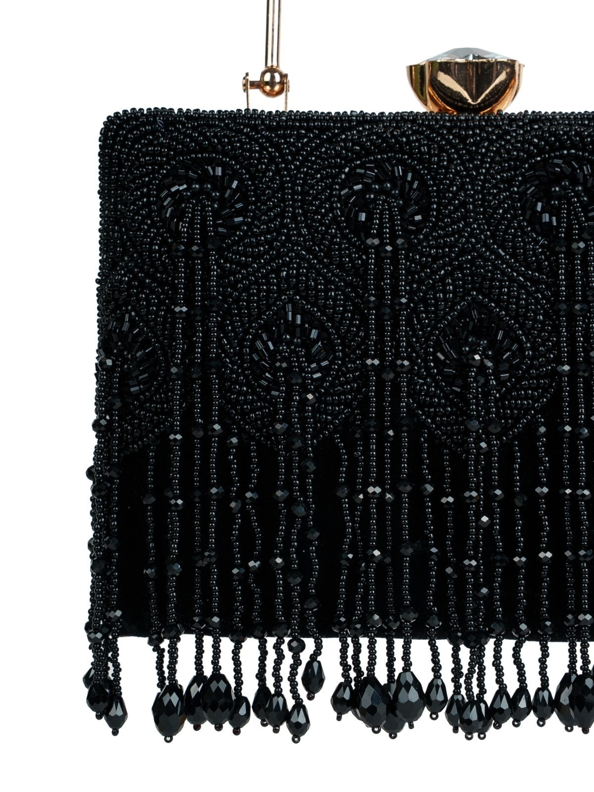 This Anekaant Clutch from the Crystal Cascade Collection is a timeless statement piece. Designed in jet black with matching black bead and sequin embellishments, it is finished with a gold handle and crystal clasp. Crafted on a velvet base, it features concentric teardrop bead embroidery enhanced with cascading fringe for graceful movement.