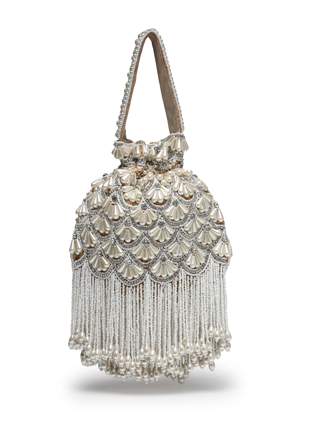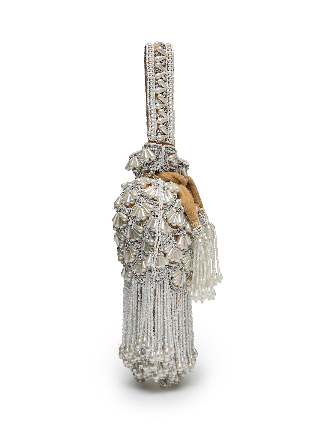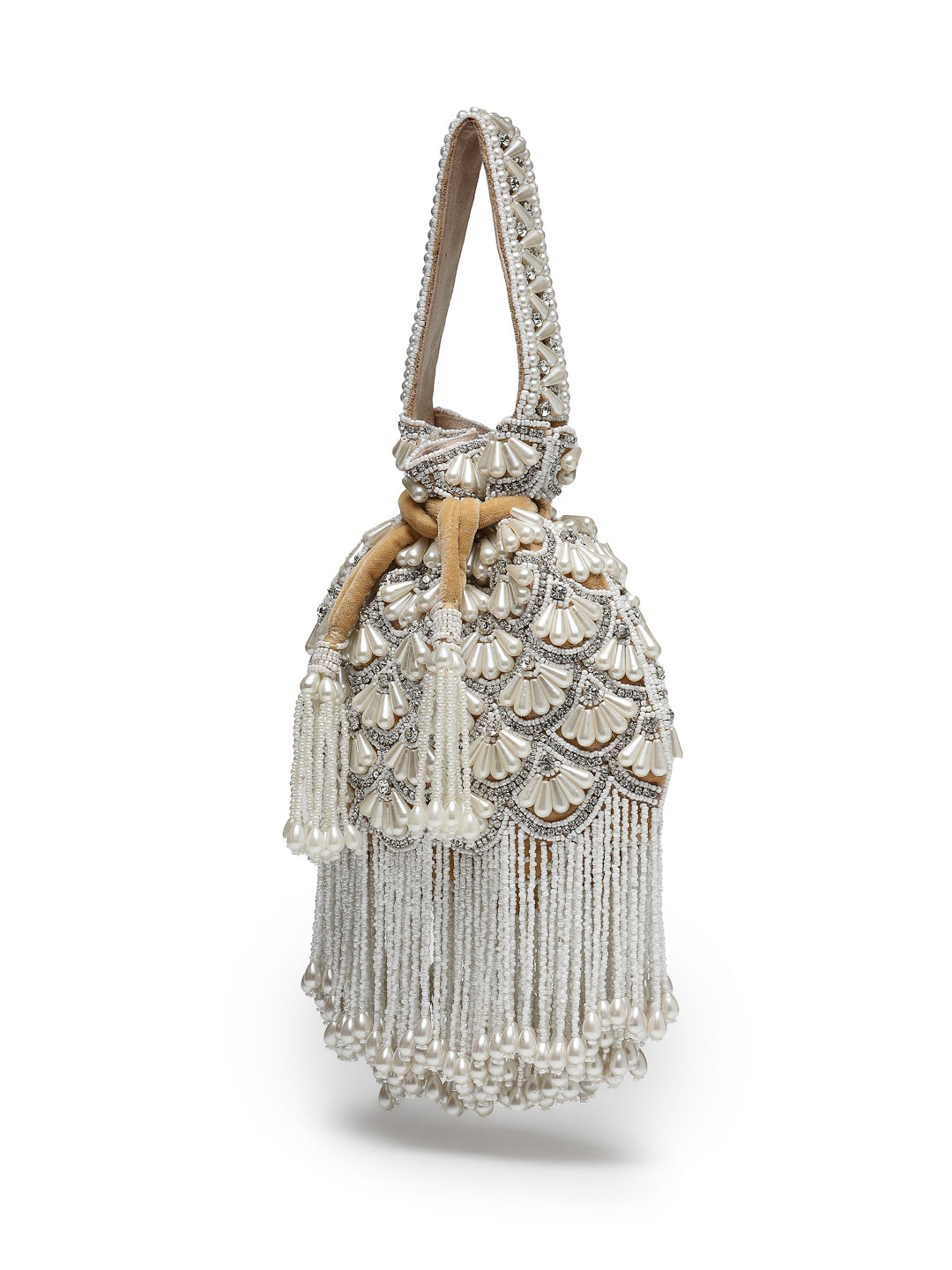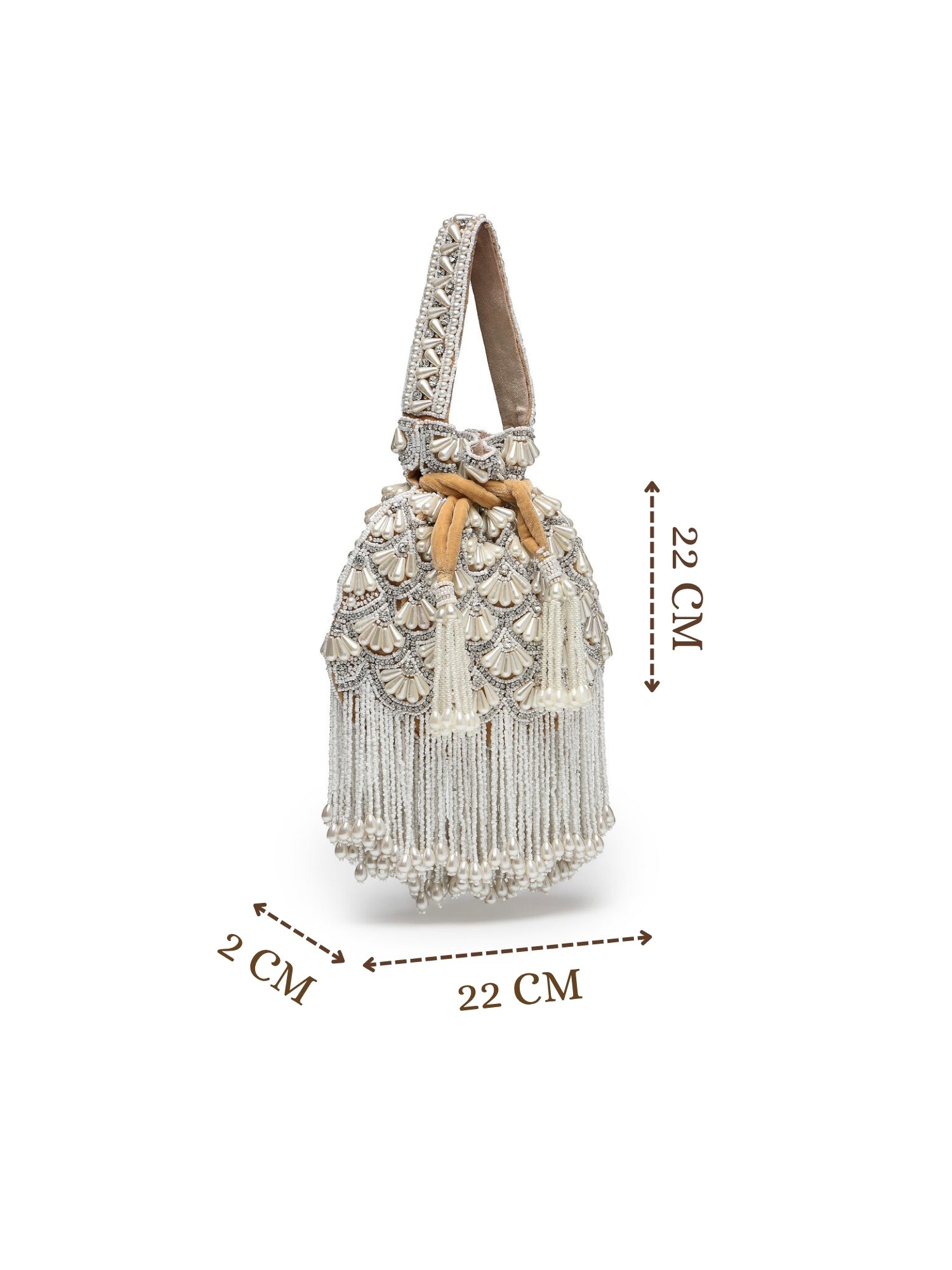 This Anekaant Potli from the Opal Thread Collection is styled in a luxurious design with a single compartment secured by a drawstring closure. The mustard yellow velvet base is elevated with ivory and silver embellishments, intricately detailed using glass beads, faux pearls, and seed beads. Layered scalloped pearl motifs highlighted with silver beadwork create a refined textured effect, while long pearl-beaded tassel fringes add opulence and movement. An embroidered handle ensures convenient carrying, making this potli an exquisite accessory for weddings, festive occasions, and evening celebrations. Dimensions (L x H x W):22 x 22 x 2 cm.