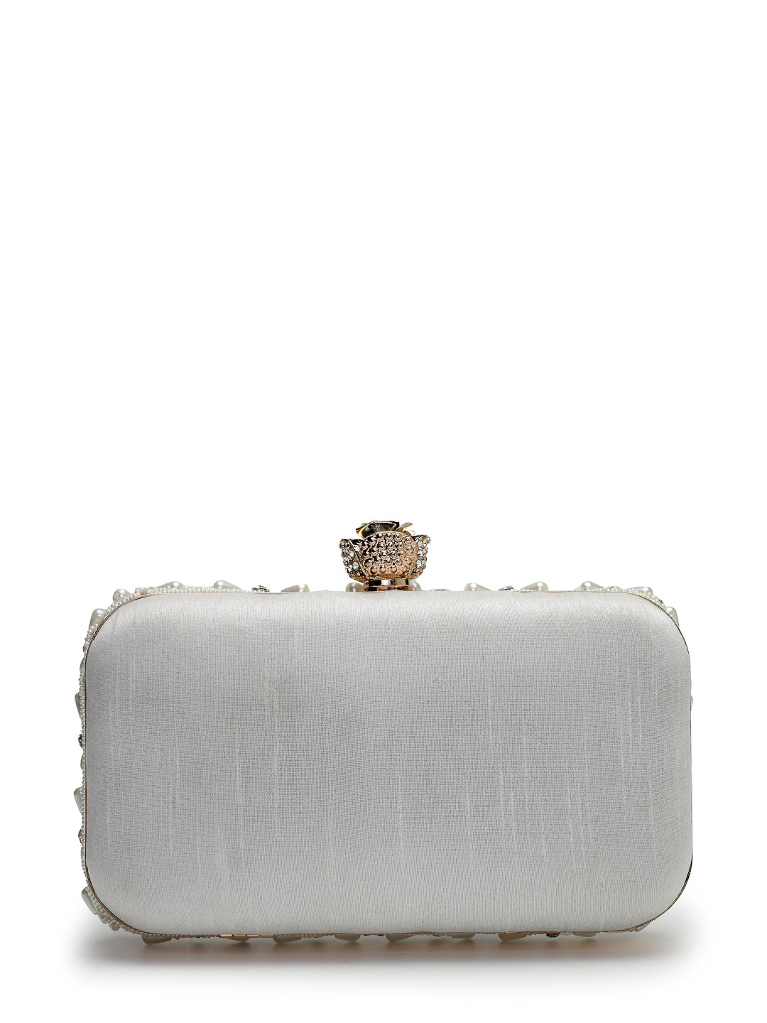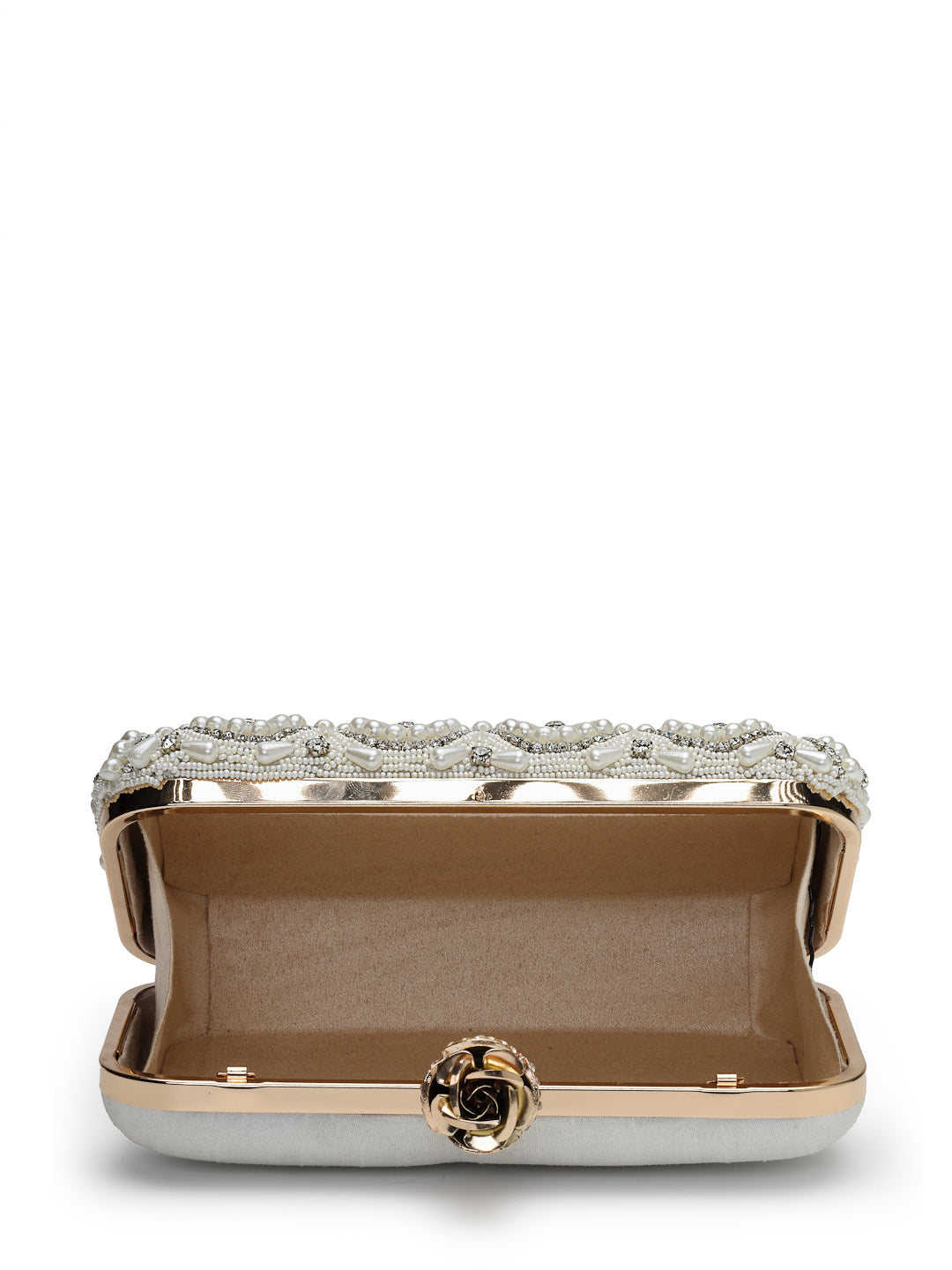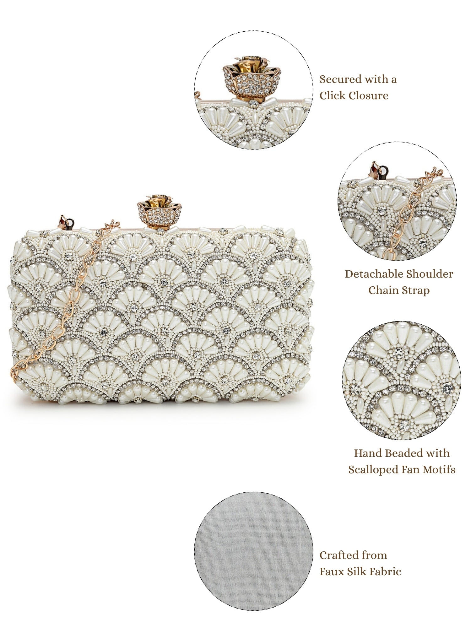 This Anekaant Clutch from the Opal Thread Collection is designed in a rectangular silhouette with a single compartment, secured by a click closure for easy access. Crafted on an ivory faux silk base with silver accents, it is richly embellished with faux pearls, seed beads, and rhinestones. The surface showcases scalloped fan motifs made from pearl beads and crystals, outlined with shimmering silver beadwork for a luxurious finish. For versatility, the clutch comes with a detachable shoulder strap so it can be carried by hand or worn over the shoulder. Dimensions (L x H x W): 22 x 15 x 6 cm.