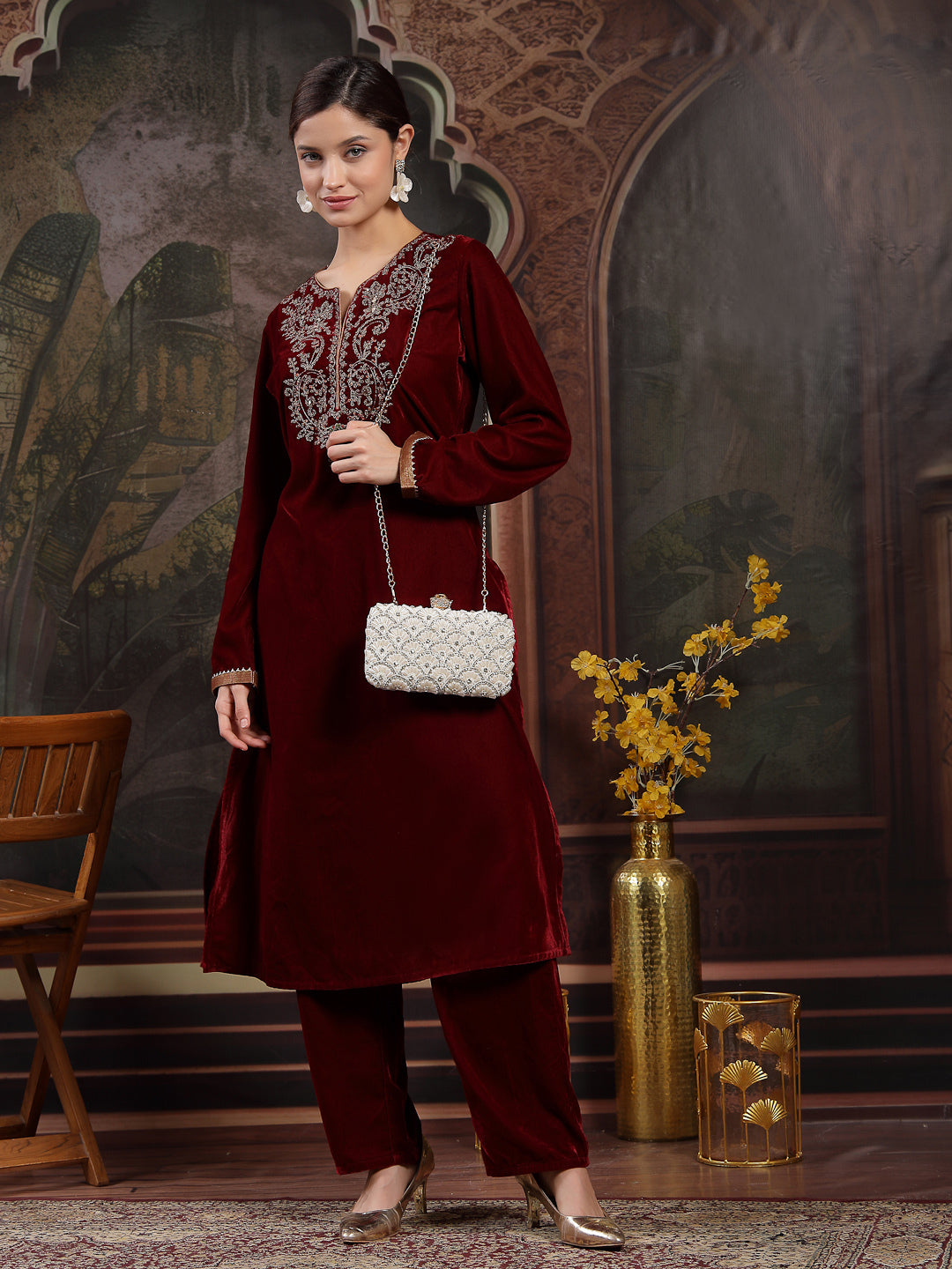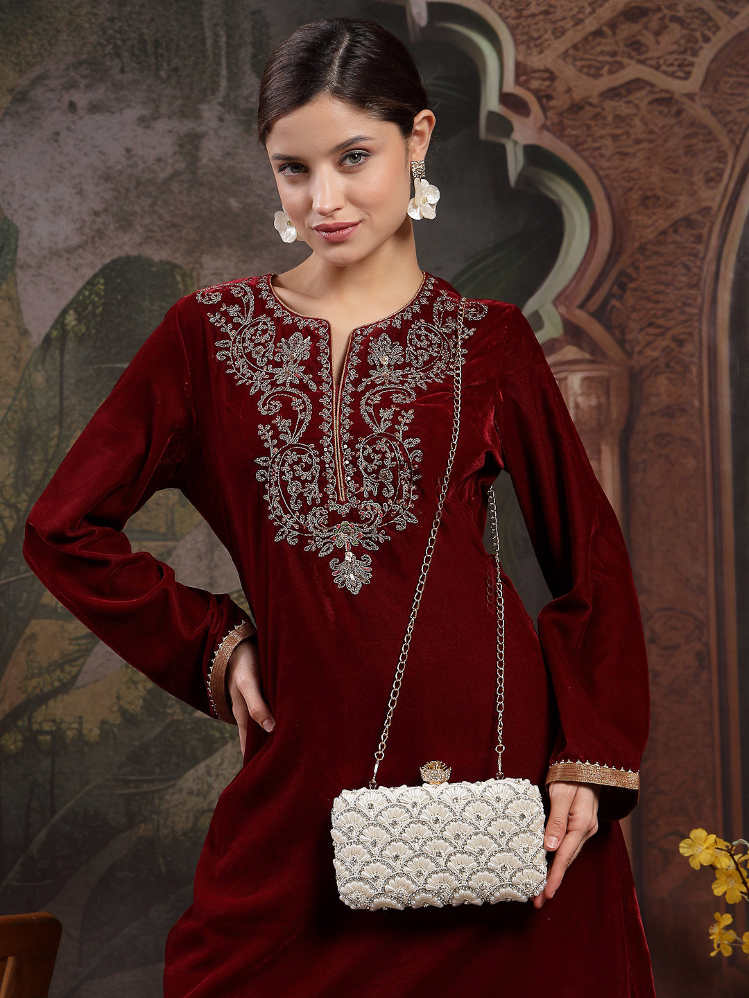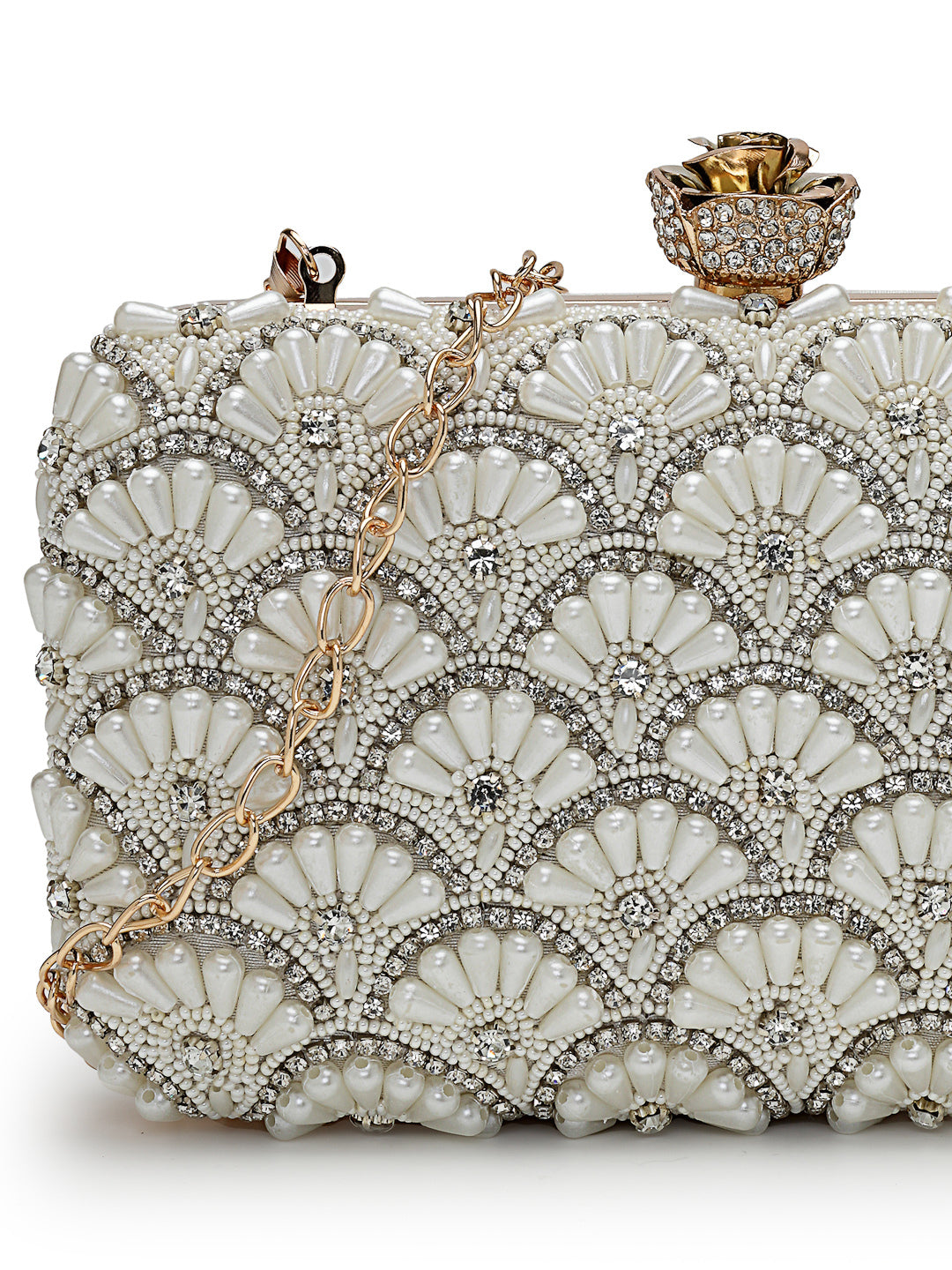 This Anekaant Clutch from the Opal Thread Collection is designed in a rectangular silhouette with a single compartment, secured by a click closure for easy access. Crafted on an ivory faux silk base with silver accents, it is richly embellished with faux pearls, seed beads, and rhinestones. The surface showcases scalloped fan motifs made from pearl beads and crystals, outlined with shimmering silver beadwork for a luxurious finish. For versatility, the clutch comes with a detachable shoulder strap so it can be carried by hand or worn over the shoulder. Dimensions (L x H x W): 22 x 15 x 6 cm.