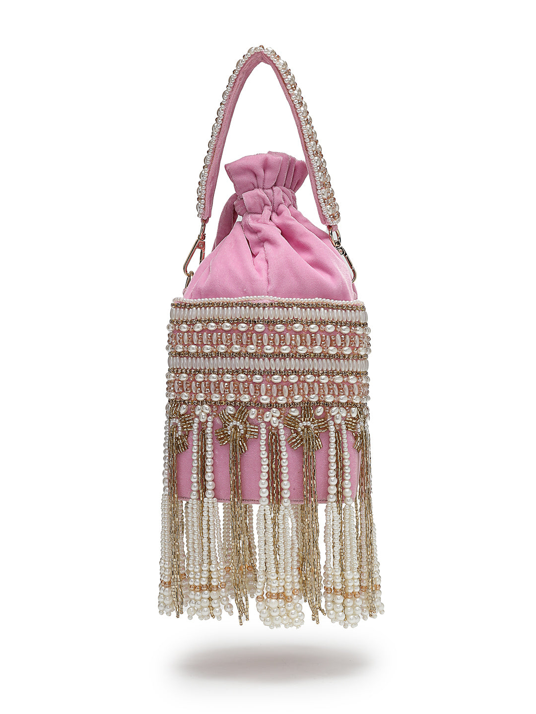 This Anekaant Potli from the Dewdrop Fringe Collection is crafted with a single compartment secured by a drawstring closure. The baby pink velvet exterior is accented with ivory, gold, and blush details, intricately embellished using faux pearls, seed beads, and metallic tube elements. Horizontal striped embroidery enriched with pearl and gold floral motifs adds sophistication, while an embroidered detachable handle ensures ease of carrying. Layered pearl and gold tassel fringes complete the design with an opulent finish. Dimensions (L x H x W):16 x 14 x 12 cm.