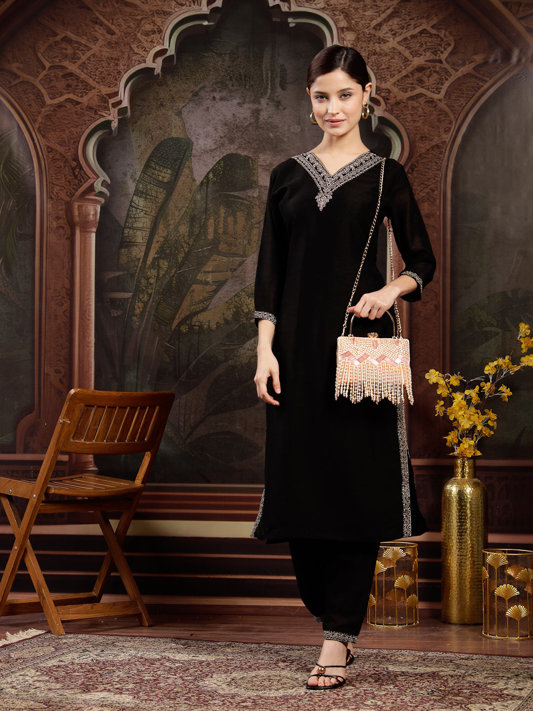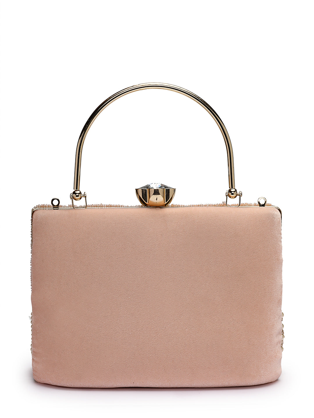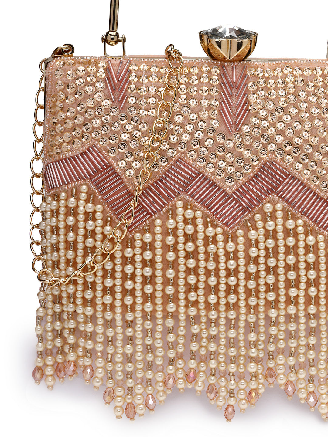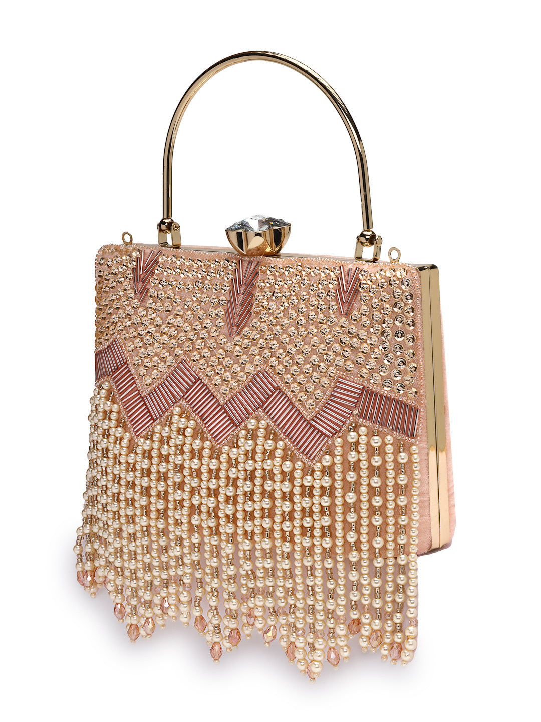This Anekaant Clutch from the Crystal Cascade Collection is crafted in a rectangular silhouette with a single compartment secured by a click closure. Designed on a blush pink velvet base with champagne and ivory accents, it is embellished with sequins, bugle beads, faux pearls, and crystals. The upper panel is detailed with dense gold sequin embroidery and pink chevron beadwork, flowing into pearl fringes tipped with faceted crystals for an elegant finish. A gold metal handle and detachable shoulder strap add versatile carrying options. Dimensions (L x H x W):19 x 15 x 9 cm.
