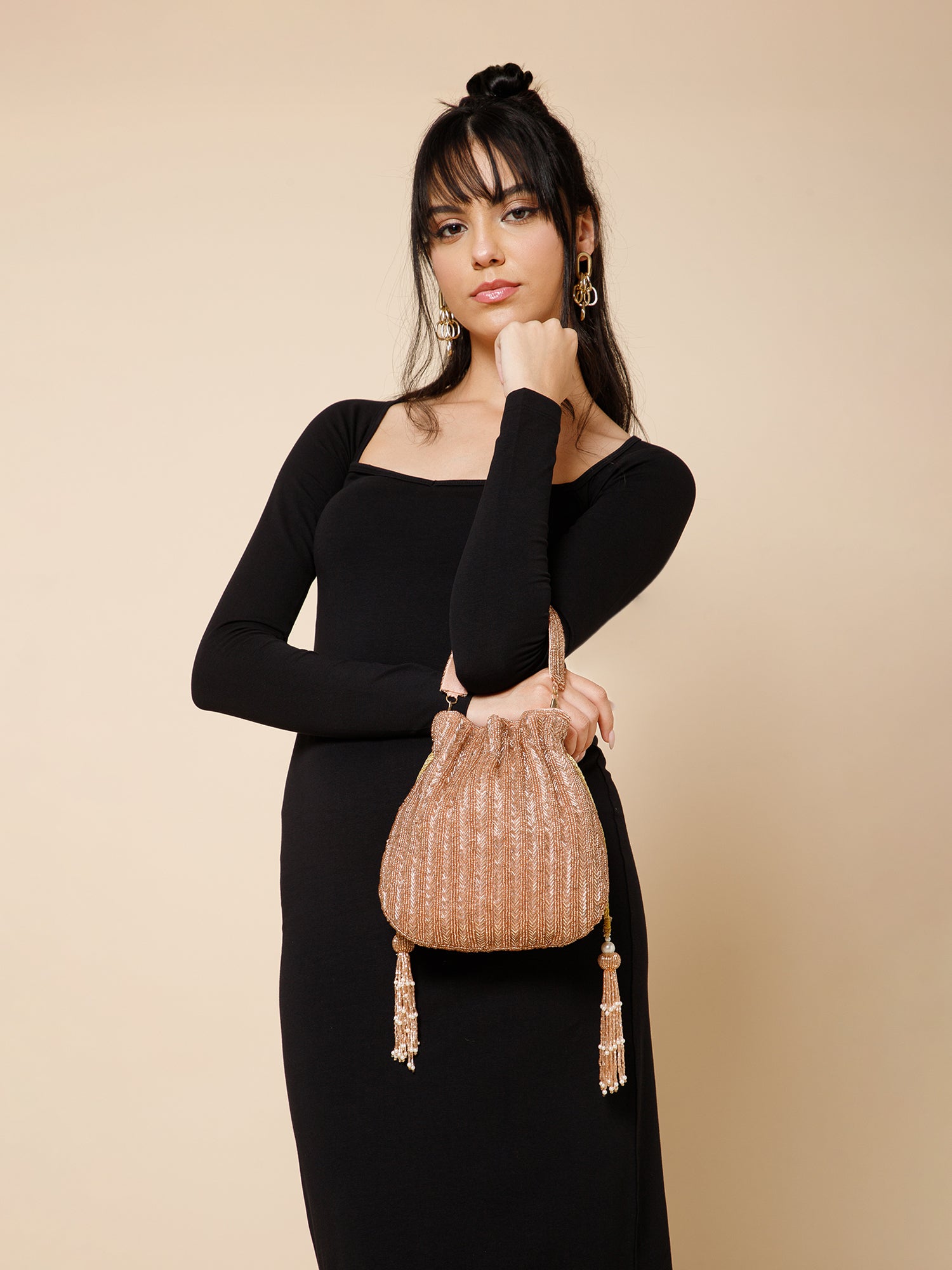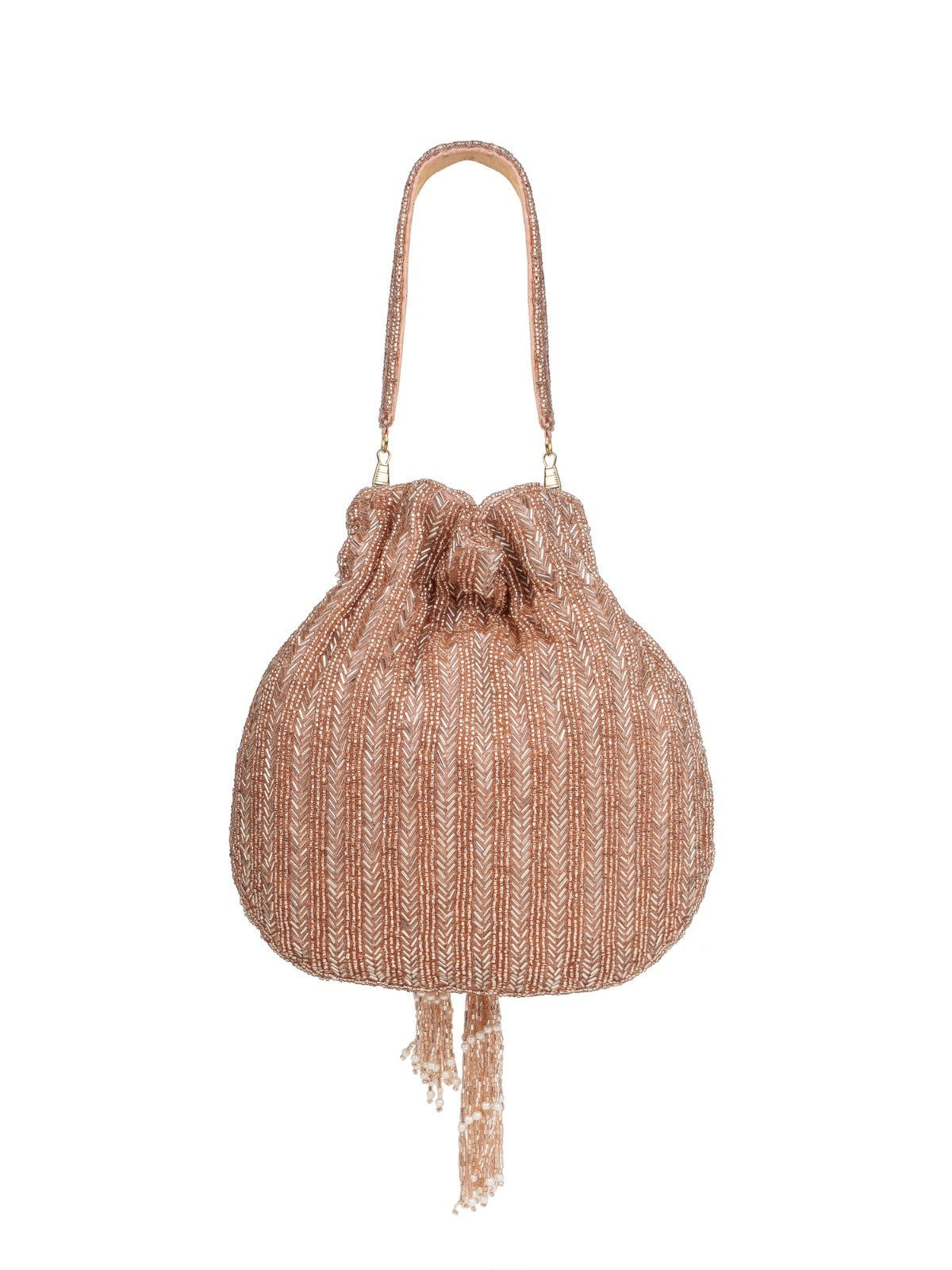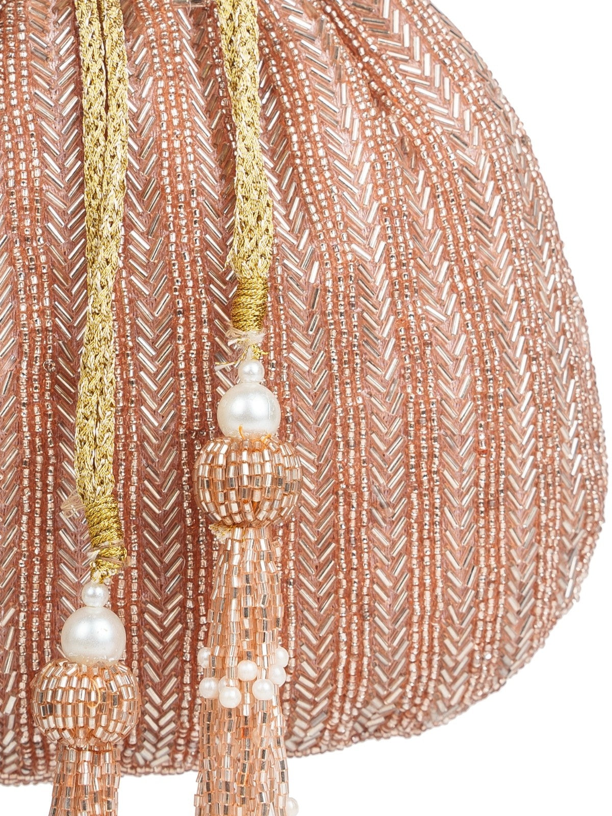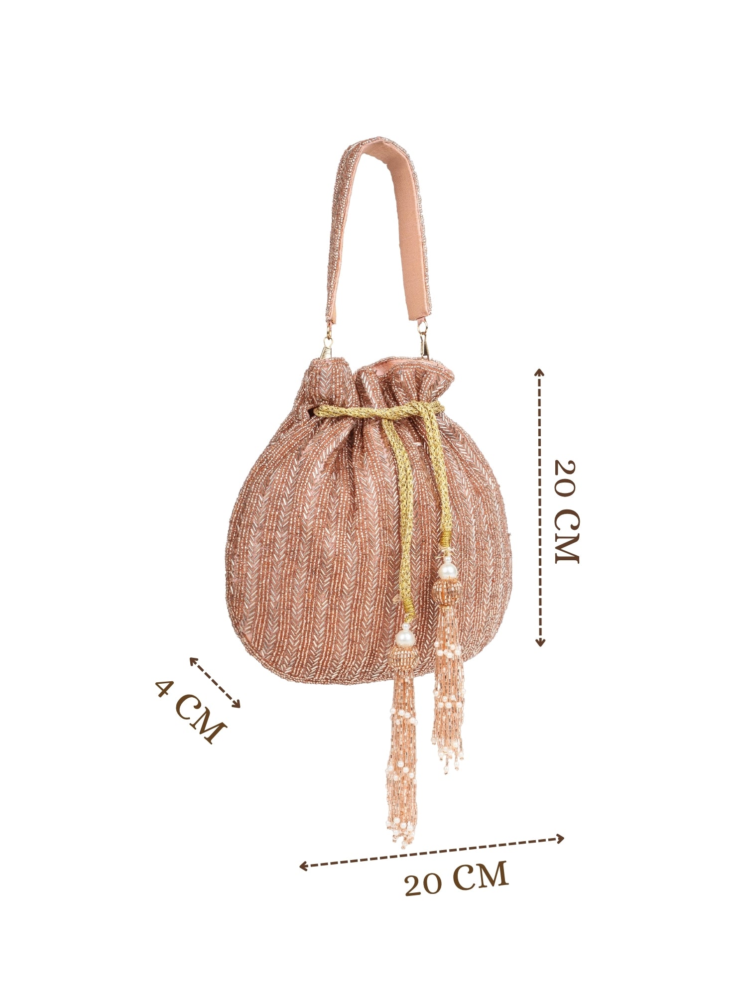 This Anekaant Potli from the Crystal Cascade Collection is designed in a warm dusty pink with golden accents on a smooth faux silk base with a subtle sheen. It features an all-over vertical chevron pattern crafted with gold and peach bead embroidery, complemented by a golden braided drawstring adorned with pearl and beaded tassels for an elegant finish. The bag includes a main compartment with a drawstring closure and comes with a detachable embroidered handle for easy carrying. Dimensions (L x H x W): 20 x 20 x 4 cm