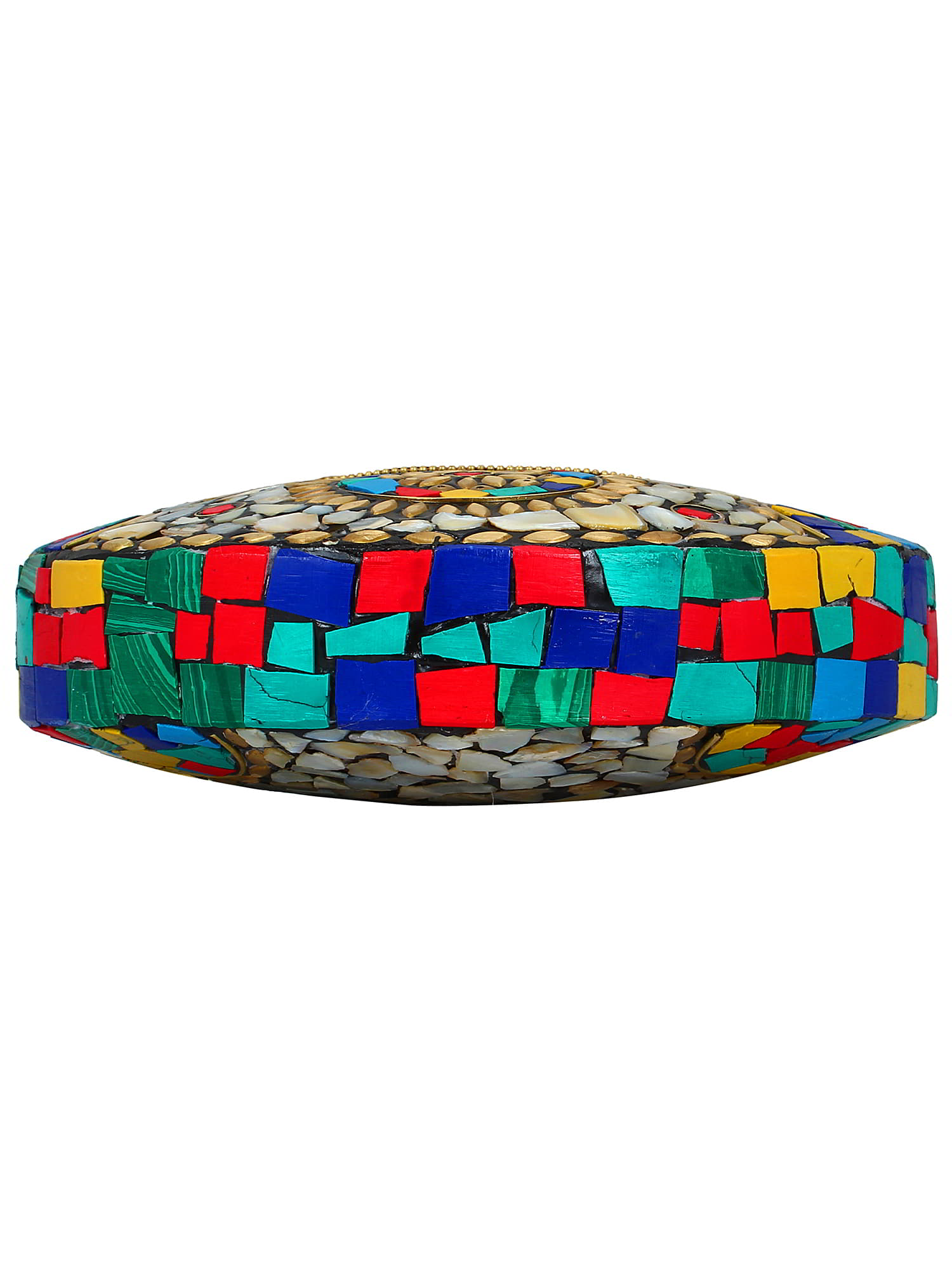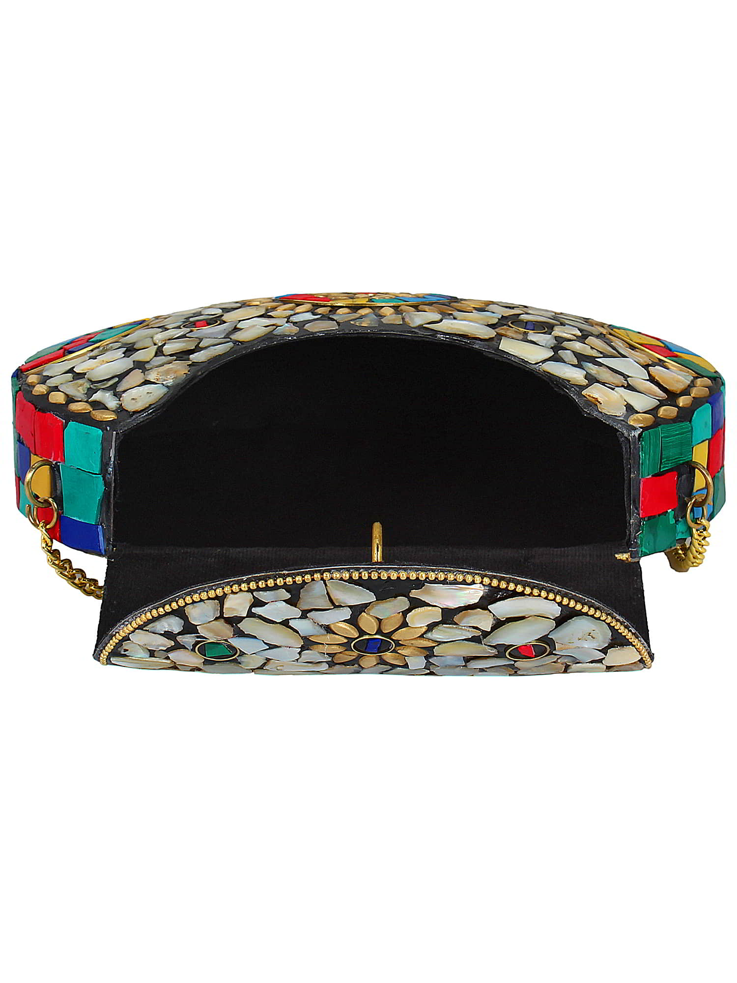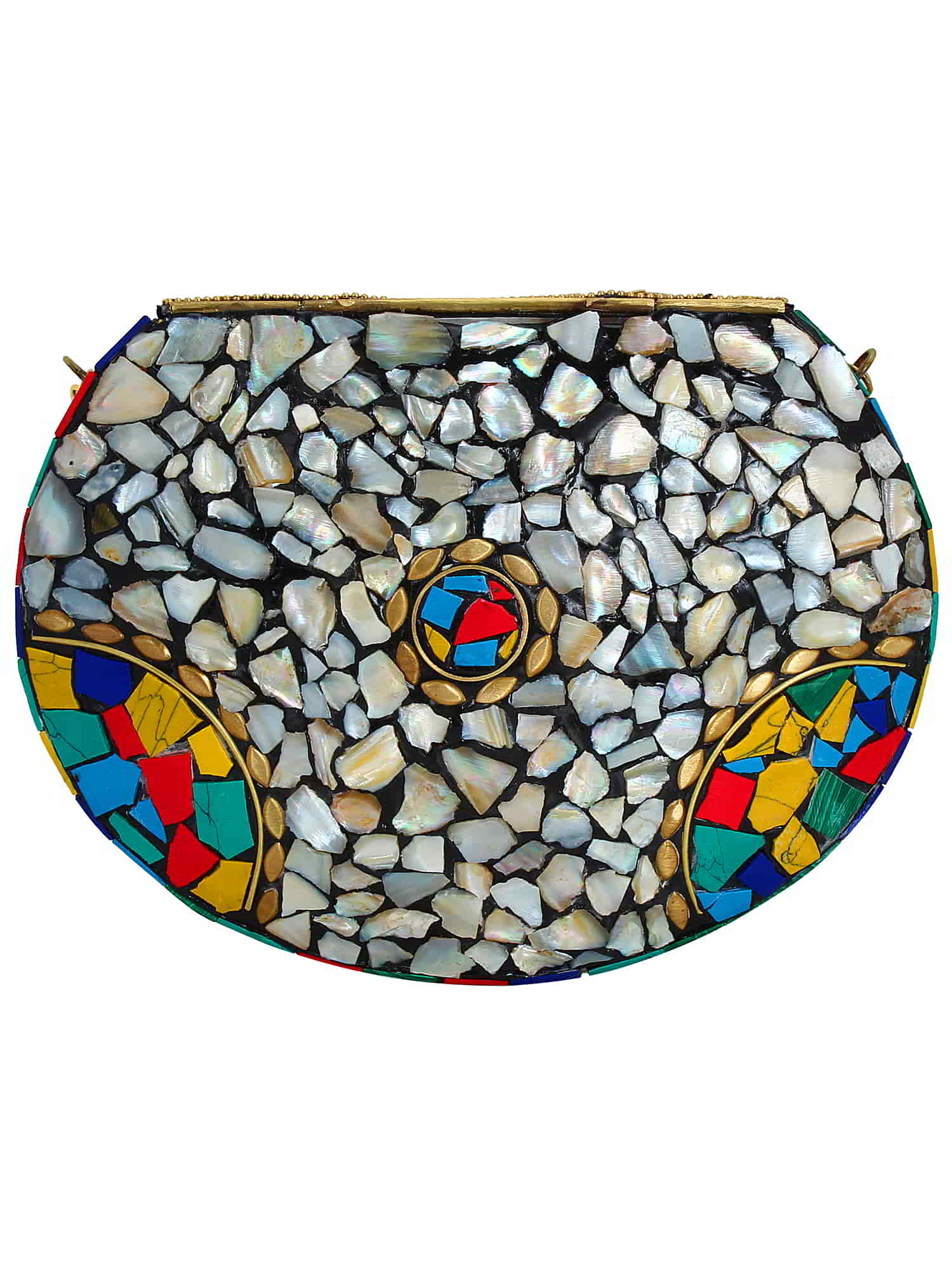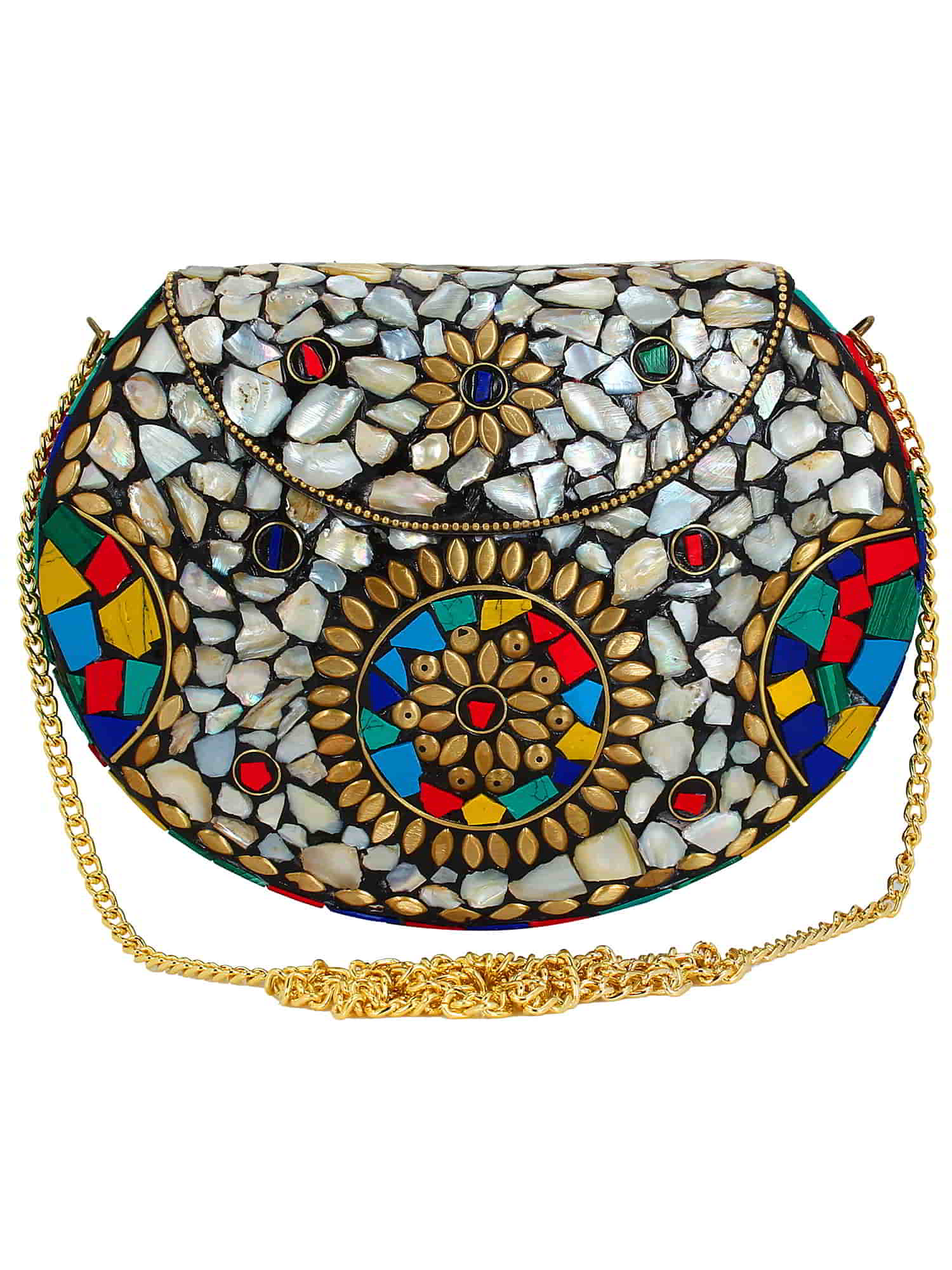 Metal clutch bag with mosaic design stone work. It has one main compartment with flap closure and a removable metal chain. Can be used as a Sling.