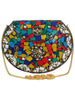 Metal clutch bag with mosaic design stone and metal work. It has one main compartment with flap closure and a removable metal chain. Can be used as a Sling.
