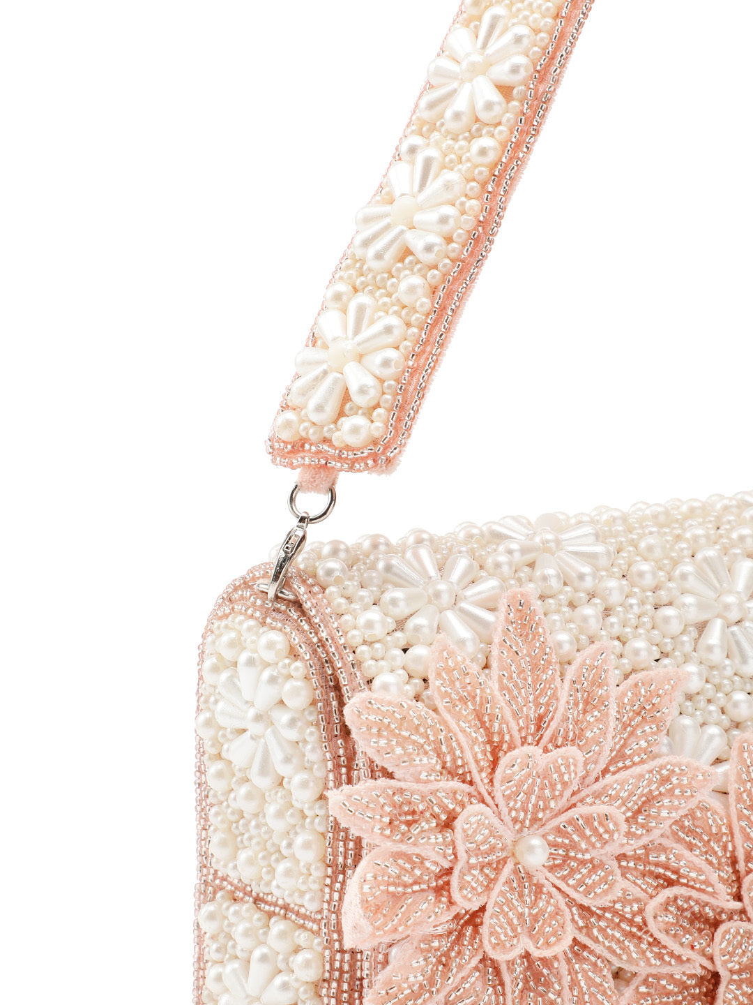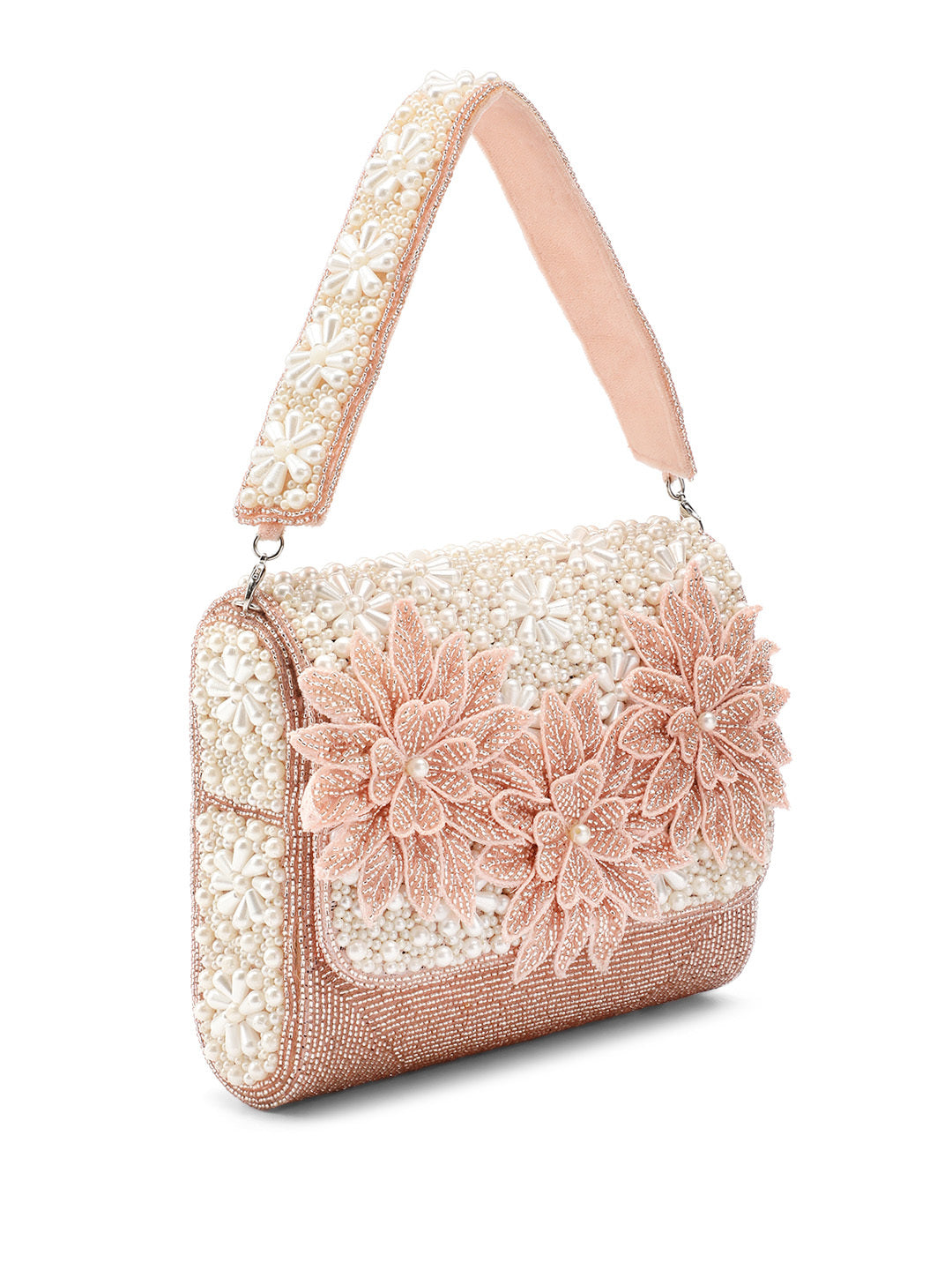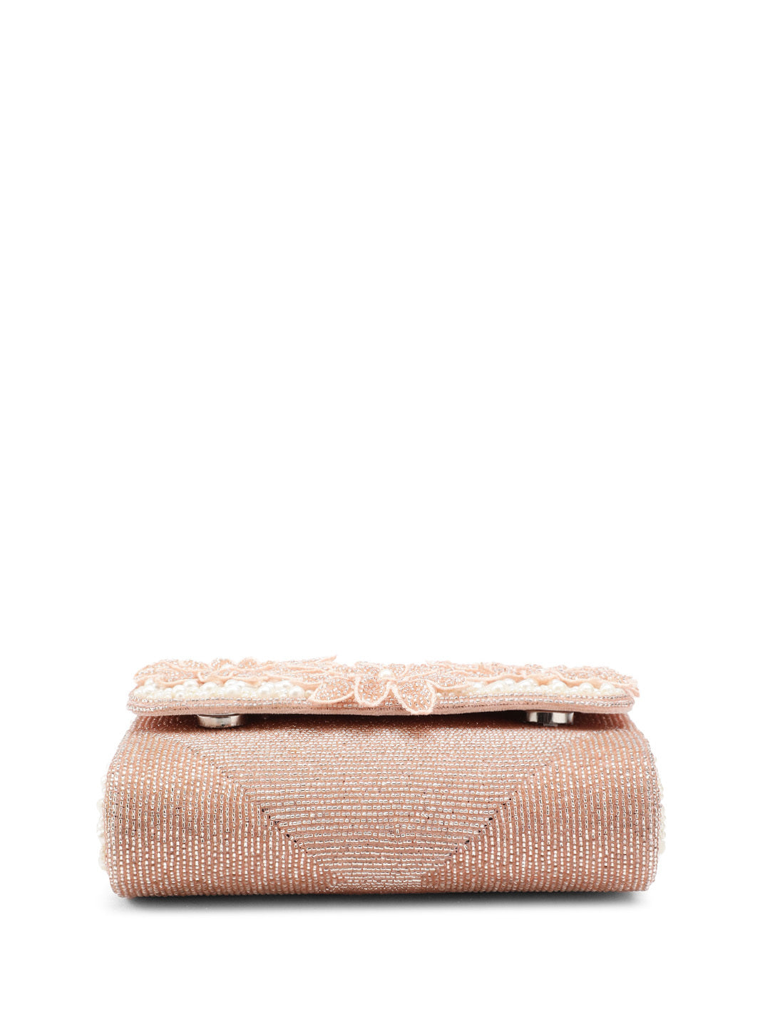 The Anekaant Dusty Pink & Pearl White Clutch from the Blush & Bead collection is an elegant foldover accessory designed for festive and evening occasions. Crafted from plush velvet in a rectangular silhouette, it features intricate pearl and bead embellishments over delicate floral cutwork. The interior is lined with matching velvet and includes one main compartment secured by a magnetic button closure, along with an inner slip pocket for convenience. It comes with a detachable embroidered handle as well as a metal chain strap for versatile styling. Dimensions (L x H x W): 18 x 15 x 5 cm.