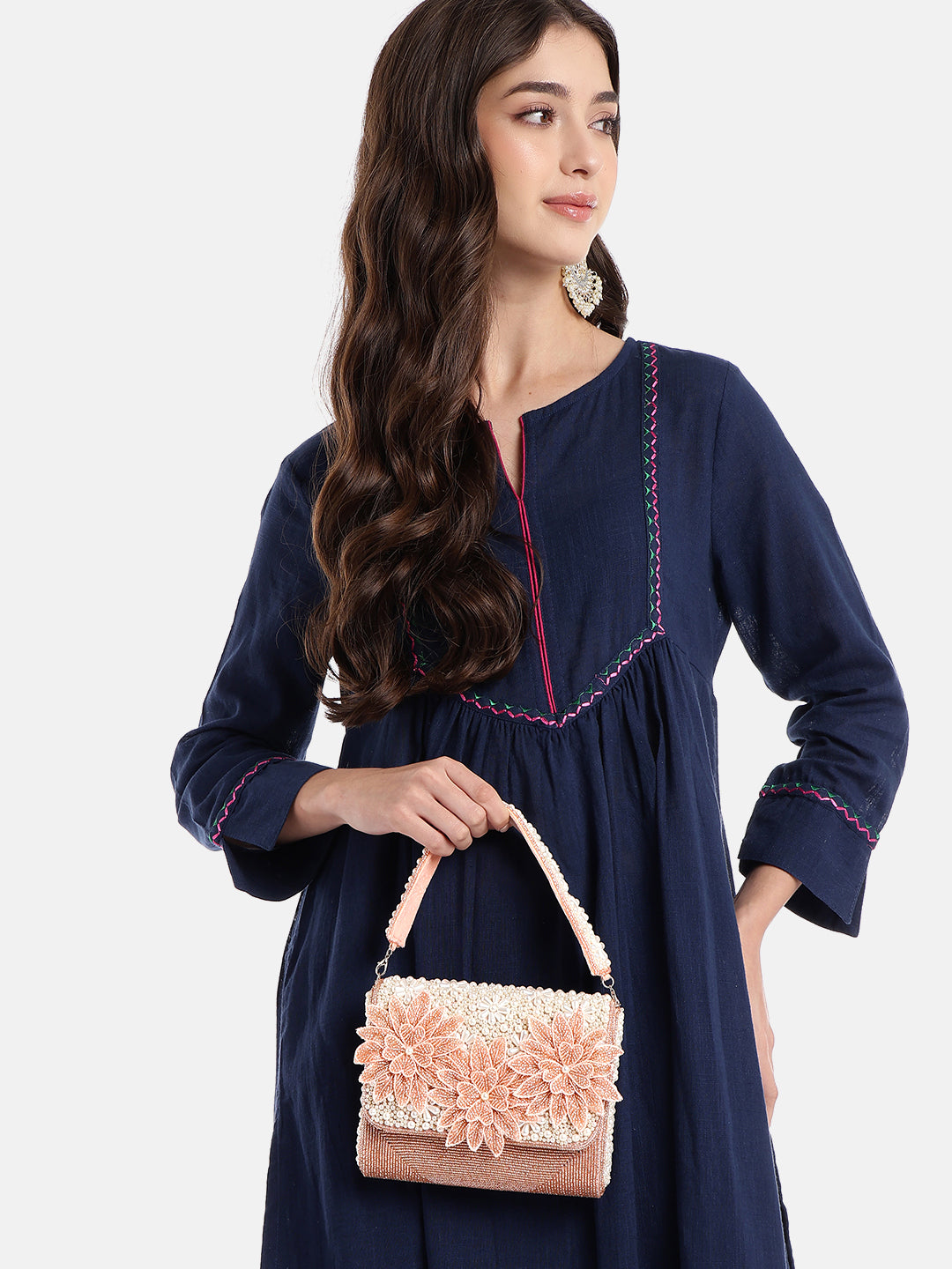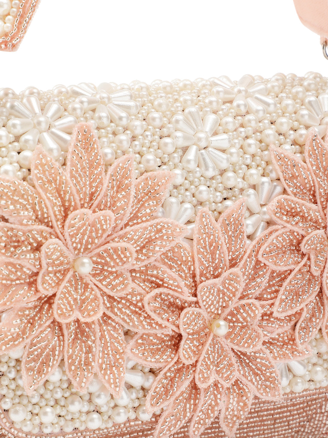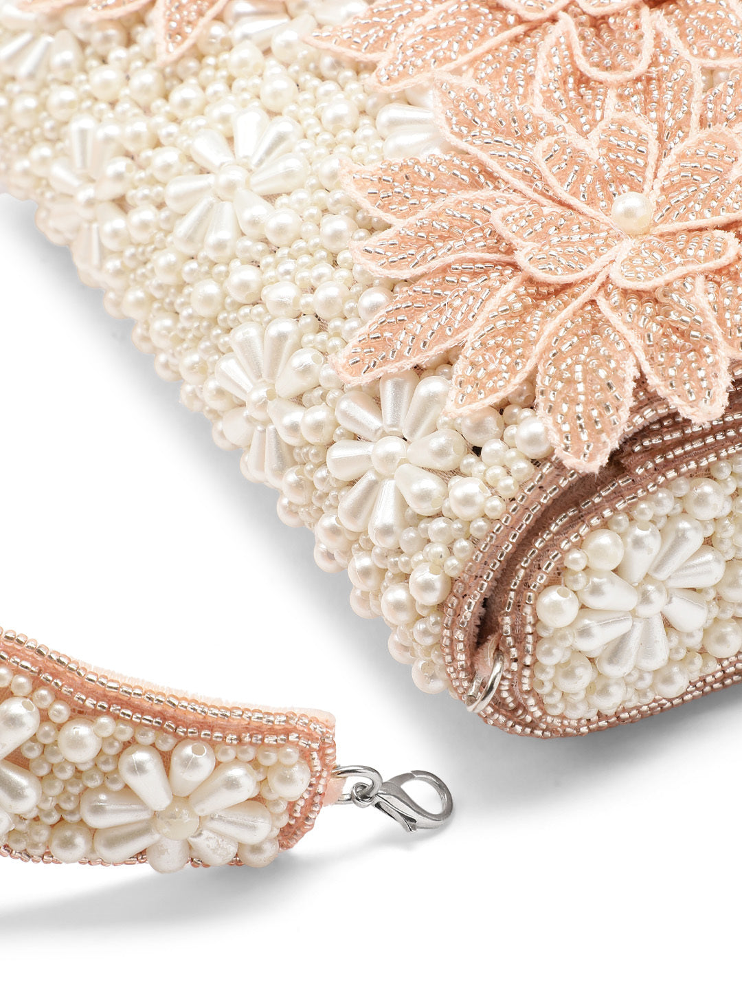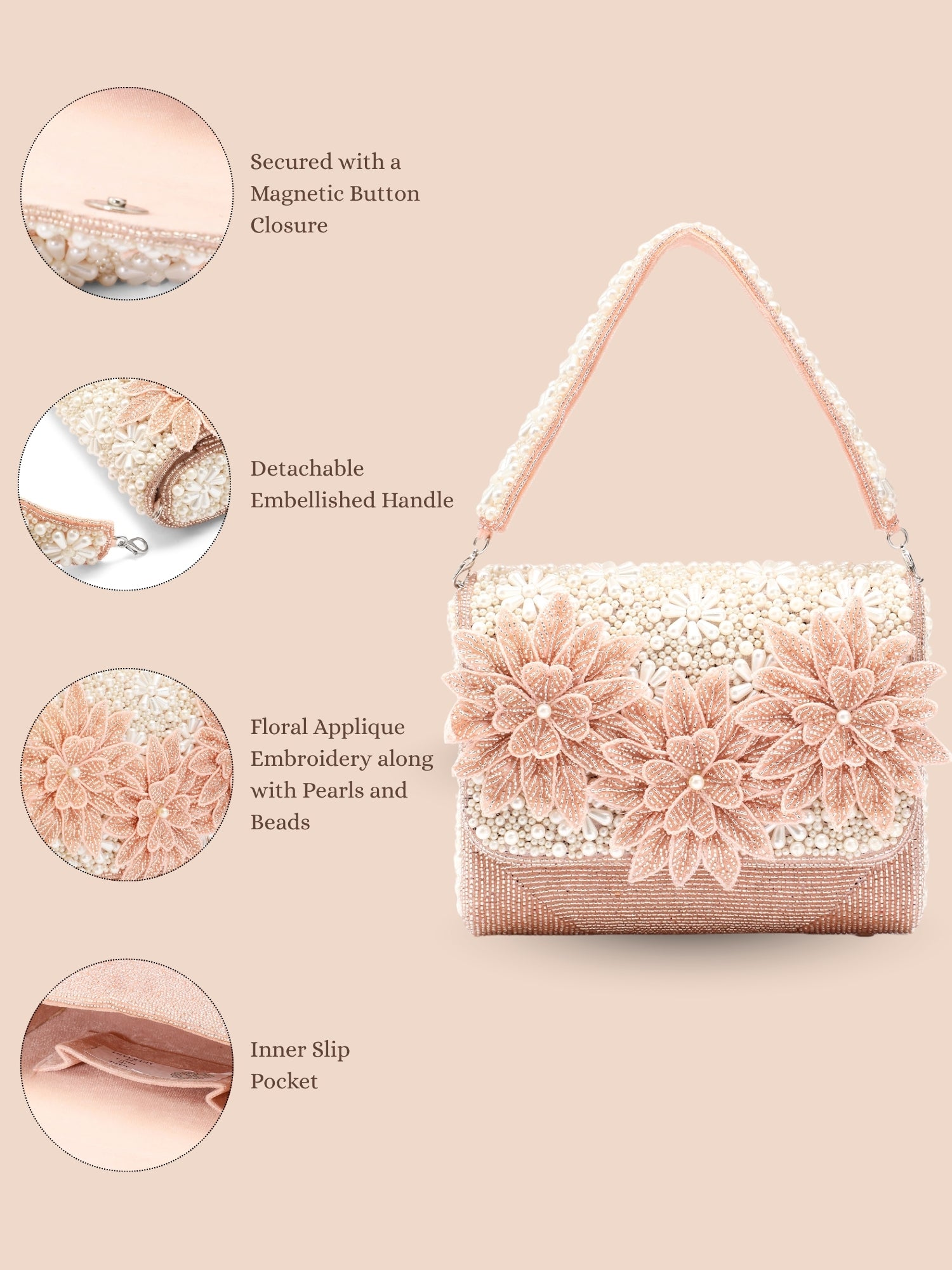 The Anekaant Dusty Pink & Pearl White Clutch from the Blush & Bead collection is an elegant foldover accessory designed for festive and evening occasions. Crafted from plush velvet in a rectangular silhouette, it features intricate pearl and bead embellishments over delicate floral cutwork. The interior is lined with matching velvet and includes one main compartment secured by a magnetic button closure, along with an inner slip pocket for convenience. It comes with a detachable embroidered handle as well as a metal chain strap for versatile styling. Dimensions (L x H x W): 18 x 15 x 5 cm.