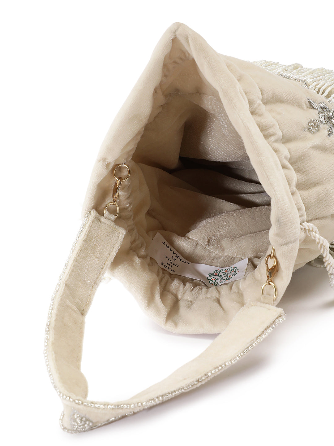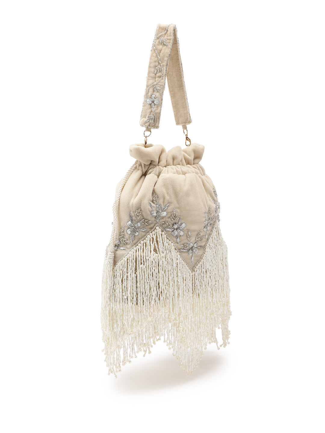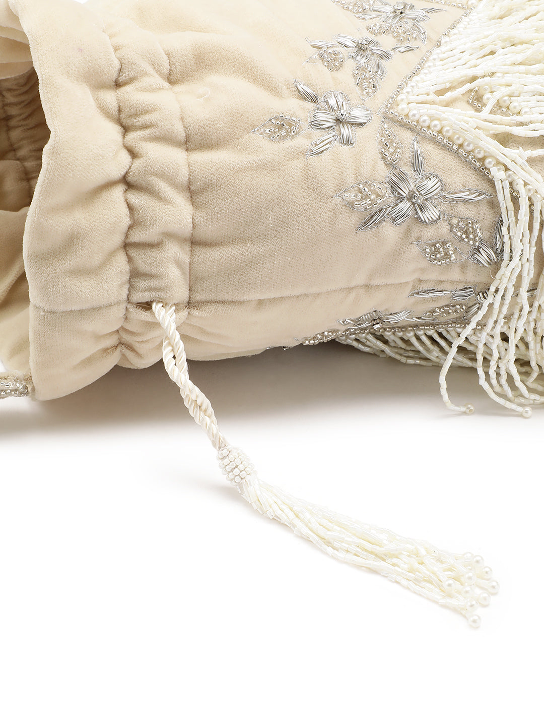 The Anekaant Ecru & Ivory Potli from the Dewdrop Fringe collection is a refined blend of heritage craftsmanship and contemporary elegance. Made from plush velvet with a soft inner lining, it features a metallic silver-embroidered base accented with subtle ivory detailing. The surface is adorned with floral zari work and finished with a deep V-shaped fringe embellished with beads, adding graceful movement and charm. It includes a single compartment with a drawstring closure and a detachable embroidered handle for versatile styling. Dimensions (L x H x W): 19 x 22 x 10 cm.
