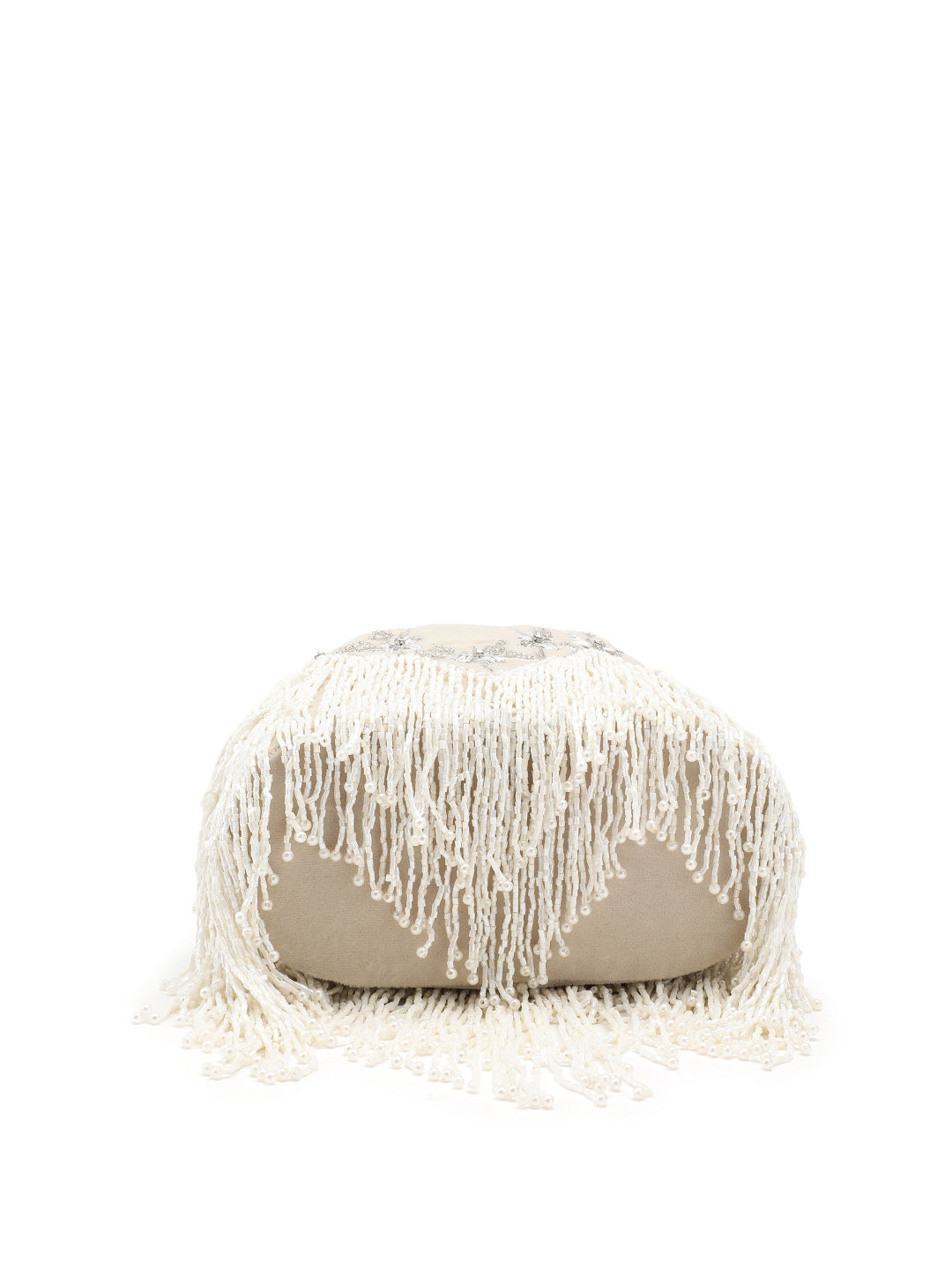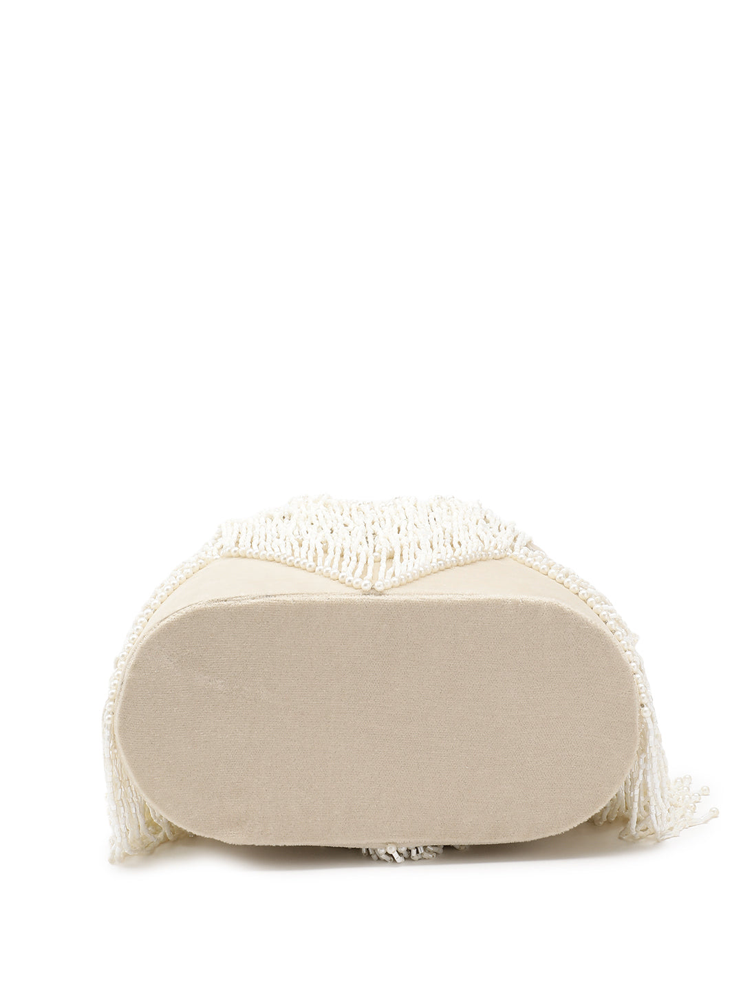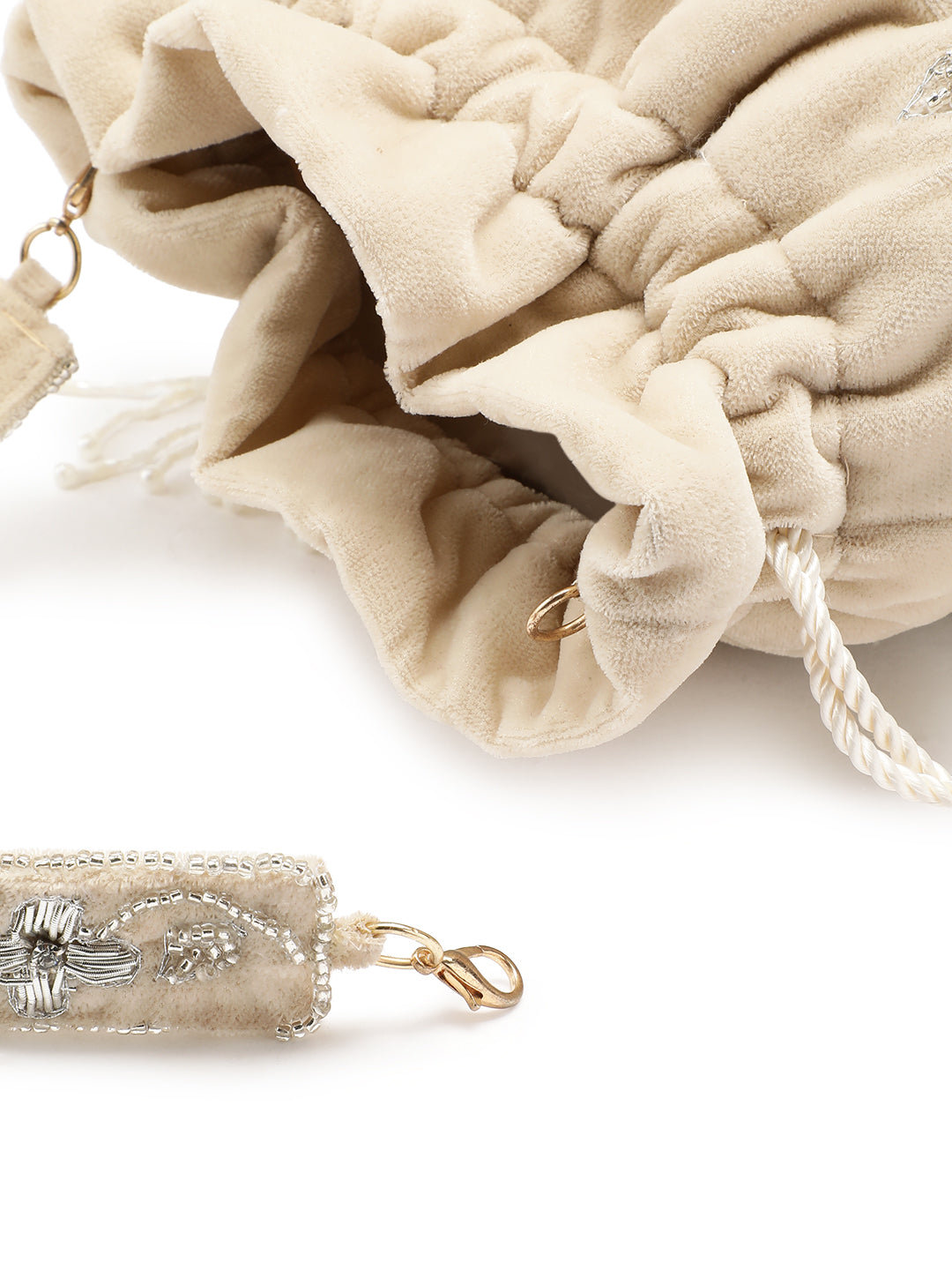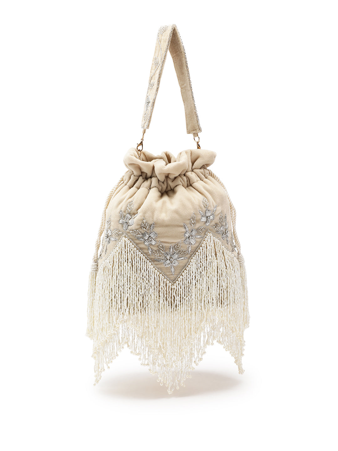 The Anekaant Ecru & Ivory Potli from the Dewdrop Fringe collection is a refined blend of heritage craftsmanship and contemporary elegance. Made from plush velvet with a soft inner lining, it features a metallic silver-embroidered base accented with subtle ivory detailing. The surface is adorned with floral zari work and finished with a deep V-shaped fringe embellished with beads, adding graceful movement and charm. It includes a single compartment with a drawstring closure and a detachable embroidered handle for versatile styling. Dimensions (L x H x W): 19 x 22 x 10 cm.