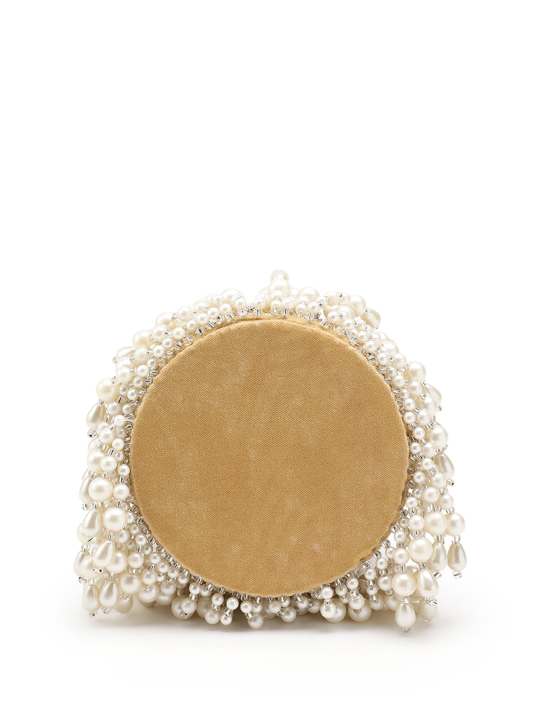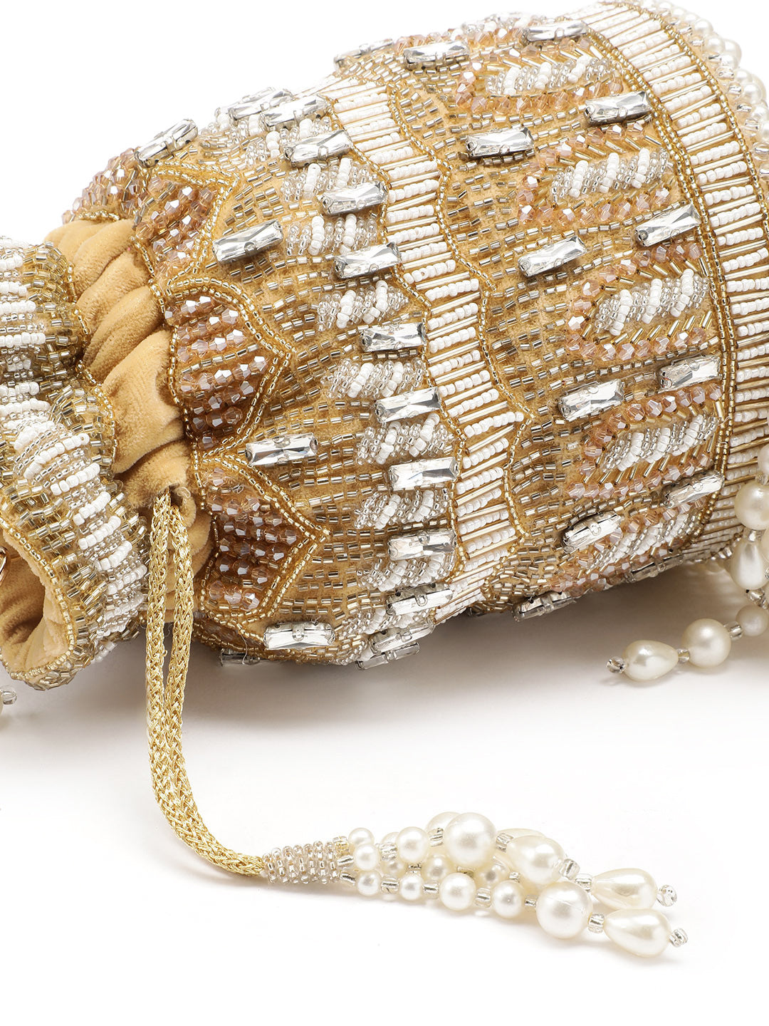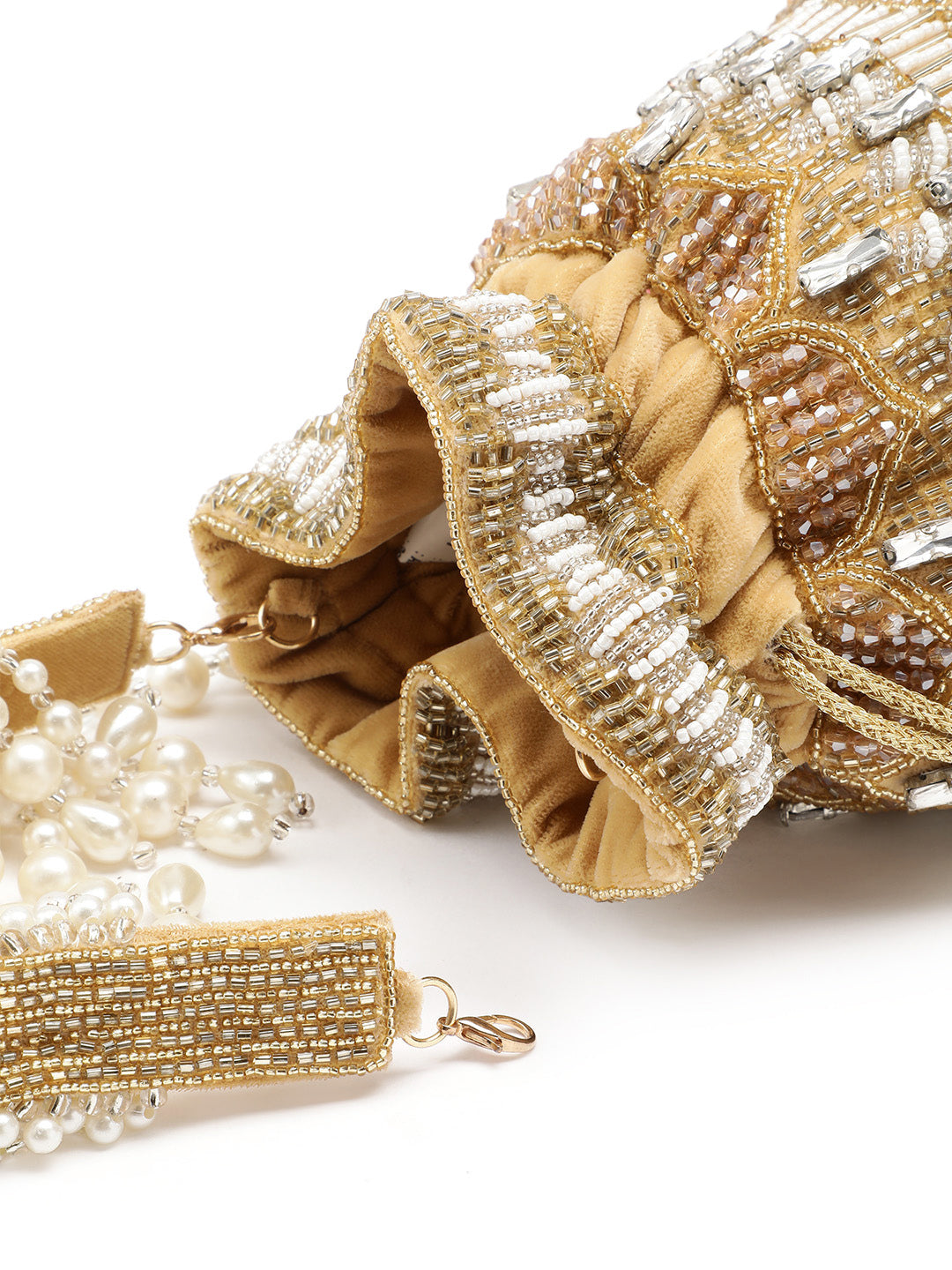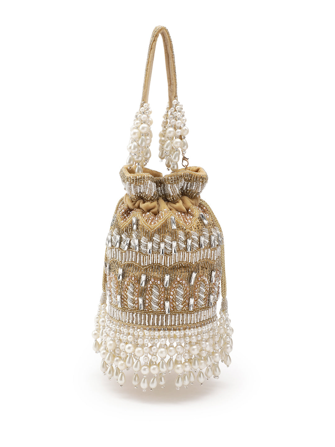 The Anekaant Camel Brown & Pearl White Potli from the Dewdrop Fringe collection is a luxurious blend of traditional elegance and intricate detailing. Crafted from soft velvet with a matching lining, it features a warm base enriched with ornate embellishments in soft white tones. The surface displays a zigzag and scallop border pattern adorned with silver bugle beads, adding a refined touch. Lush pearl drop fringes bring texture and graceful movement. Designed with a single main compartment and a secure drawstring closure, it also includes a detachable embellished handle for versatile styling.