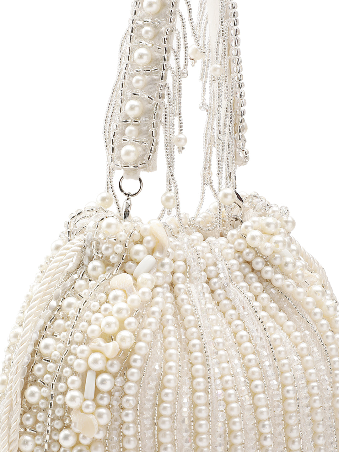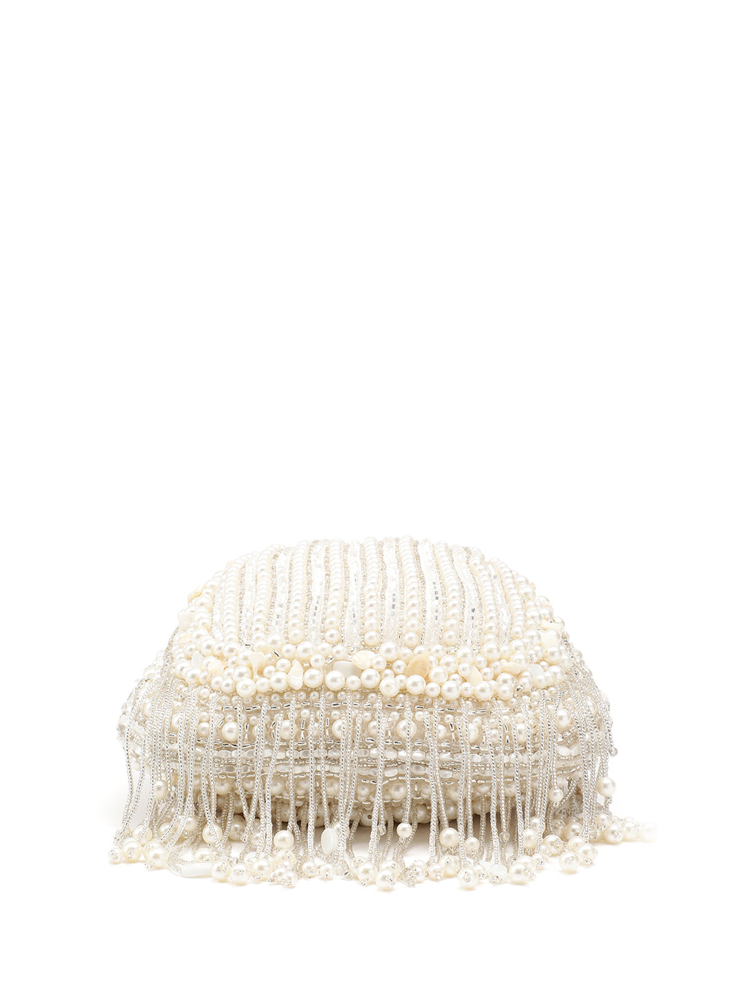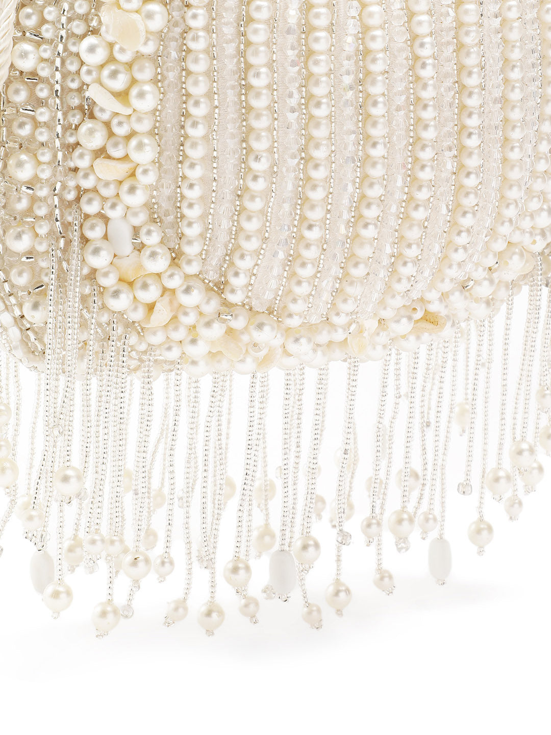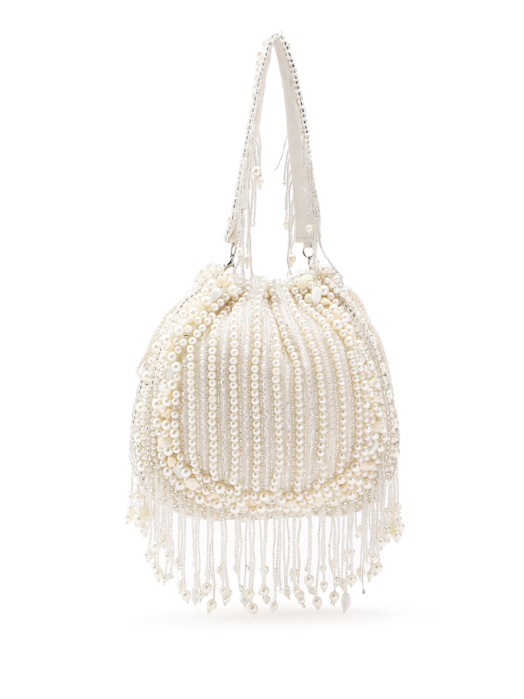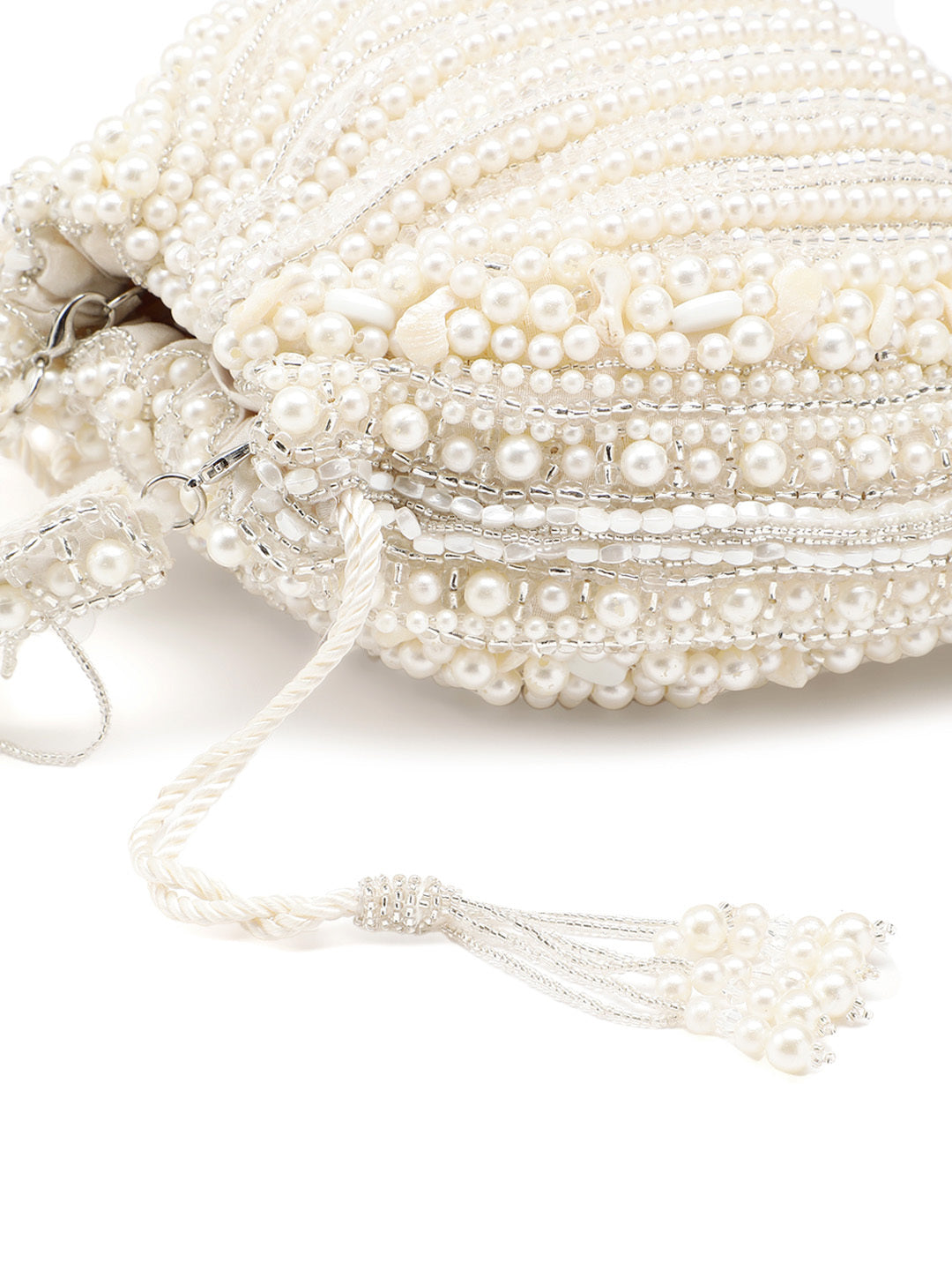 The Anekaant Pearl & Crystal White Potli from the Opal Thread collection is a refined blend of elegance and artistry. Crafted from premium faux silk with a coordinated lining, it features a soft palette of off-white and shimmering accents. The exterior showcases alternating vertical stripes of seed beads paired with intricate crystal clusters, creating a textured and eye-catching surface. A fringe of cascading pearls adds graceful movement. Designed with a single compartment and a secure drawstring closure, it also includes a detachable embellished handle for versatile styling.