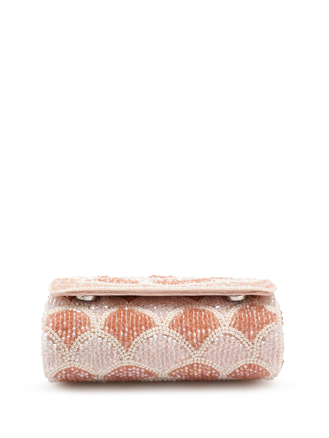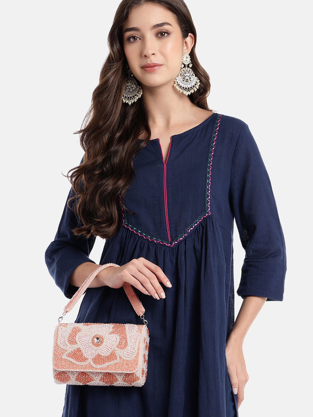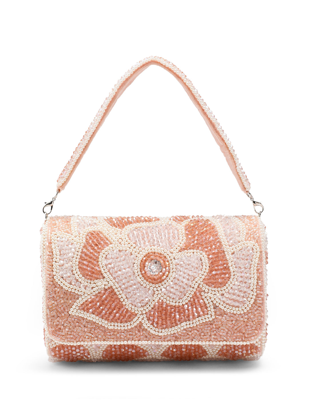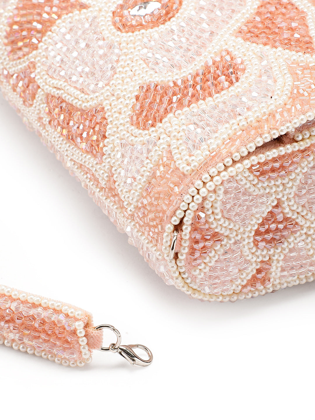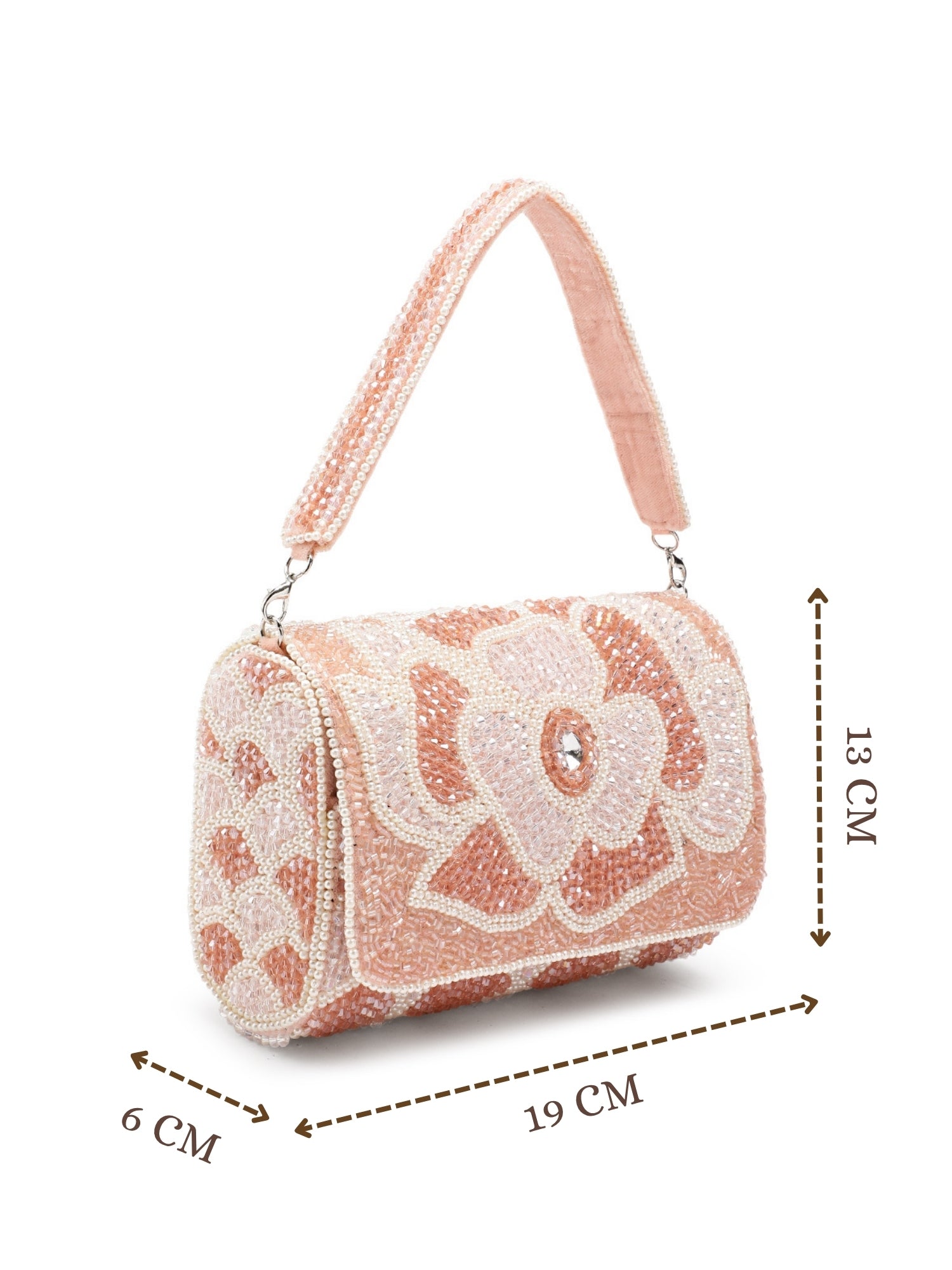The Anekaant Champagne Pink & Pearl White Clutch from the Blush & Bead collection is a refined blend of elegance and detail. Designed in a structured rectangular shape, it features a velvet exterior with a matching lining. The blush base is accented with off-white and champagne tones. A bold floral motif, embroidered and finished with crystal embellishments, adds artistic flair. Secured with a magnetic button closure, it includes a single compartment, an inner slip pocket, and a detachable embellished handle, as well as a metal chain for versatile styling.