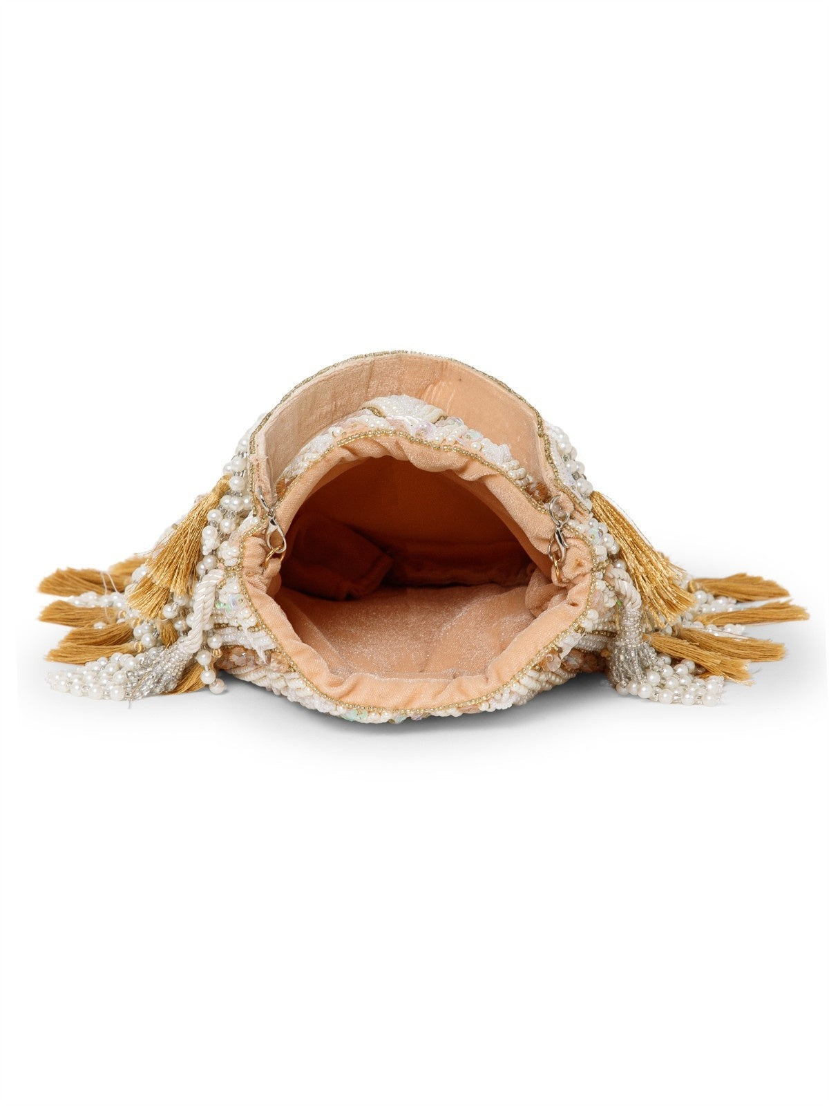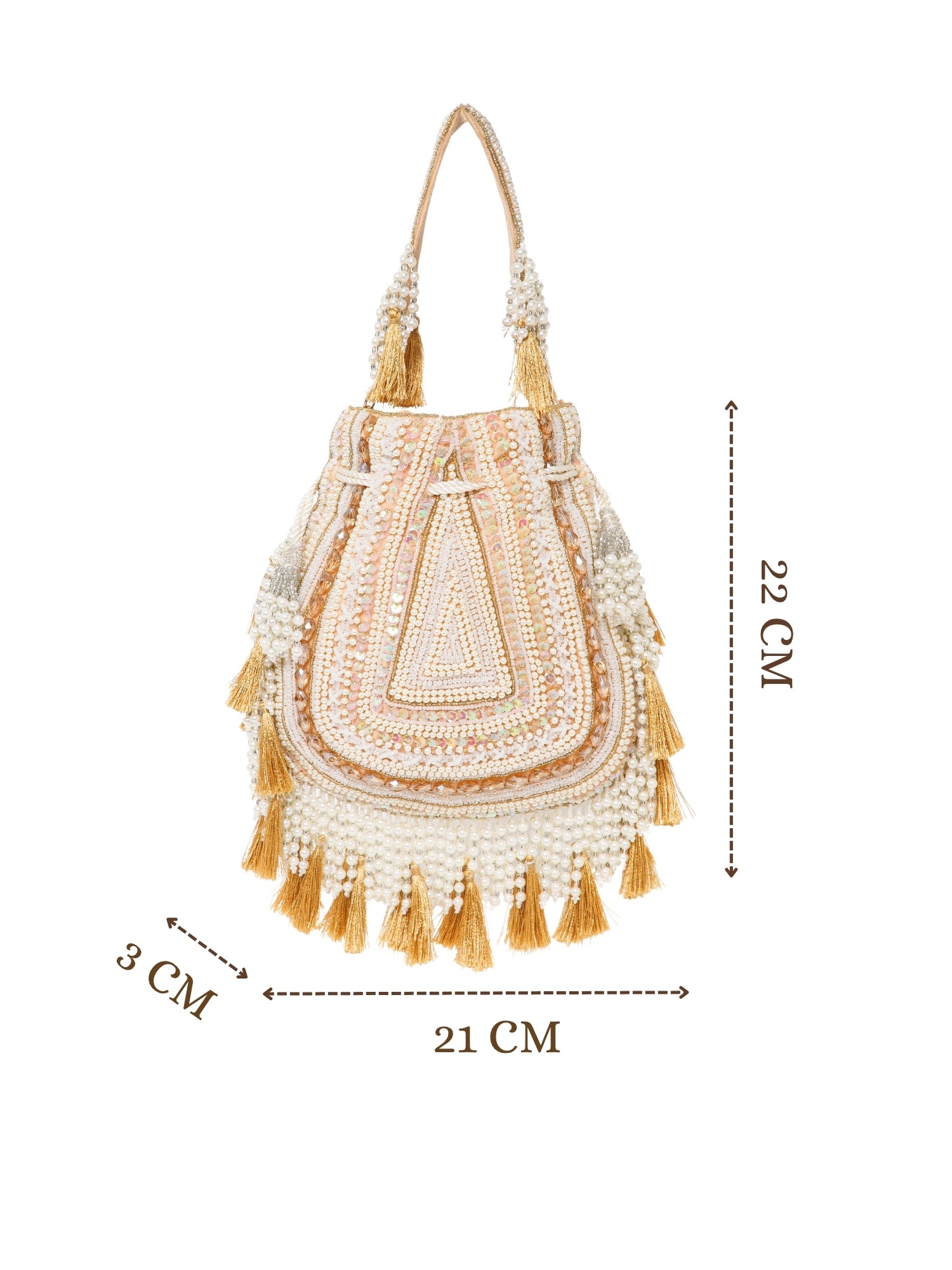 This Anekaant Potli from the Dewdrop Fringe Collection with a single compartment secured by a drawstring closure. Styled on a champagne gold base with cream and crystal beadwork, it is highlighted with iridescent sequins and pastel tassels.The velvet foundation is detailed with pearls, sequins, and metallic cords, while a concentric triangle layout in layered beadwork is edged with pearl tassels and thread fringes for a rich, ornate appeal. It includes an embroidered detachable handle, finished with beaded tassels for versatile styling. Dimensions (L x H x W): 21 x 22 x 3 cm.