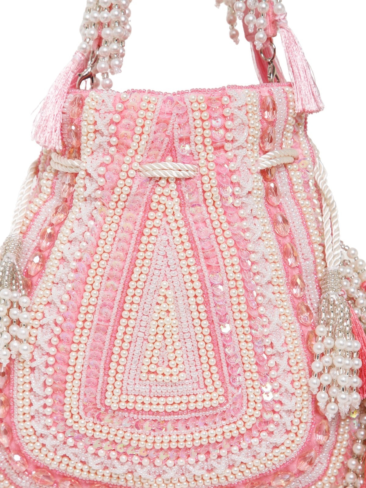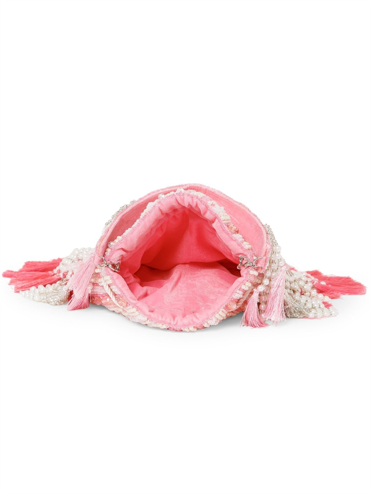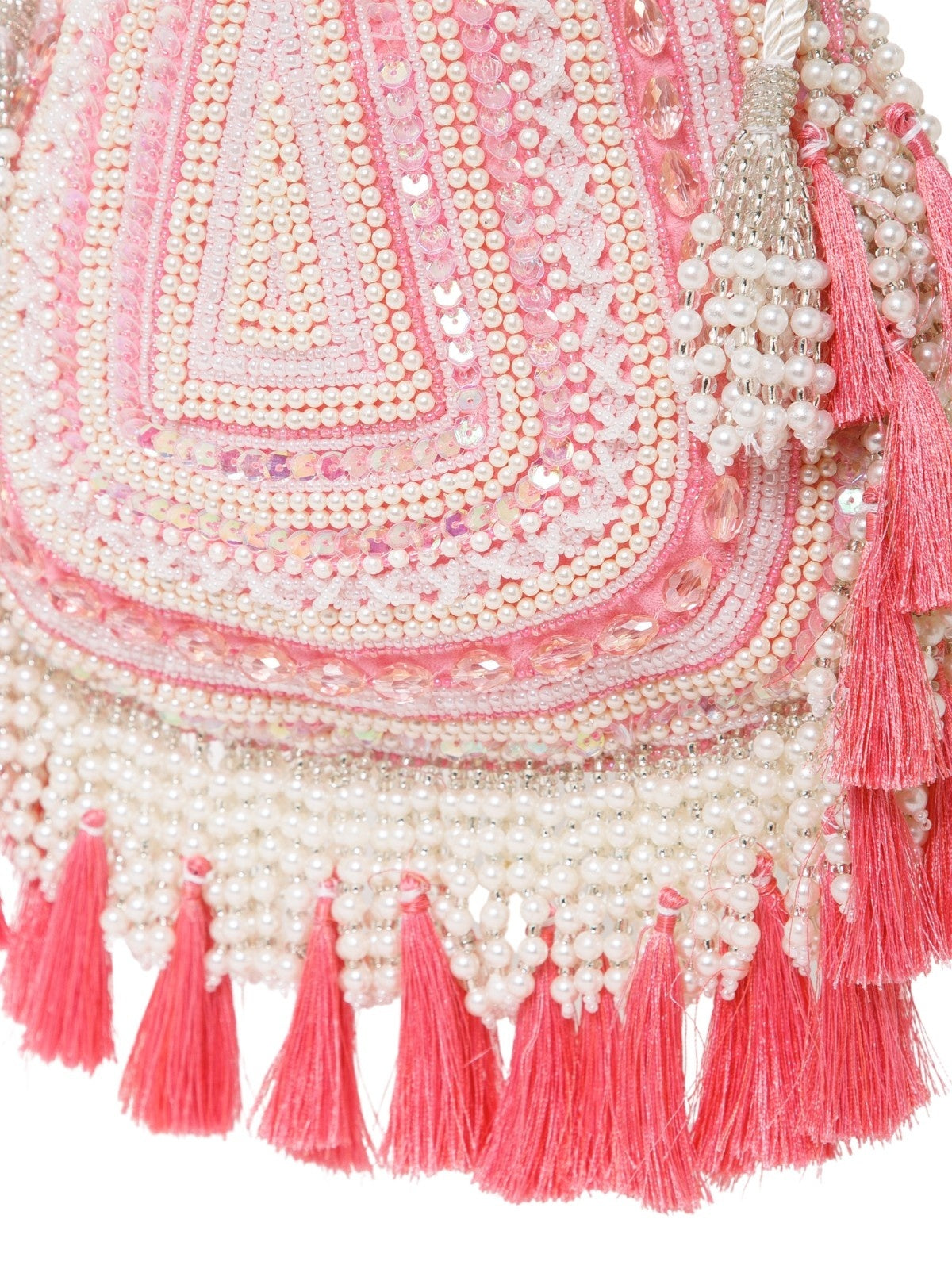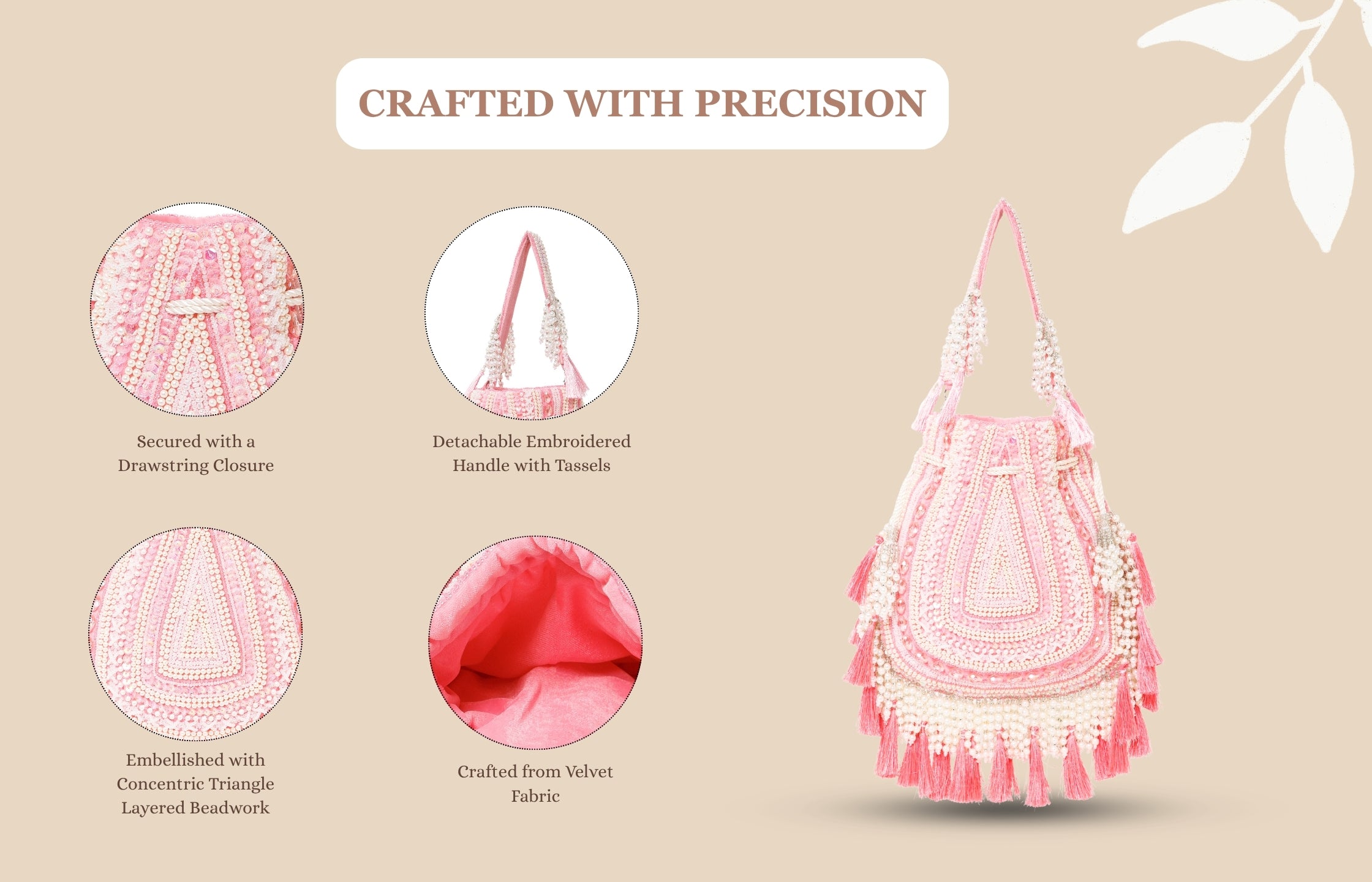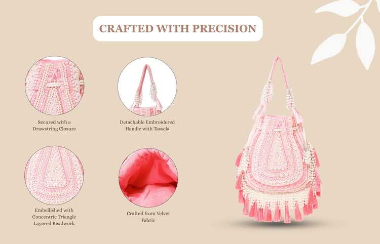 This Anekaant Potli from the Dewdrop Fringe Collection with a single compartment secured by a drawstring closure. Styled on a coral pink base with cream and silver beadwork, it is accented with iridescent sequins and pastel tassels. The velvet foundation is detailed with pearls, sequins, and metallic cords, while a concentric triangle layout in layered beadwork is edged with pearl tassels and thread fringes for a rich, ornate appeal. It includes an embroidered detachable handle, finished with beaded tassels for versatile styling.
