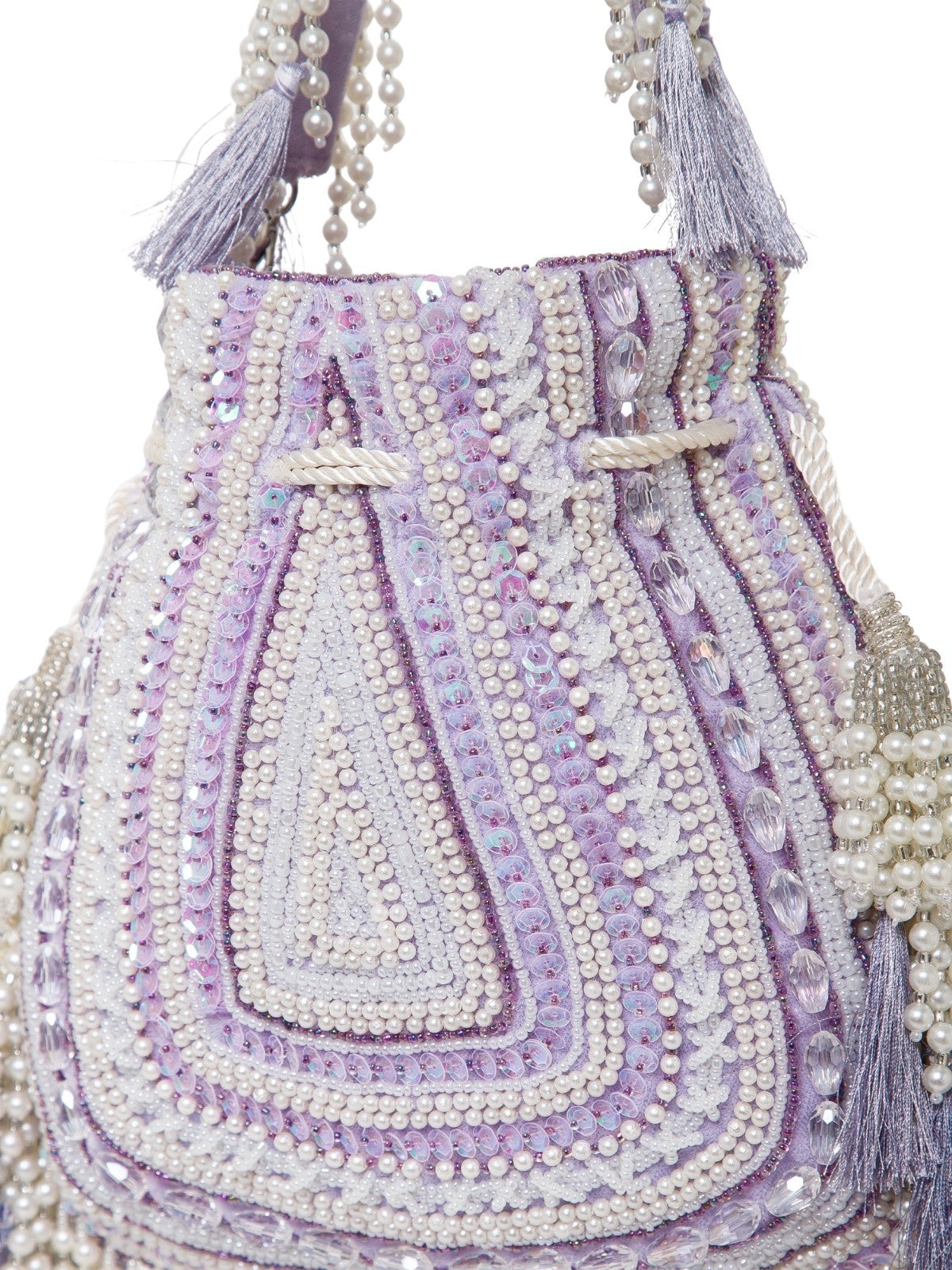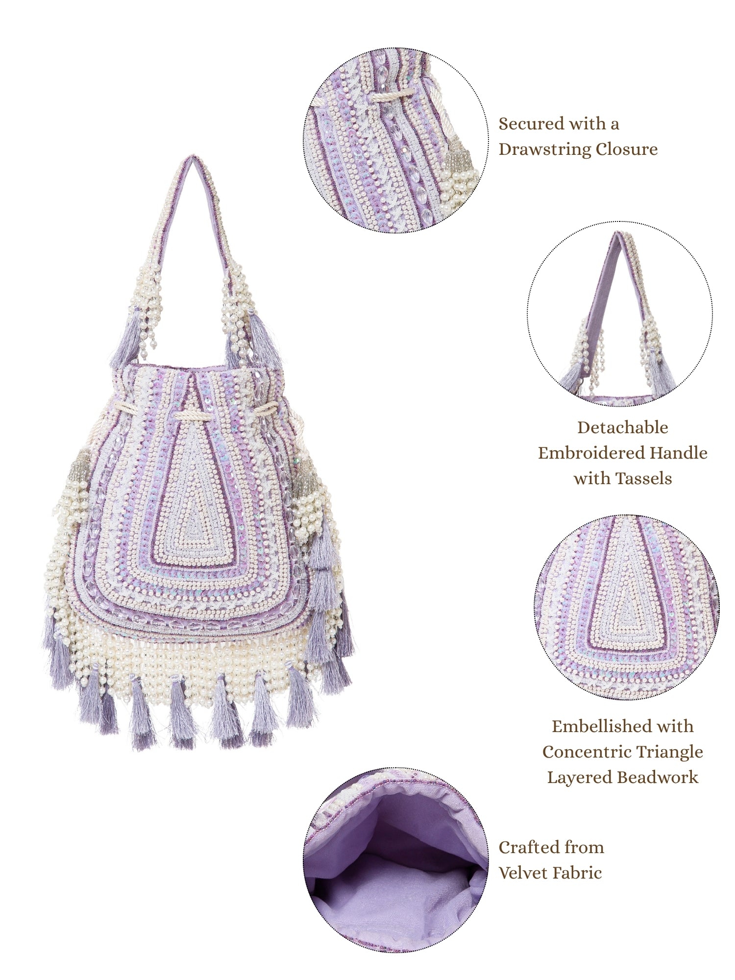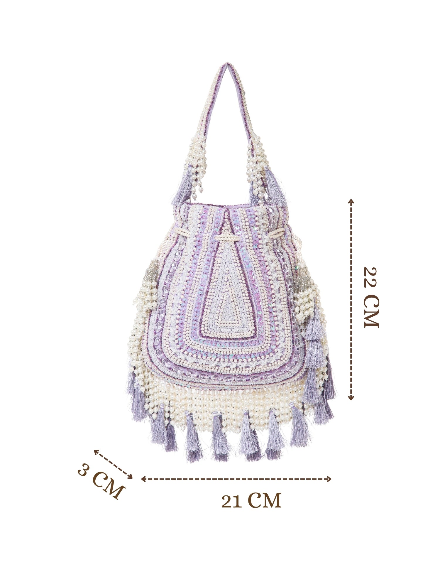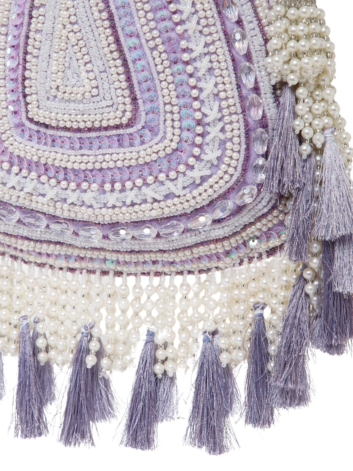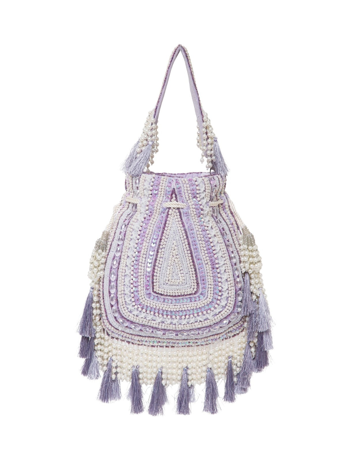 This Anekaant Potli from the Dewdrop Fringe Collection with a single compartment secured by a drawstring closure. Styled on a soft lavender base with cream and silver beadwork, it is accented with iridescent sequins and pastel tassels. The velvet foundation is detailed with pearls, sequins, and metallic cords, while a concentric triangle layout in layered beadwork is edged with pearl tassels and thread fringes for a rich, ornate appeal. It includes an embroidered detachable handle, finished with beaded tassels for versatile styling.