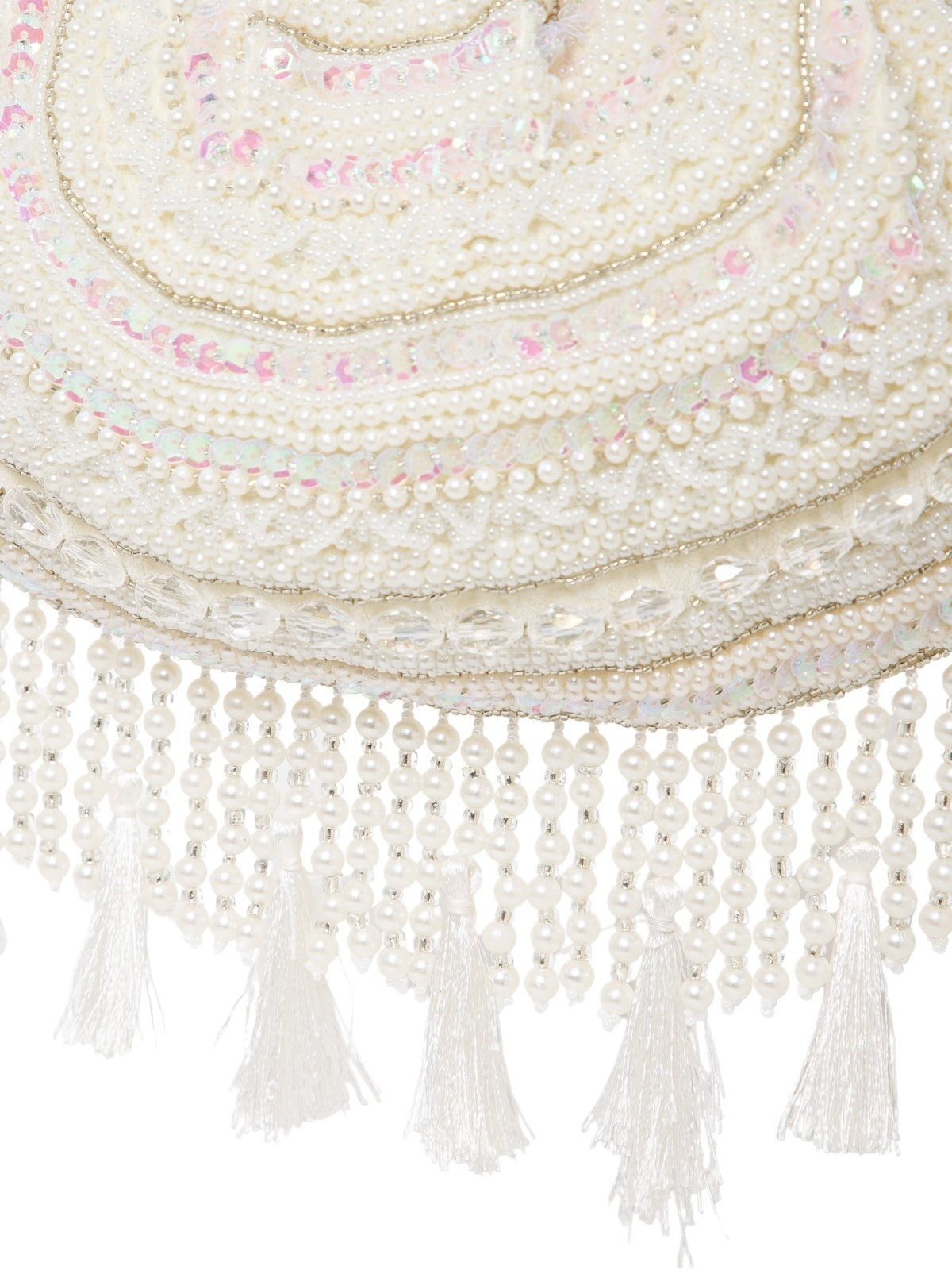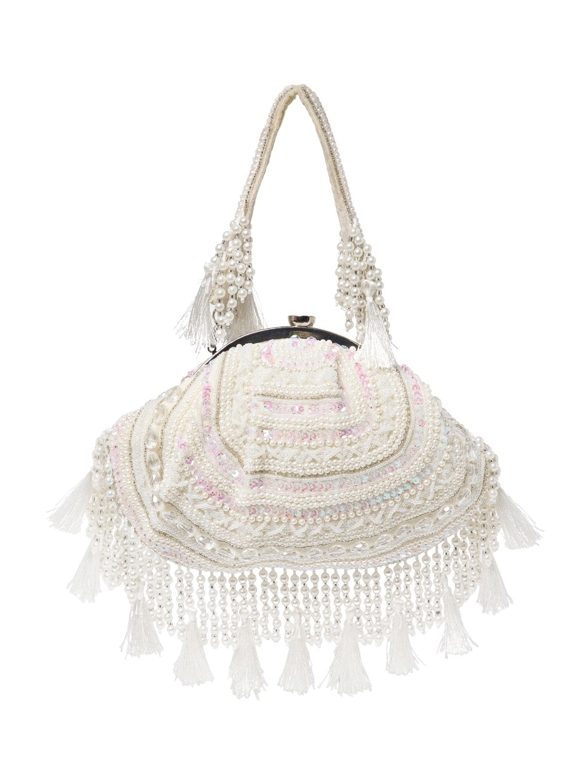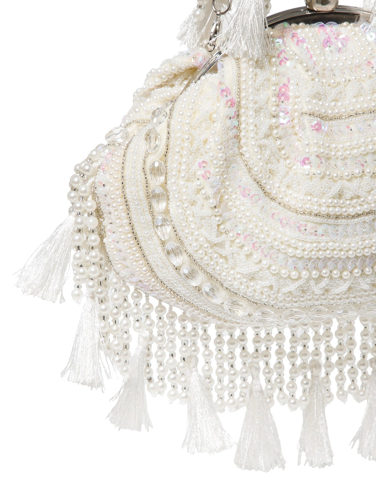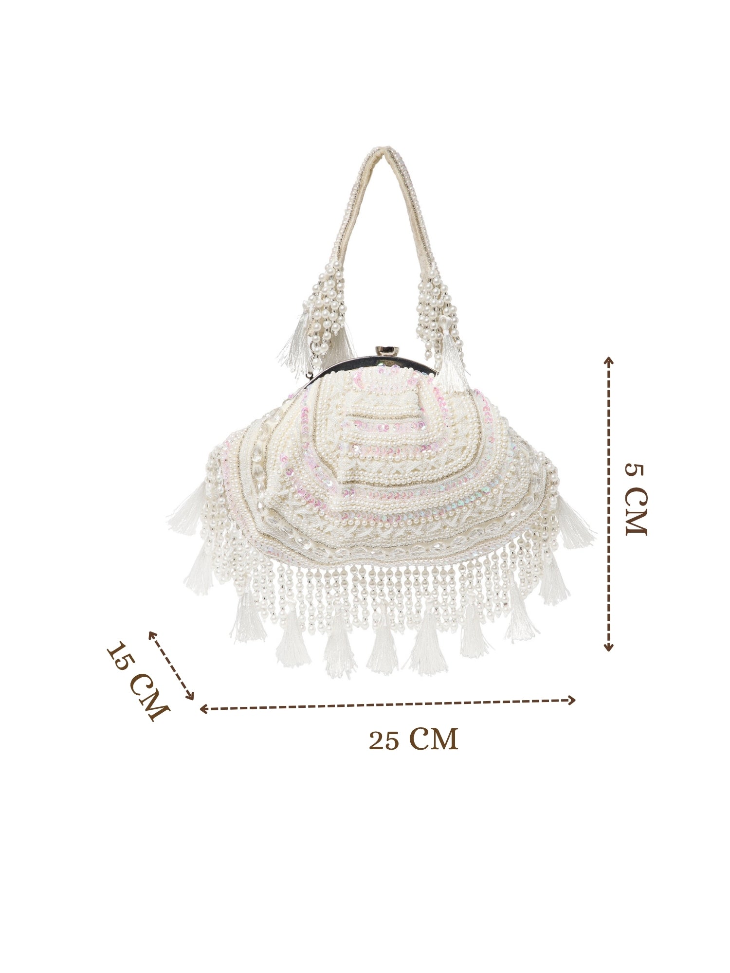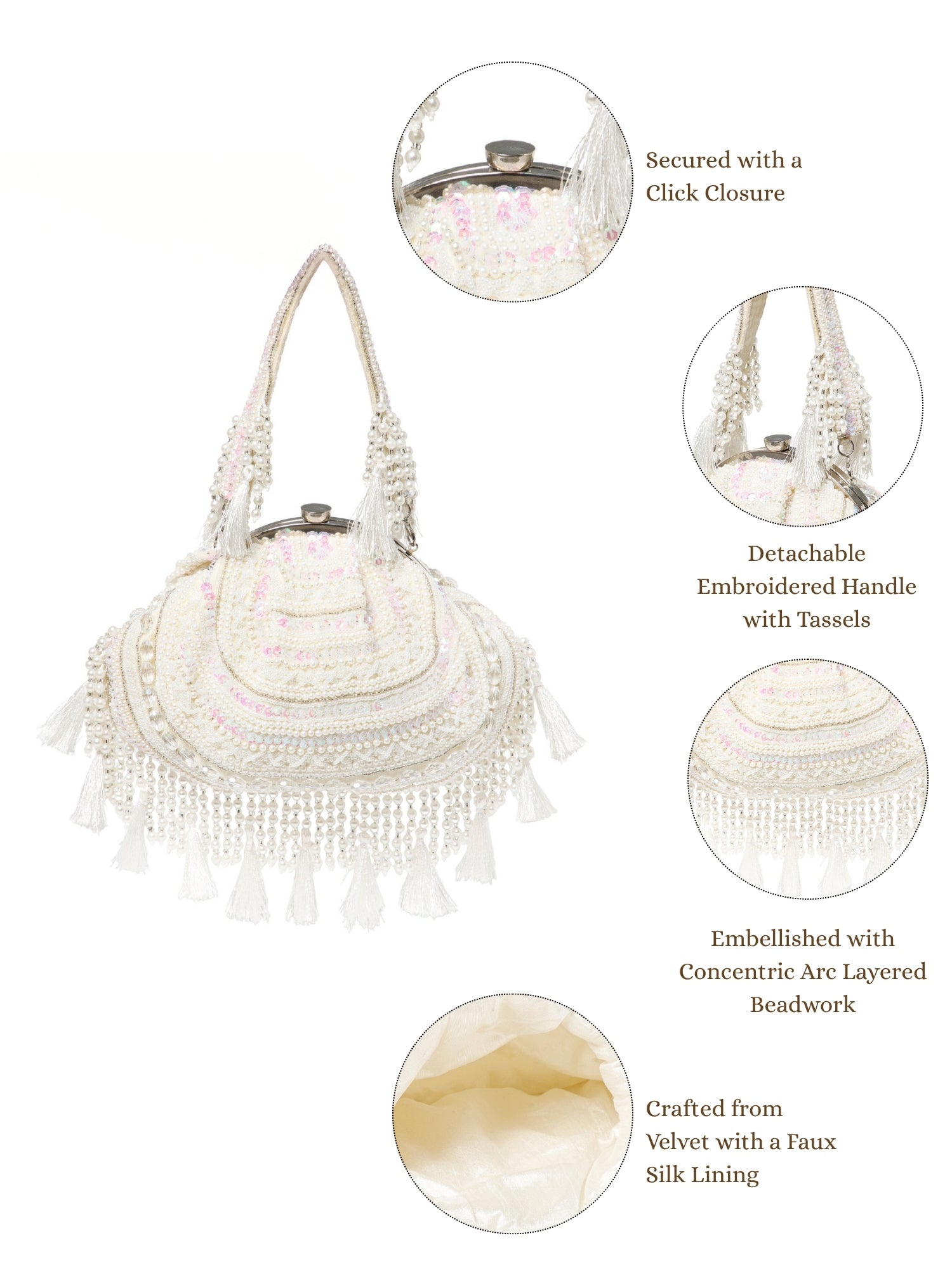 This Anekaant Clutch from the Dewdrop Fringe Collection features a main compartment secured with a click closure. Designed in ivory cream with pearl white accents and finished with elegant white tassels, it serves as a refined festive accessory.The velvet base is adorned with faux pearls, sequins, and metallic cords, while an intricate concentric arc pattern in layered beadwork is enhanced with crystal highlights and sequin accents. The design is further elevated with pearl fringes and tassel details along the base and handles. A detachable embroidered handle provides versatile styling options. Dimensions (L x H x W): 25 x 5 x 15 cm.