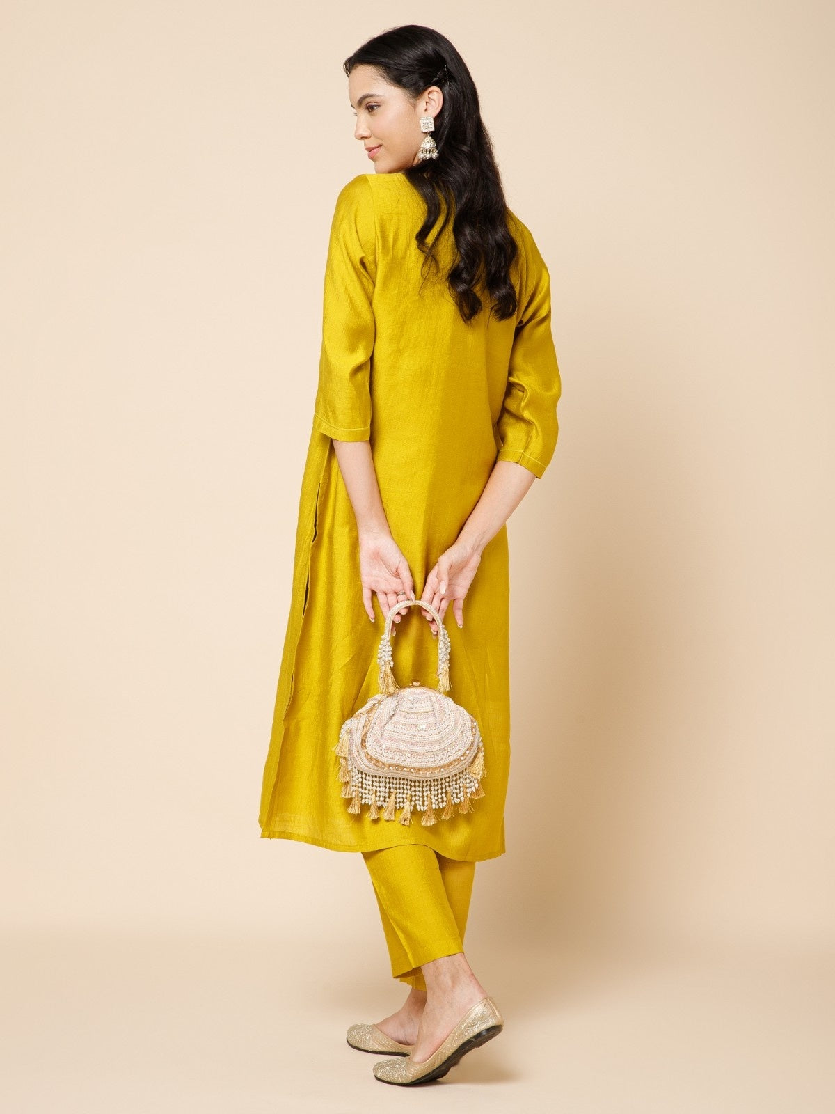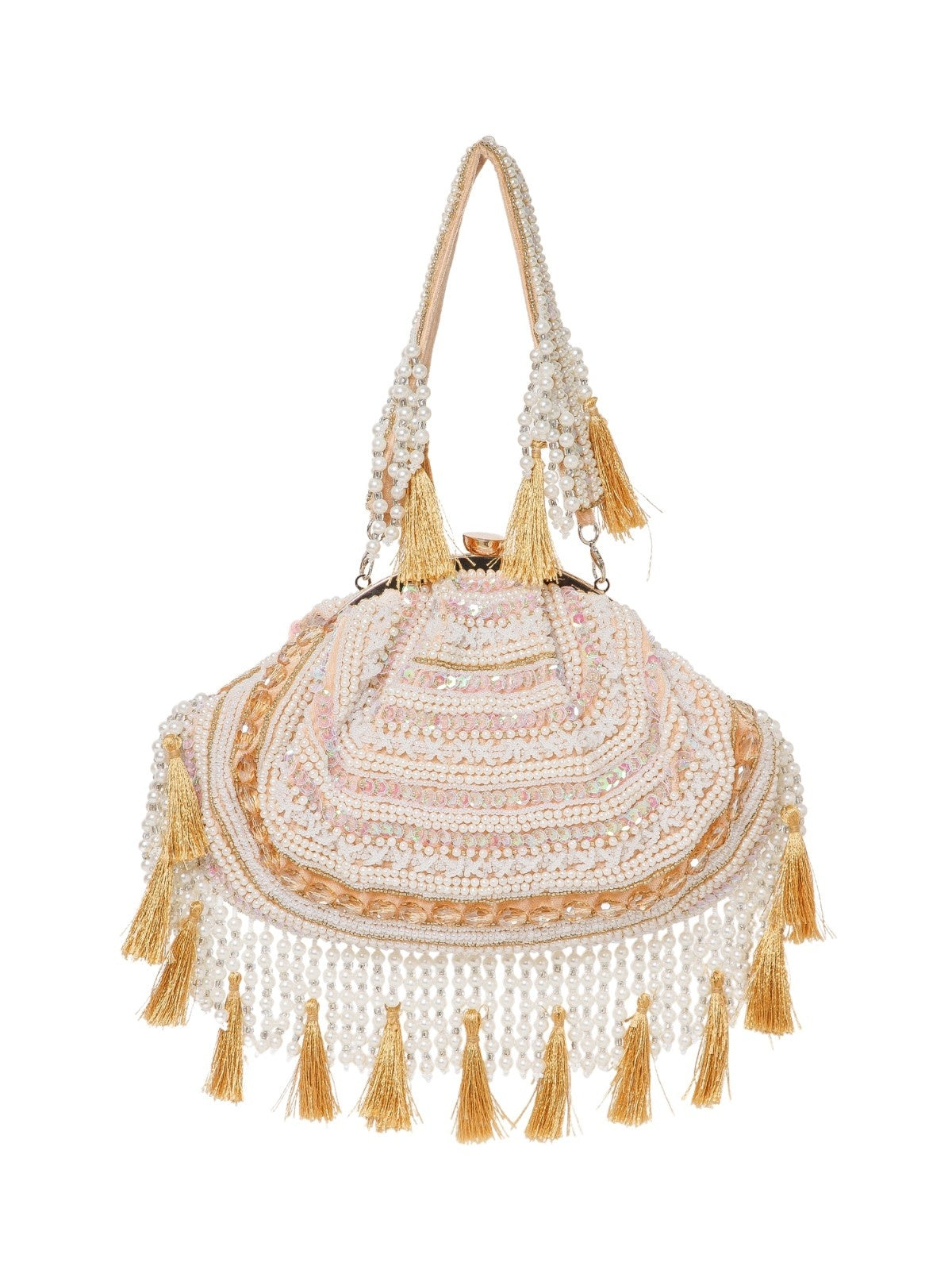 This Anekaant Clutch from the Dewdrop Fringe Collection features a main compartment secured with a click closure. Designed in champagne gold with pearl white accents and finished with elegant white tassels, it serves as a refined festive accessory. The velvet base is adorned with faux pearls, sequins, and metallic cords, while an intricate concentric arc pattern in layered beadwork is enhanced with crystal highlights and sequin accents. The design is further elevated with pearl fringes and tassel details along the base and handles. A detachable embroidered handle provides versatile styling options. Dimensions (L x H x W): 25 x 5 x 15 cm.