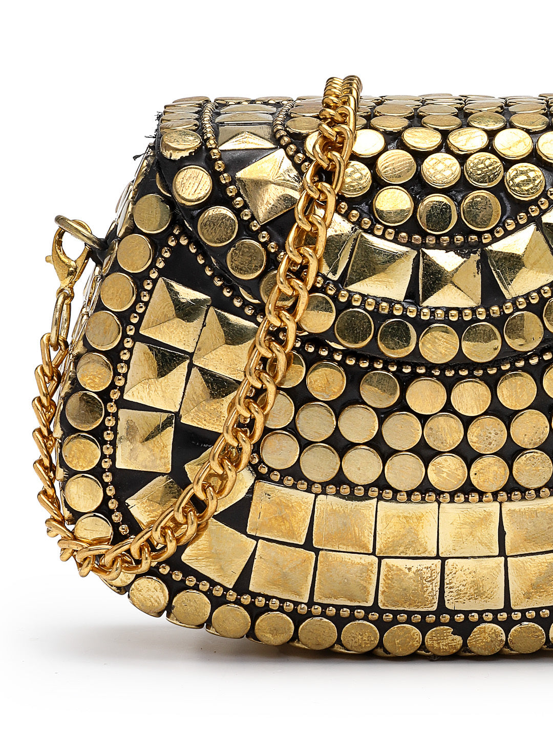 This Anekaant Clutch from the Metal Mirage Collection is styled in a refined half-moon silhouette with a durable hard case and enamel base. The black surface is elevated with metallic gold accents and richly embellished with gold-tone studs in circular, square, and pyramid forms, complemented by a sleek gold chain detail. Its design showcases bold geometric patterns arranged in concentric arcs and structured grids, producing a striking mosaic-inspired effect. Finished with a detachable sling strap for versatile carrying, this clutch is an ideal choice for weddings, festive occasions, and evening gatherings. Dimensions (L x H x W):11 x 8 x 4 cm.
