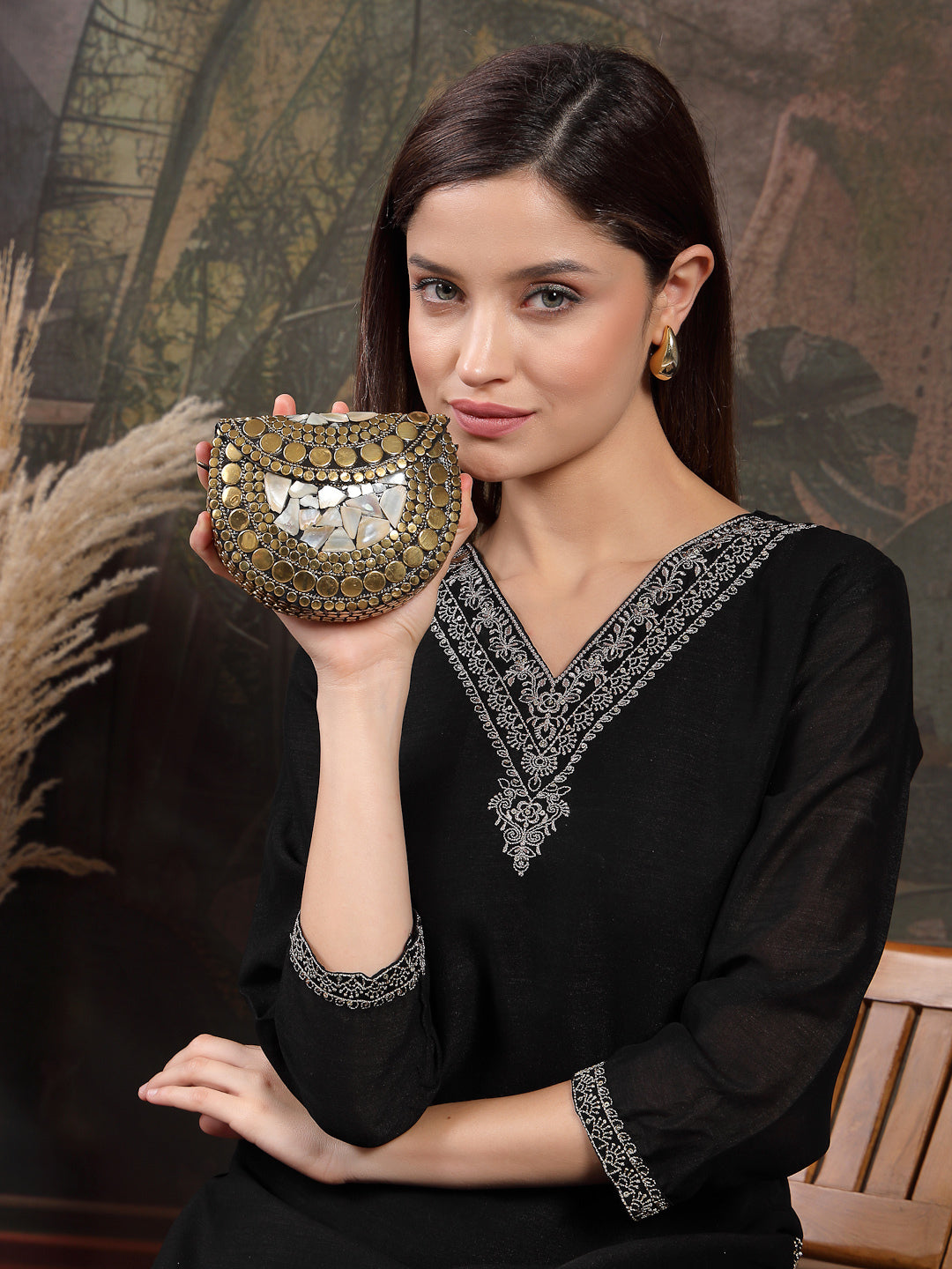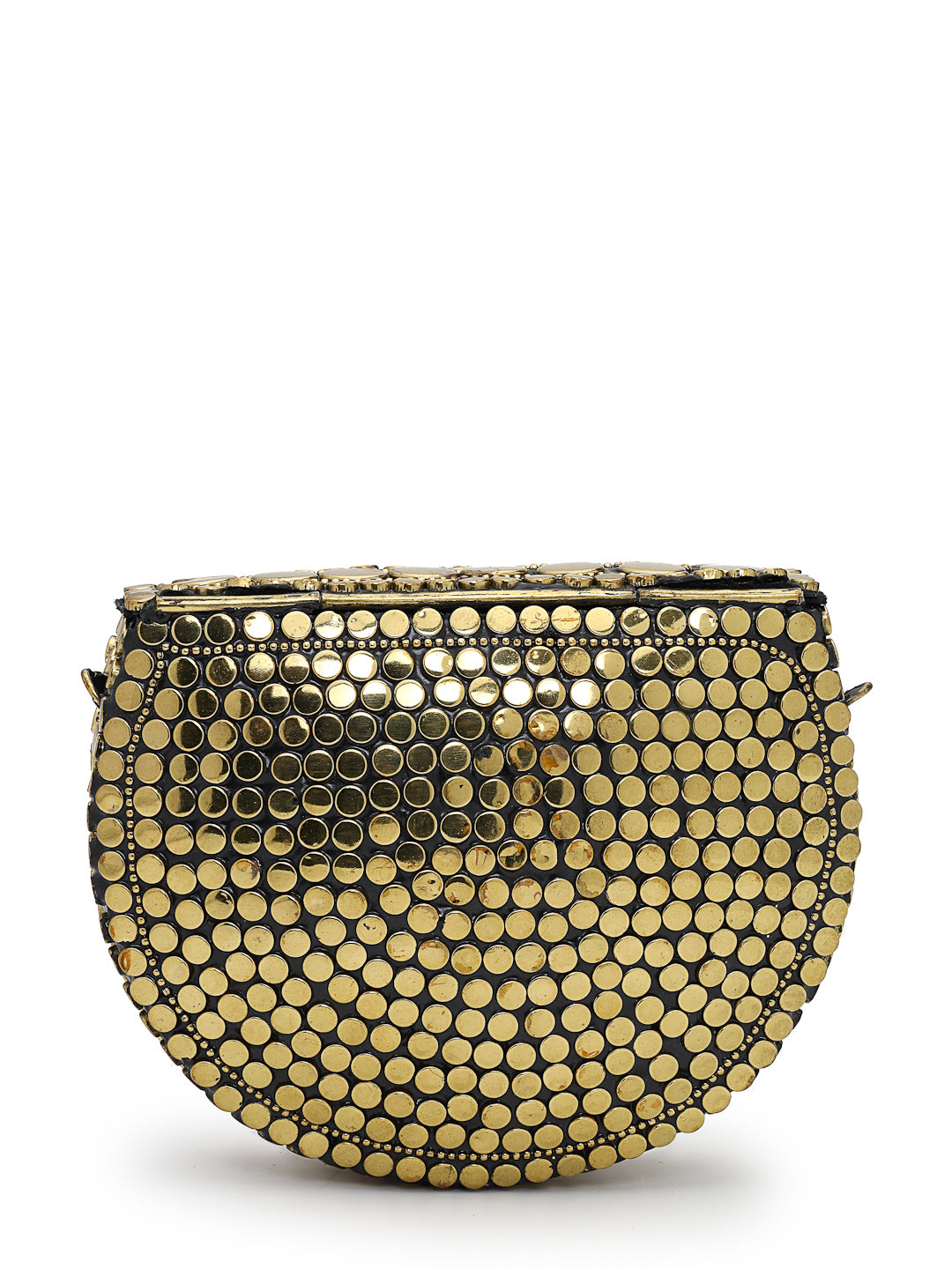 This Anekaant Clutch from the Metal Mirage Collection is presented in a half-moon silhouette with one compartment secured by a reliable click-lock closure. The black enamel hard case features metallic gold and iridescent white highlights, embellished with gold-tone studs and mother-of-pearl shell inlays. Its design showcases concentric circular detailing that frames a central mosaic of irregular shell pieces, creating a distinctive artistic appeal. Completed with a detachable sling strap for adaptable styling, this clutch is an exquisite accessory for weddings, festive celebrations, and evening occasions. Dimensions (L x H x W):14 x 12 x 4 cm.