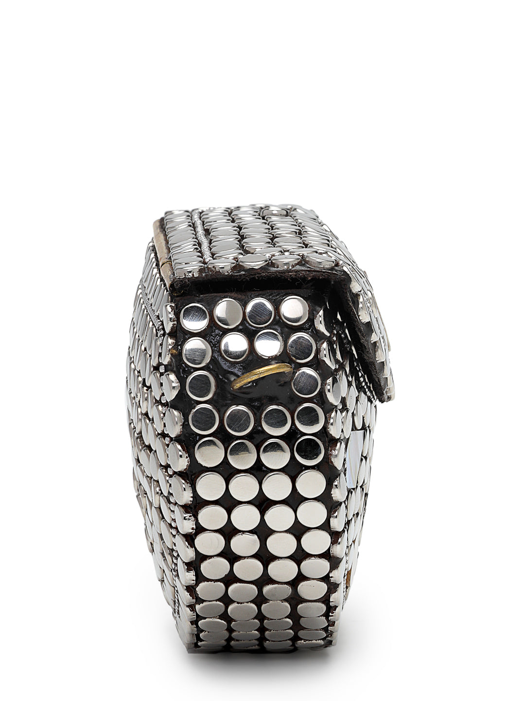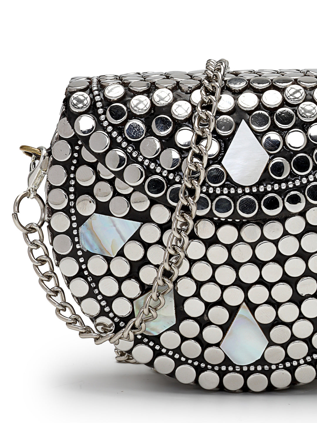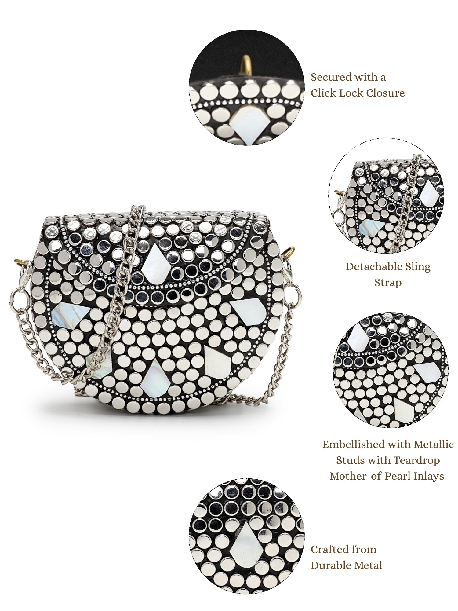 This Anekaant Clutch from the Metal Mirage Collection is presented in a sophisticated half-moon silhouette with a single compartment secured by a sleek click closure. The black enamel hard case, accented with silver and iridescent white highlights, is artfully embellished with metallic studs, mother-of-pearl inlays, and a silver-tone chain detail. Its design showcases concentric rows of polished domes enhanced with teardrop and geometric motifs, creating a striking mosaic effect. Completed with a detachable sling strap for versatile styling, this clutch is an ideal accessory for evening events, festive celebrations, and wedding occasions. Dimensions (L x H x W):11 x 9 x 4 cm.