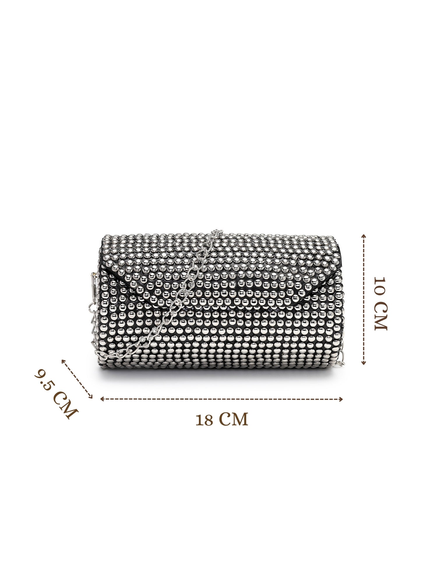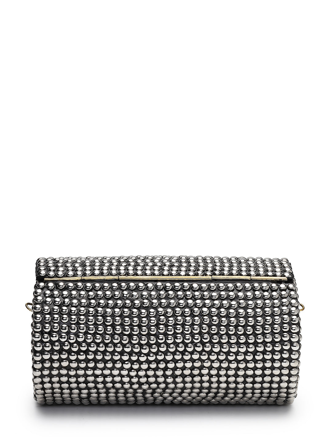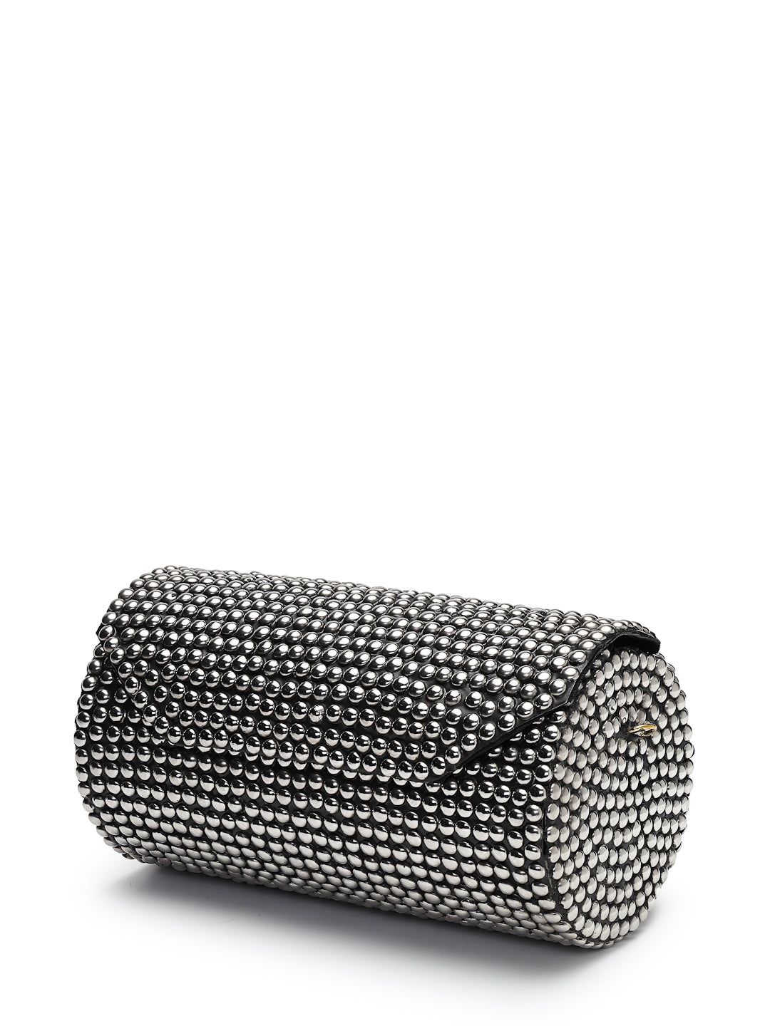 This Anekaant Clutch from the Metal Mirage Collection is designed in a sleek cylindrical silhouette with a hard case construction and a secure enamel base. Showcasing a striking black surface with metallic silver highlights, it is adorned with polished dome studs arranged in a dense, grid-like pattern for a bold contemporary appeal. Finished with a detachable sling strap, this clutch offers both statement style and functional ease, making it an ideal choice for parties, festive occasions, and evening gatherings. Dimensions (L x H x W):18 x 10 x 9.5 cm.