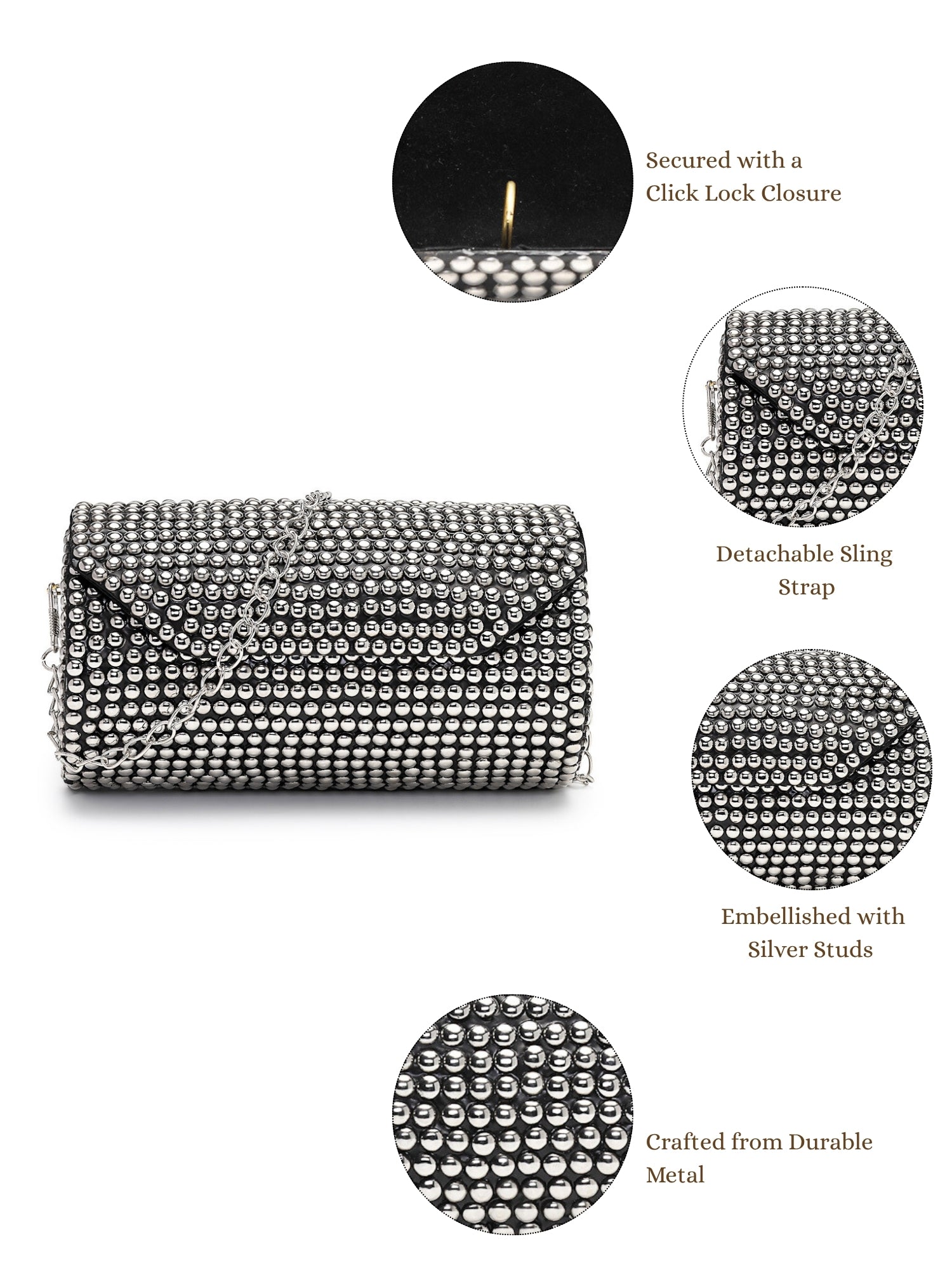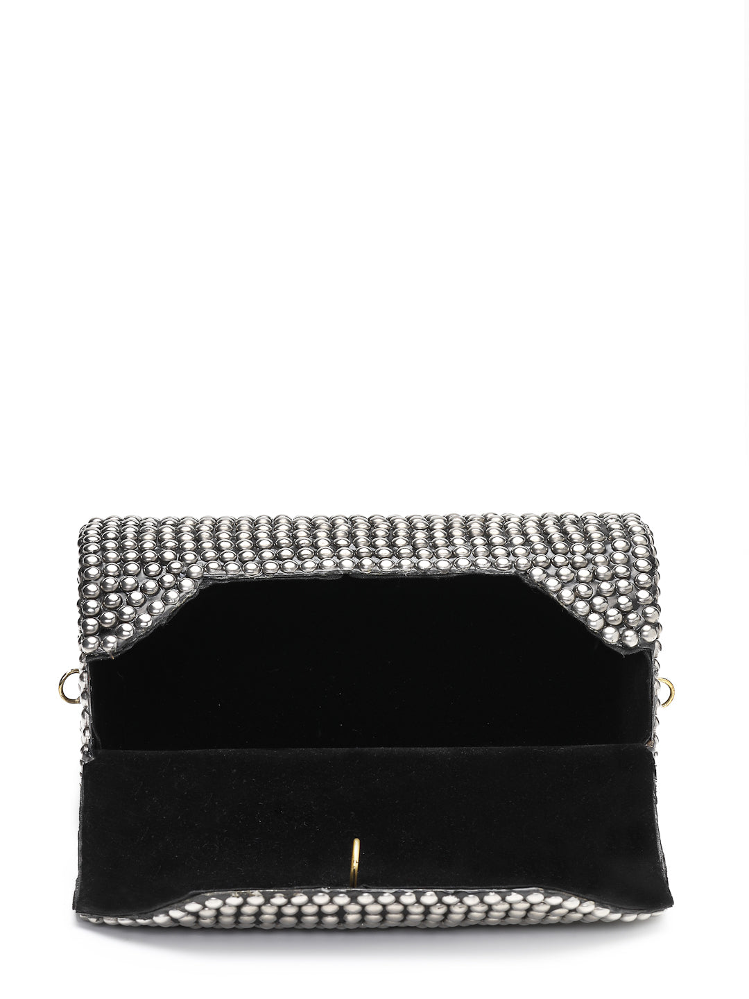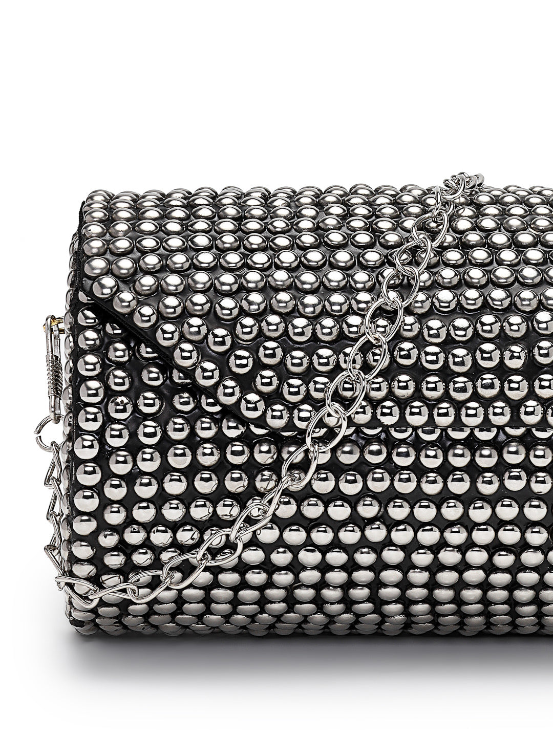 This Anekaant Clutch from the Metal Mirage Collection is designed in a sleek cylindrical silhouette with a hard case construction and a secure enamel base. Showcasing a striking black surface with metallic silver highlights, it is adorned with polished dome studs arranged in a dense, grid-like pattern for a bold contemporary appeal. Finished with a detachable sling strap, this clutch offers both statement style and functional ease, making it an ideal choice for parties, festive occasions, and evening gatherings. Dimensions (L x H x W):18 x 10 x 9.5 cm.