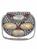 This designer mosaic metal shell halfmoon clutch with stone work has one main compartment with flap closure and a detachable metal chain. Can also be used as a sling bag.