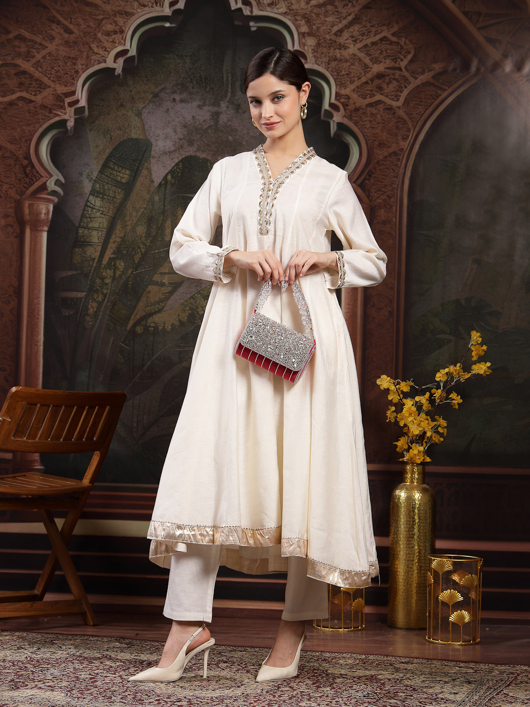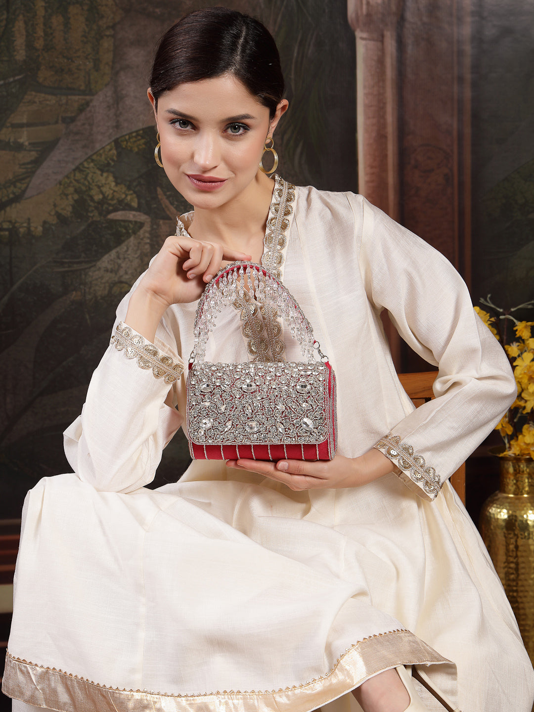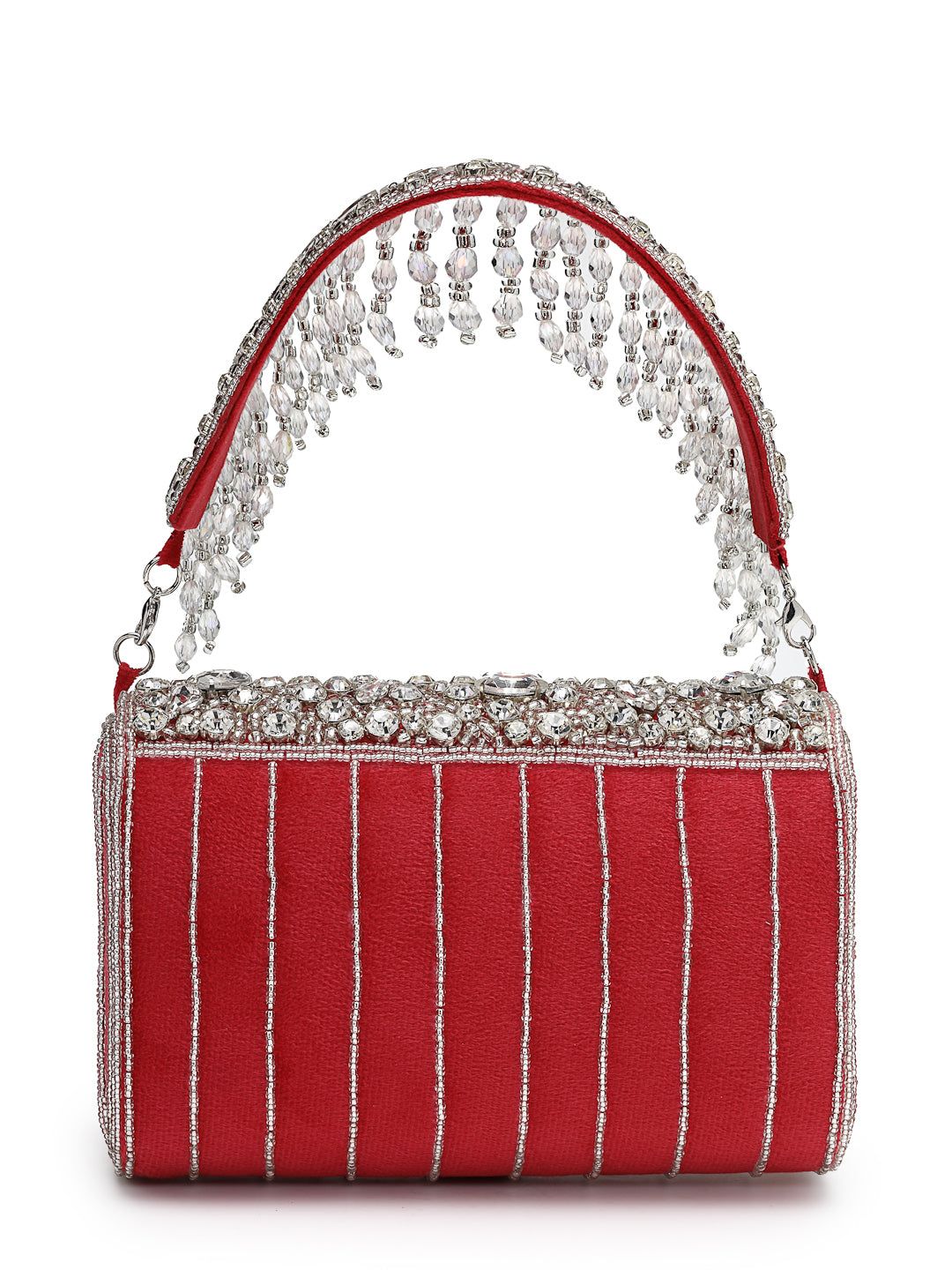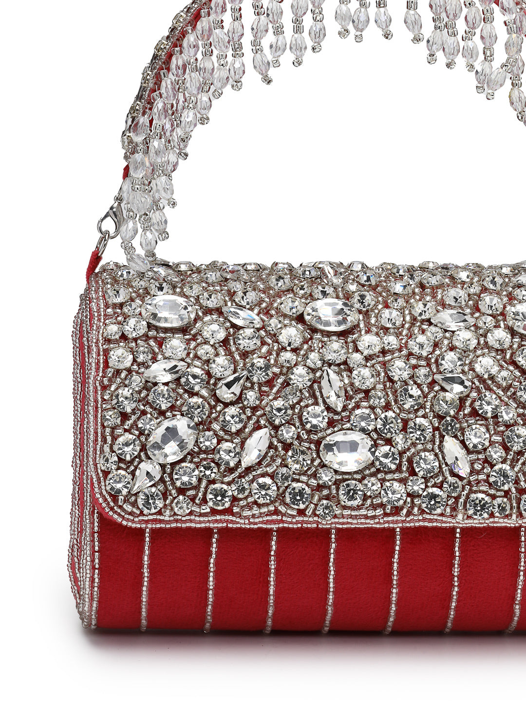 This Anekaant Clutch from the Crystal Cascade Collection is designed in a timeless rectangular silhouette with a spacious main compartment secured by a magnetic button closure. Crafted on a deep pink velvet base with silver accents, it is richly embellished with multi-shaped rhinestones, crystals, and seed beads. The flap features a dense cluster of sparkling stones, complemented by vertical bead strip detailing at the base. An ornate handle with cascading faceted bead fringes enhances its statement appeal, while the detachable design adds versatility. Perfect for weddings, evening events, and festive occasions, this clutch combines elegance with craftsmanship. Dimensions (L x H x W):18.5 x 12.5 x 6.5 cm.