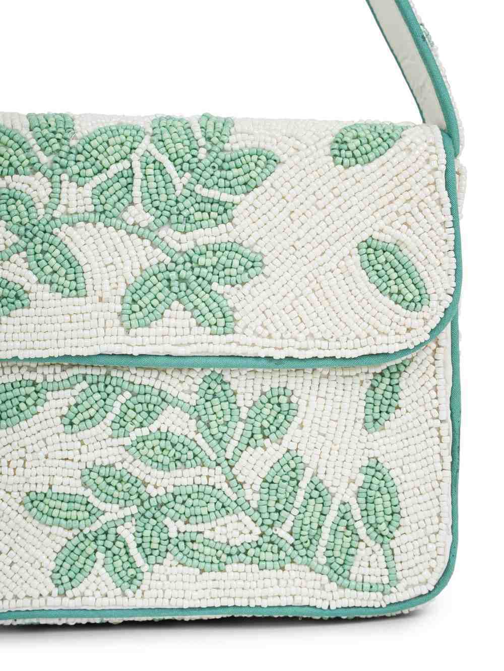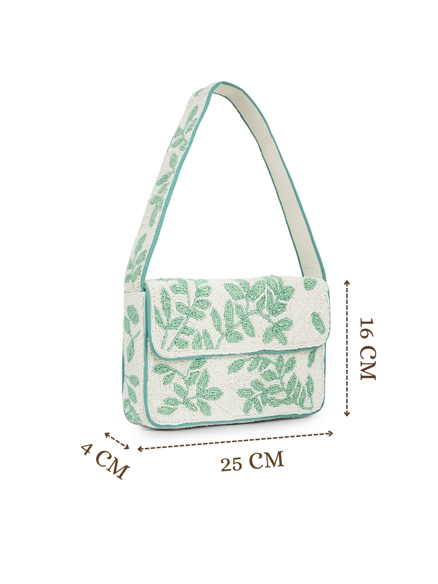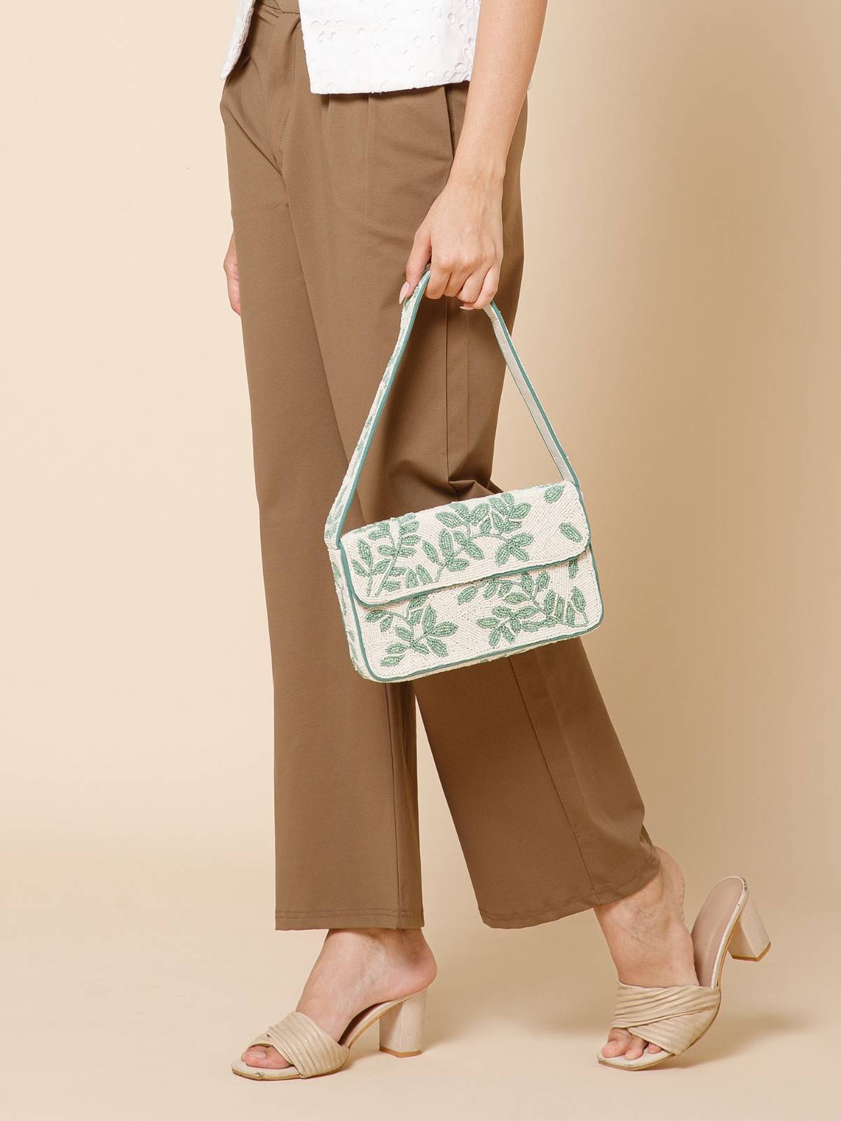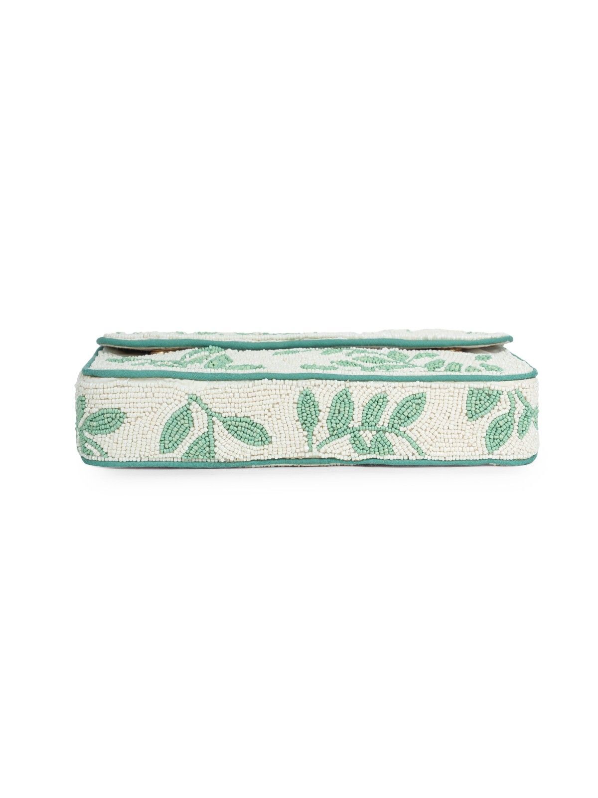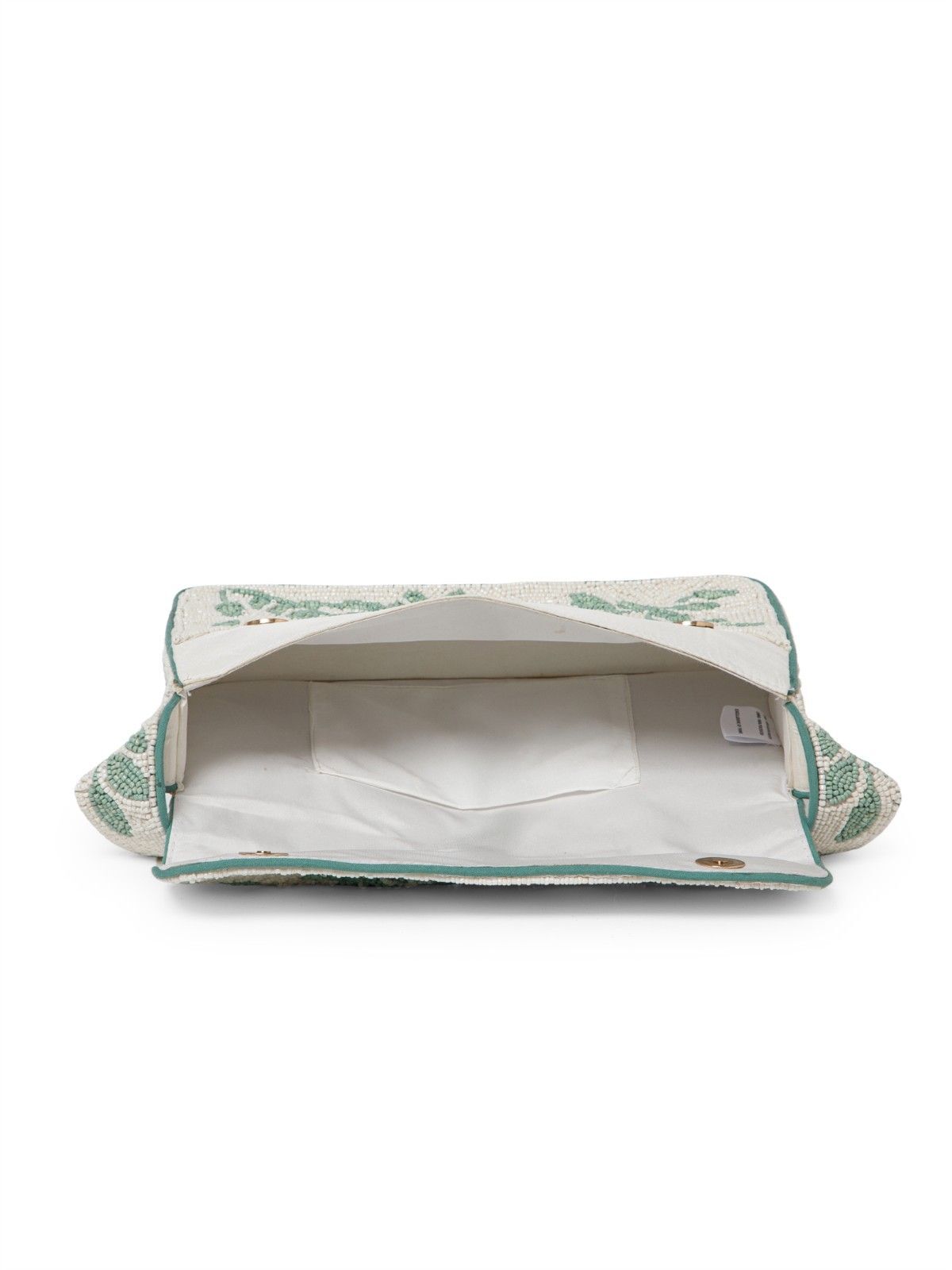 This Anekaant Clutch from the Beaded Botanica Collection features a main compartment secured with a magnetic button closure. Styled on an ivory base with sage green accents, it offers a sophisticated botanical aesthetic.