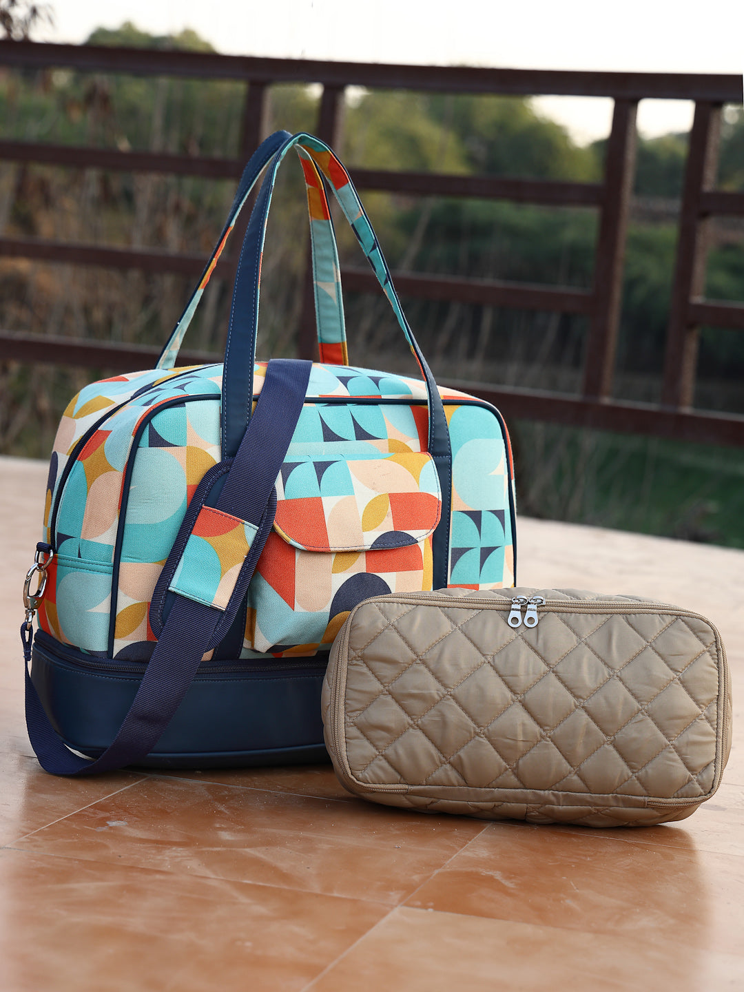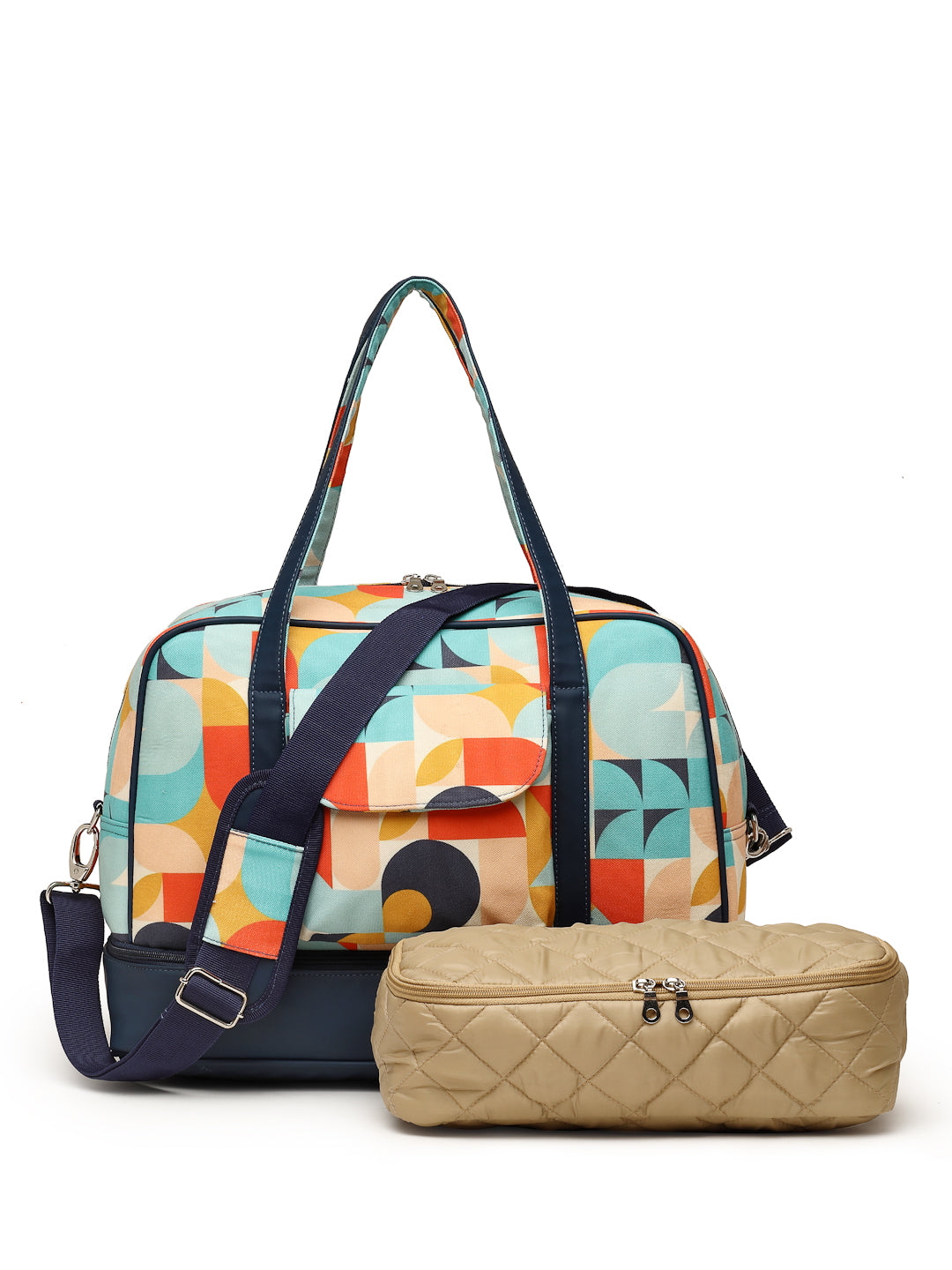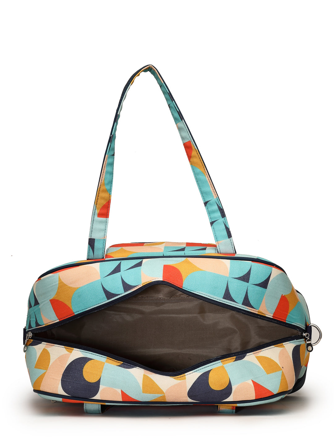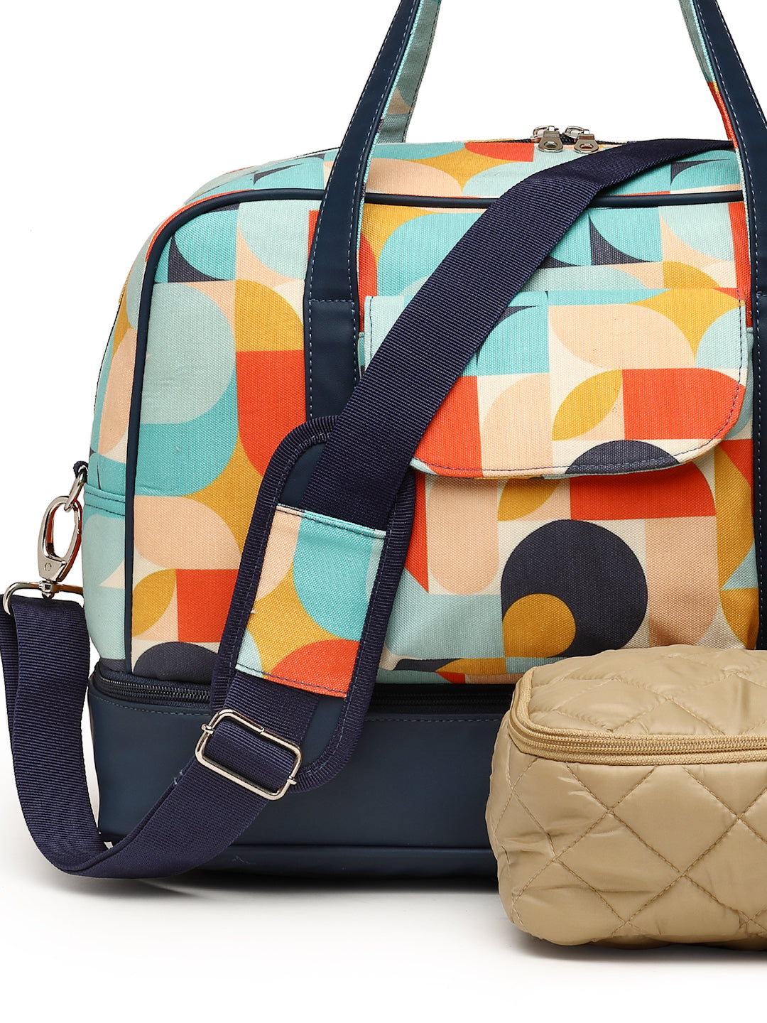 Navy & Multi Duffel Bag from Anekaant's Peppy Collection. Crafted with Polycotton Canvas & PU fabric, this Travel Bag features an Abstract Digital Printed Pattern. It has 1 main compartment secured with a Zipper closure. 1 Inner Zip Pocket, 1 External Zip Pocket & 1 External Patch Pocket. Has a special Zip Compartment at the bottom to carry Shoes etc. Has Two Handles as well as an Adjustable & Detachable Sling Strap for convenient carry options. Also includes a small Travel Pouch to organise your essentials. Has a back strap to conveniently affix & carry on top of a luggage trolley bag. Dimensions (LxHxW) : 43 x 31 x 18 cm